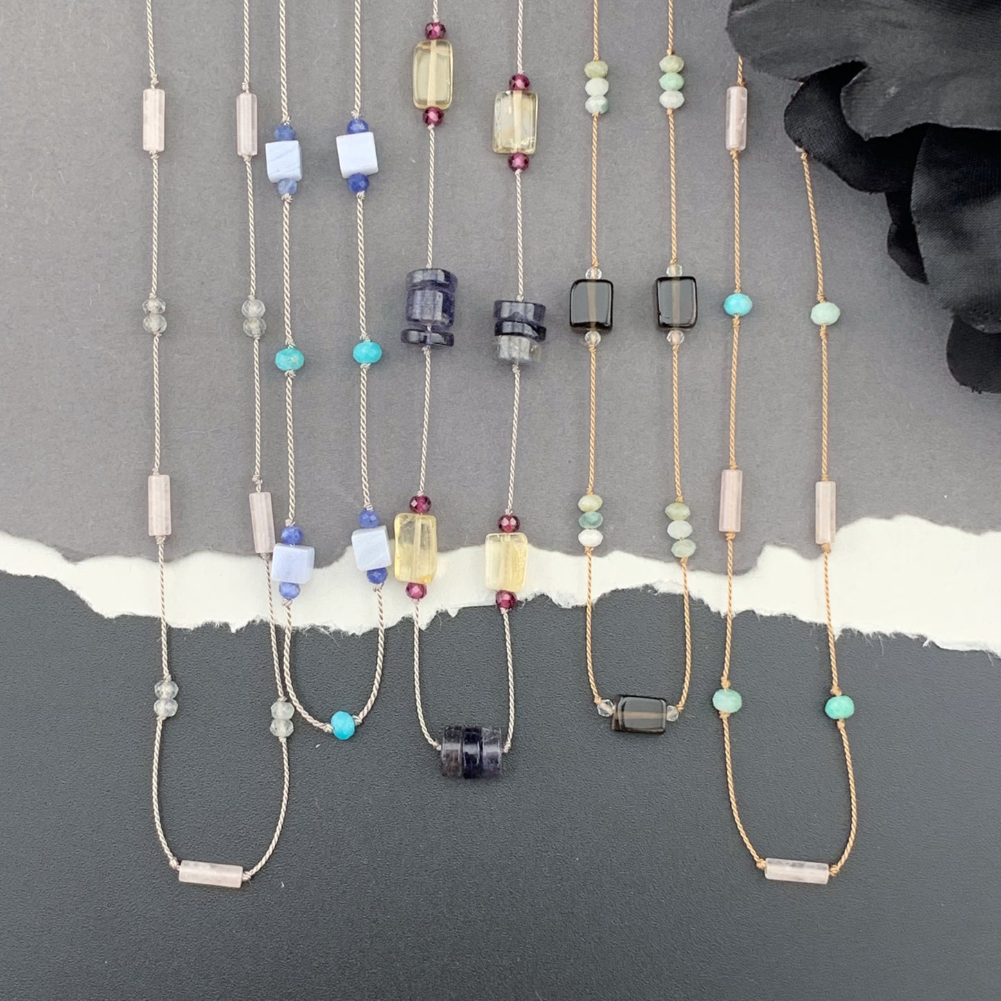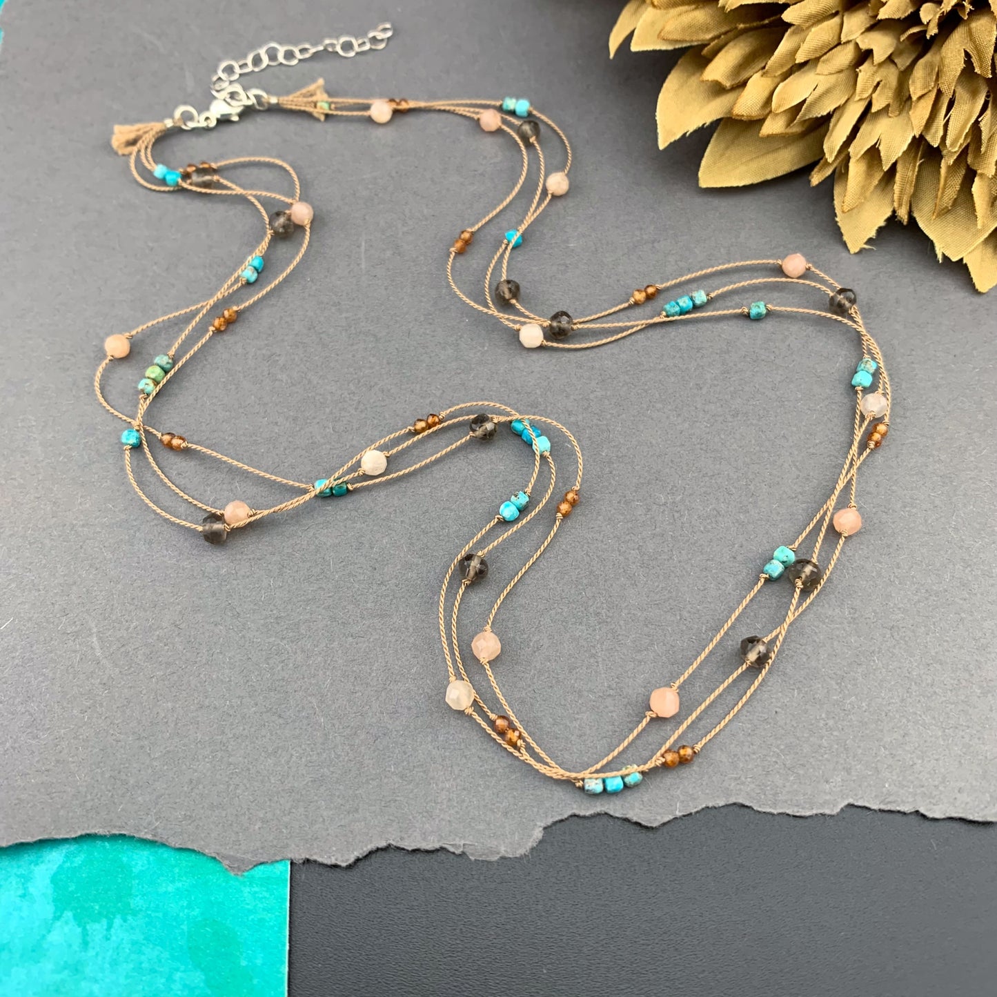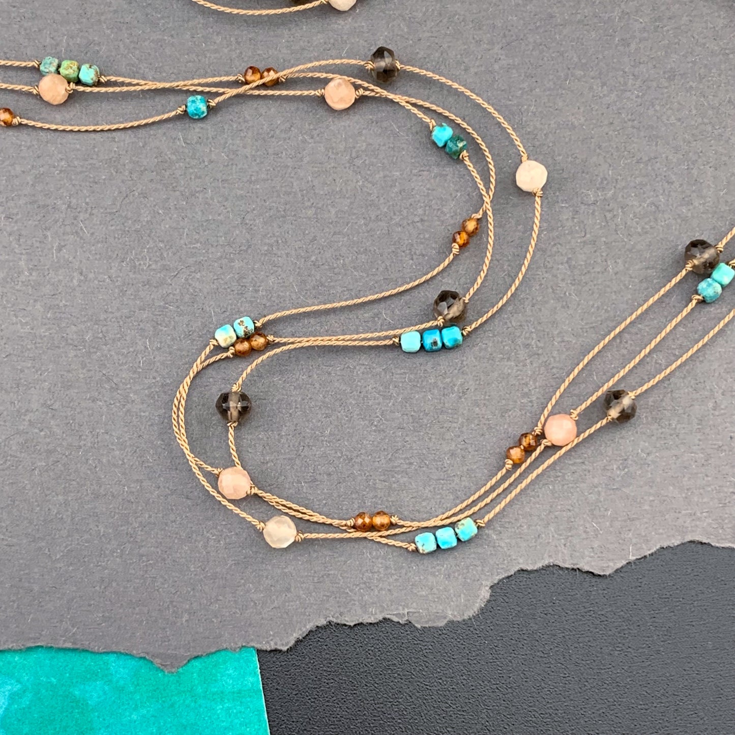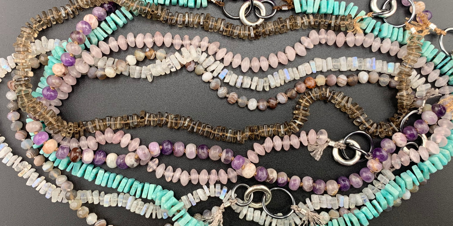Beautiful, naturally patterned smooth and faceted gemstones are hand knotted onto silk cord, providing a luxurious, supple drape. Perfect worn solo, fabulous for layering...