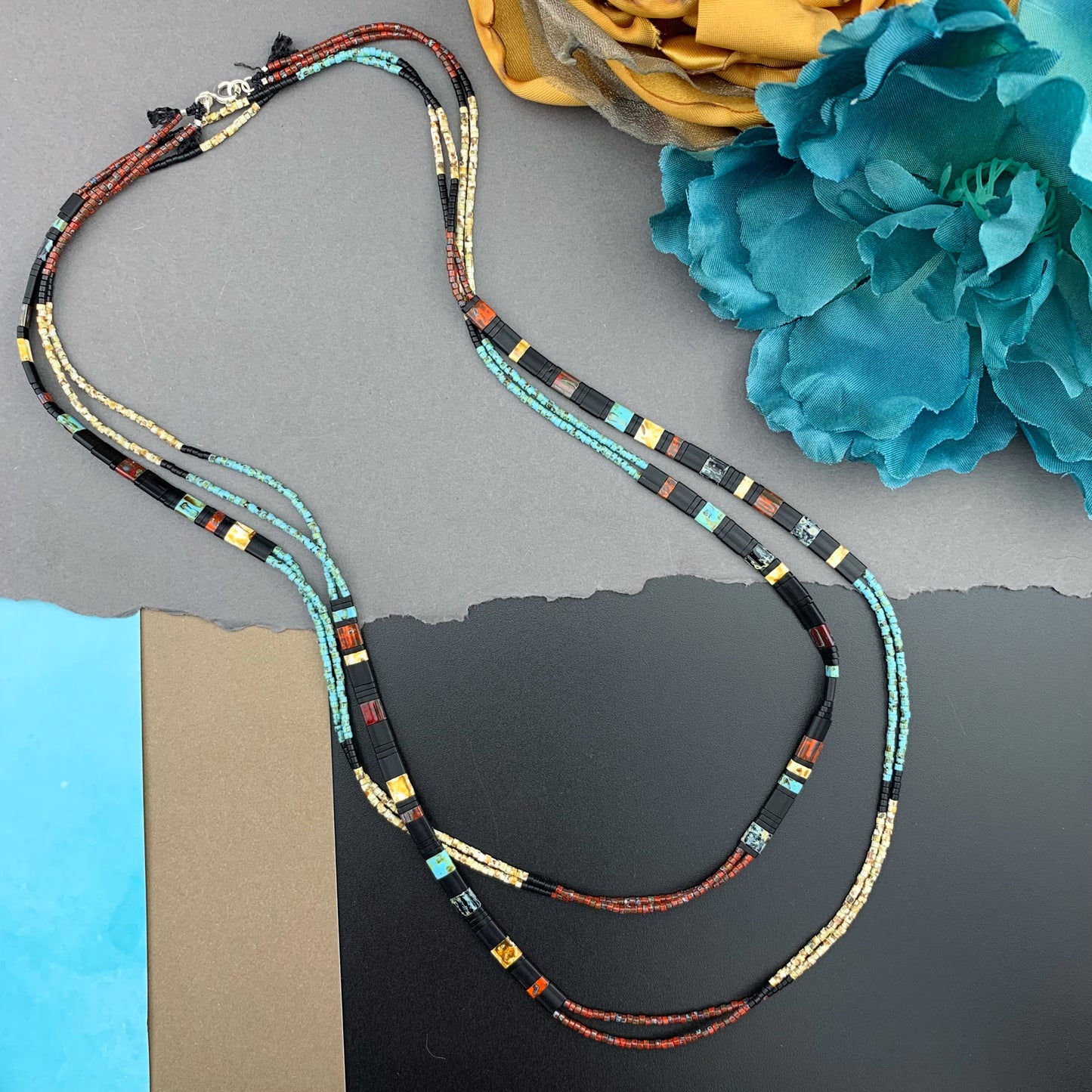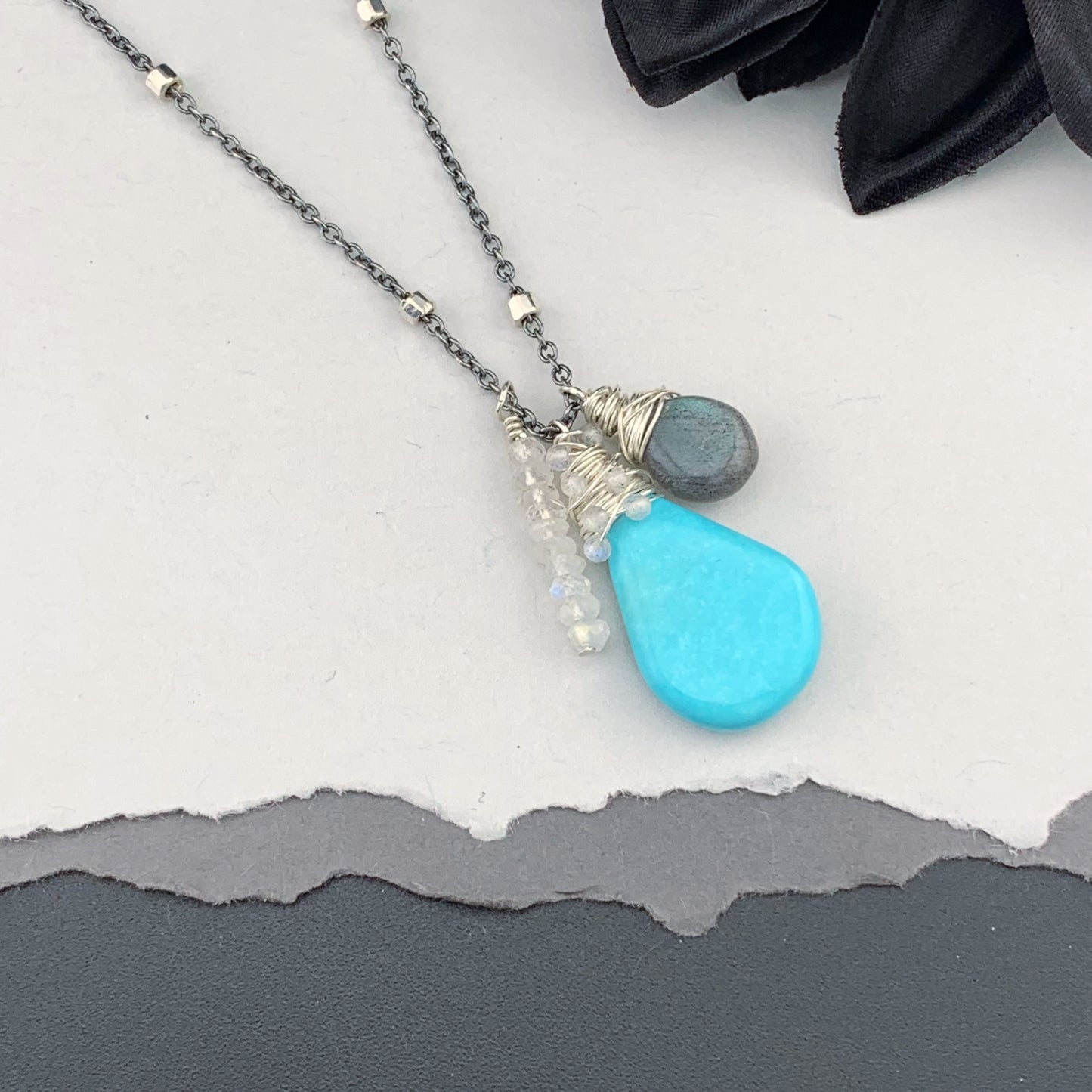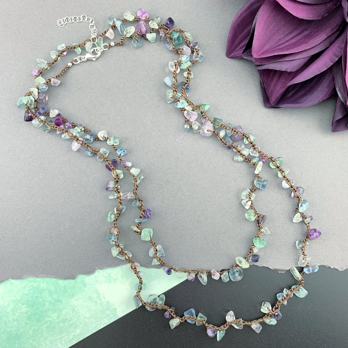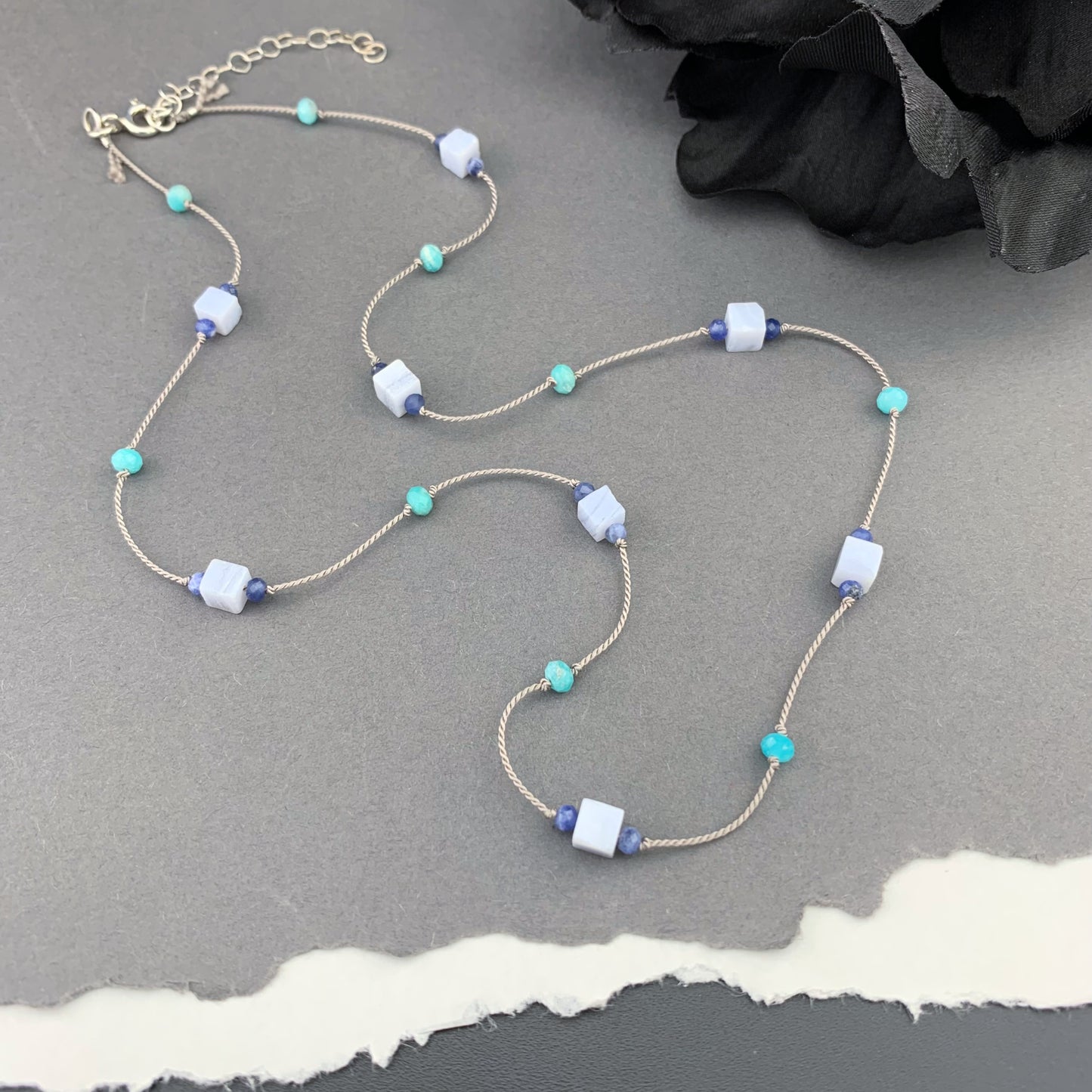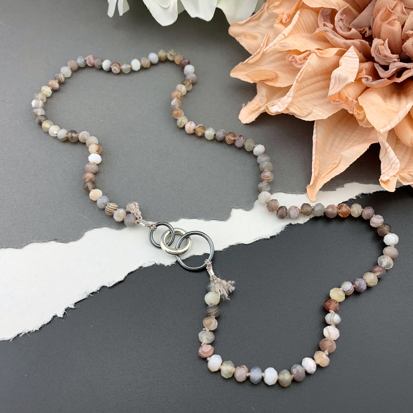 Beautiful, naturally patterned smooth and faceted gemstones are hand knotted onto silk cord, providing a luxurious, supple drape. Perfect worn solo, fabulous for layering...