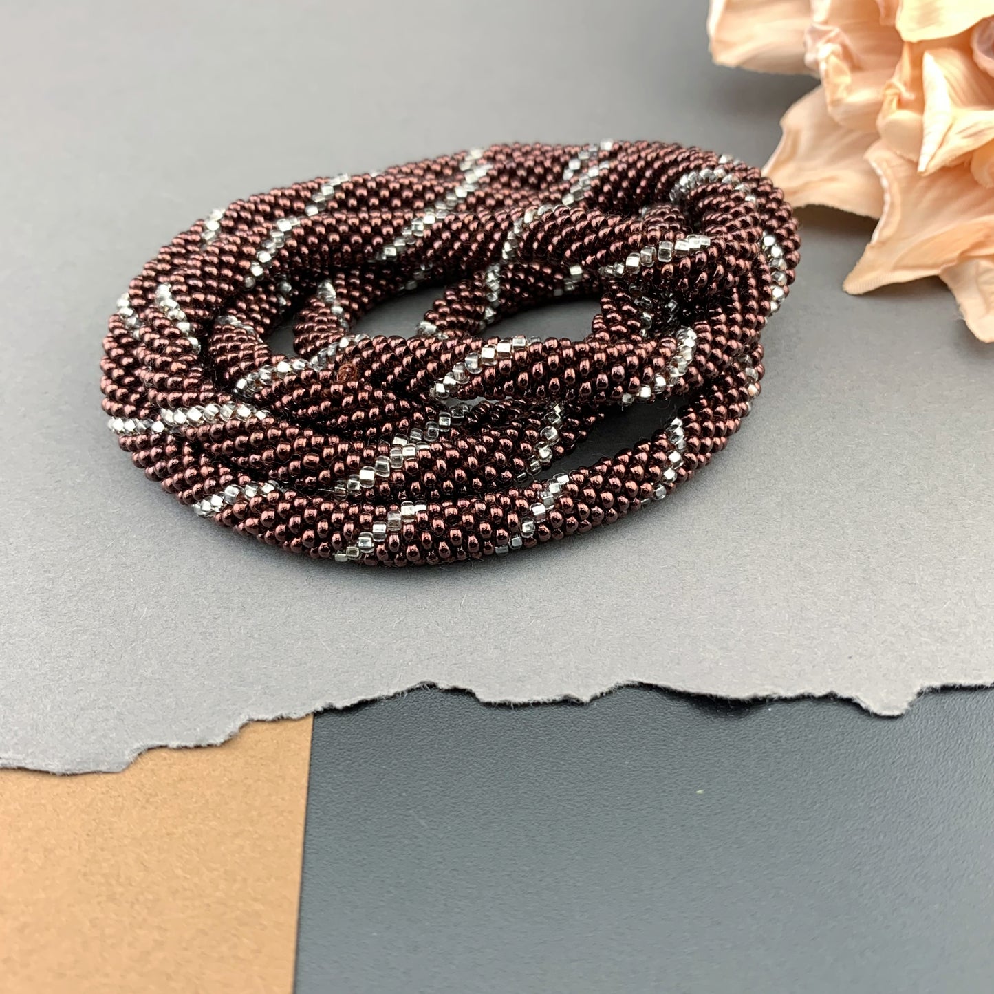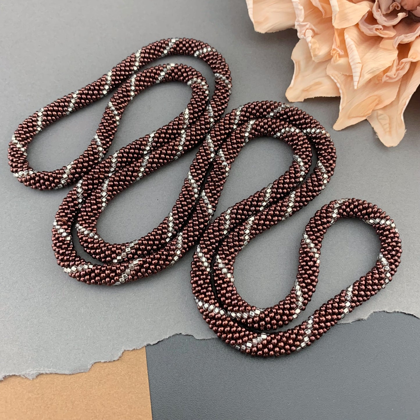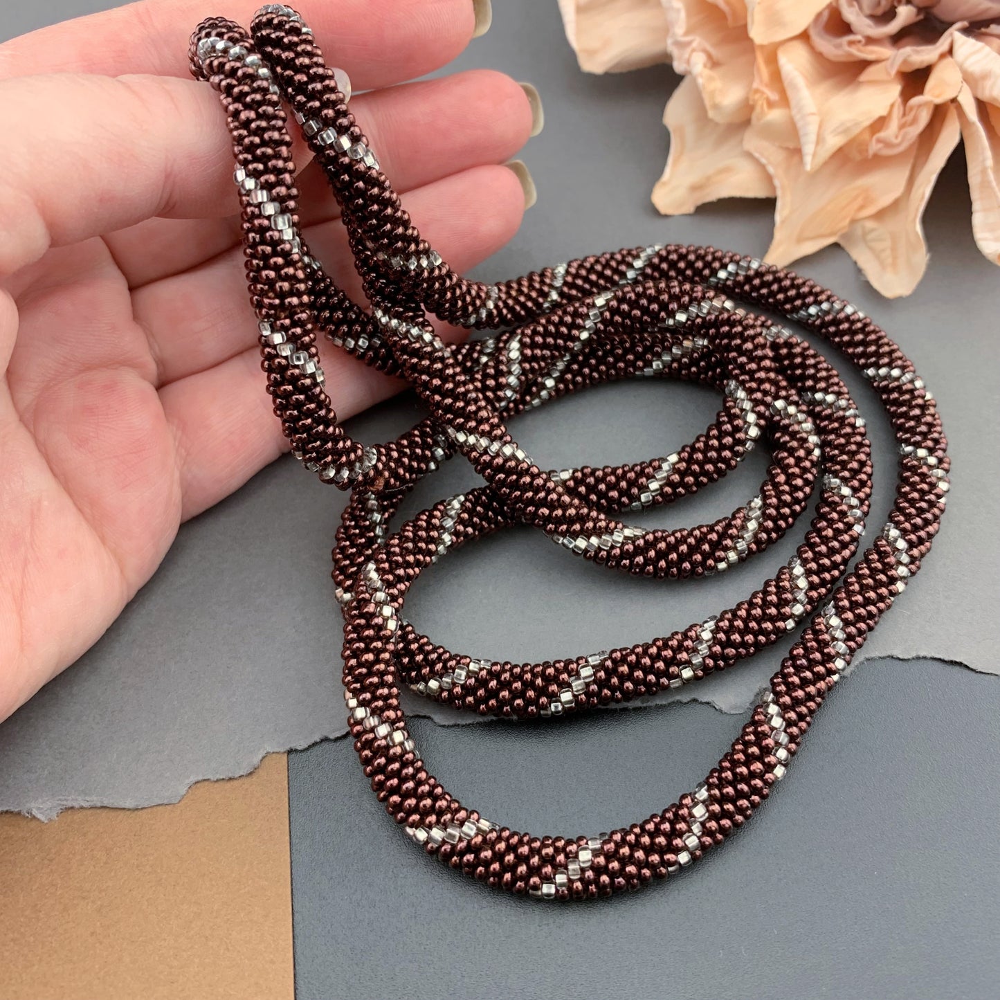 Soft, supple, luxurious beaded crochet rope necklace is hand crocheted with Czech glass 10/0 seed beads; silk dark copper brown and silver lined crystal in a spiral pattern. Ends are sewn together creating a "seamless join". They are continuous with no clasp. Beautiful heirloom pieces that will be passed on for generations!