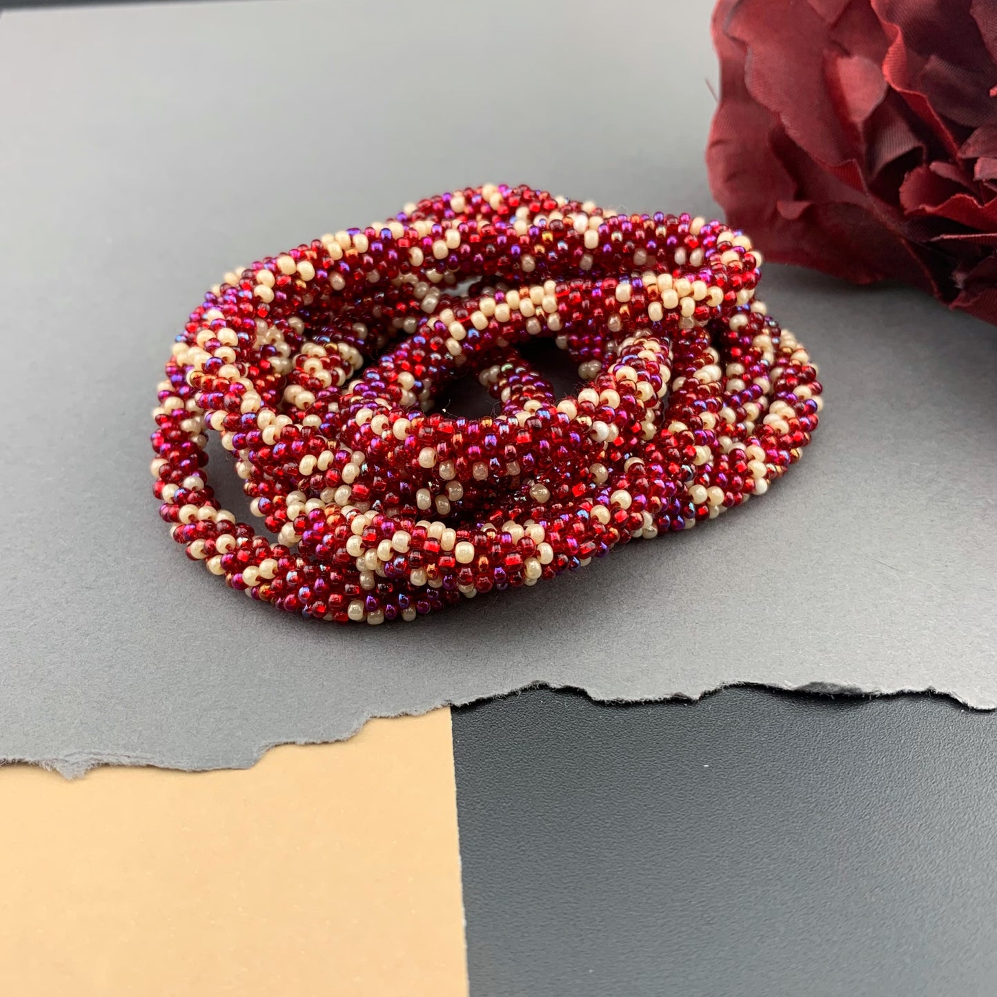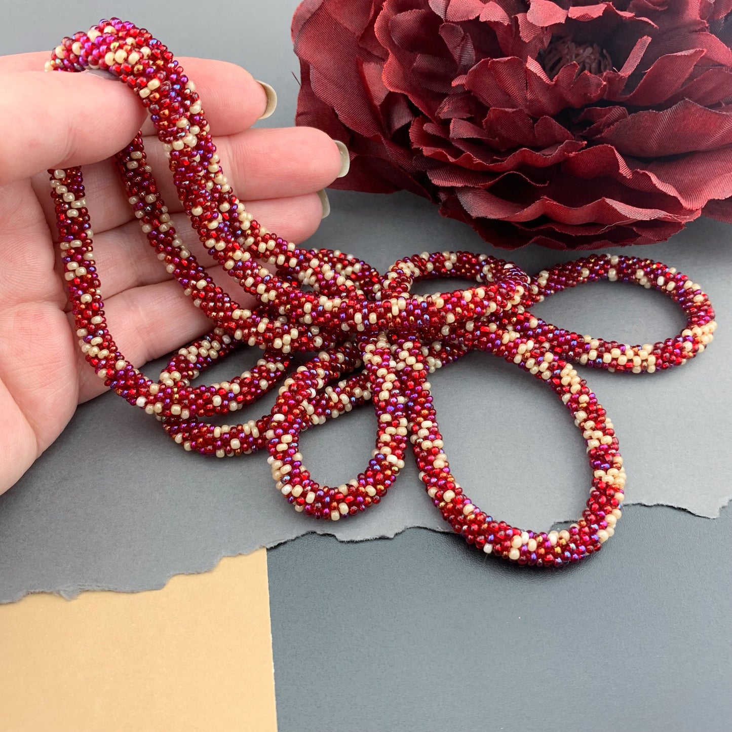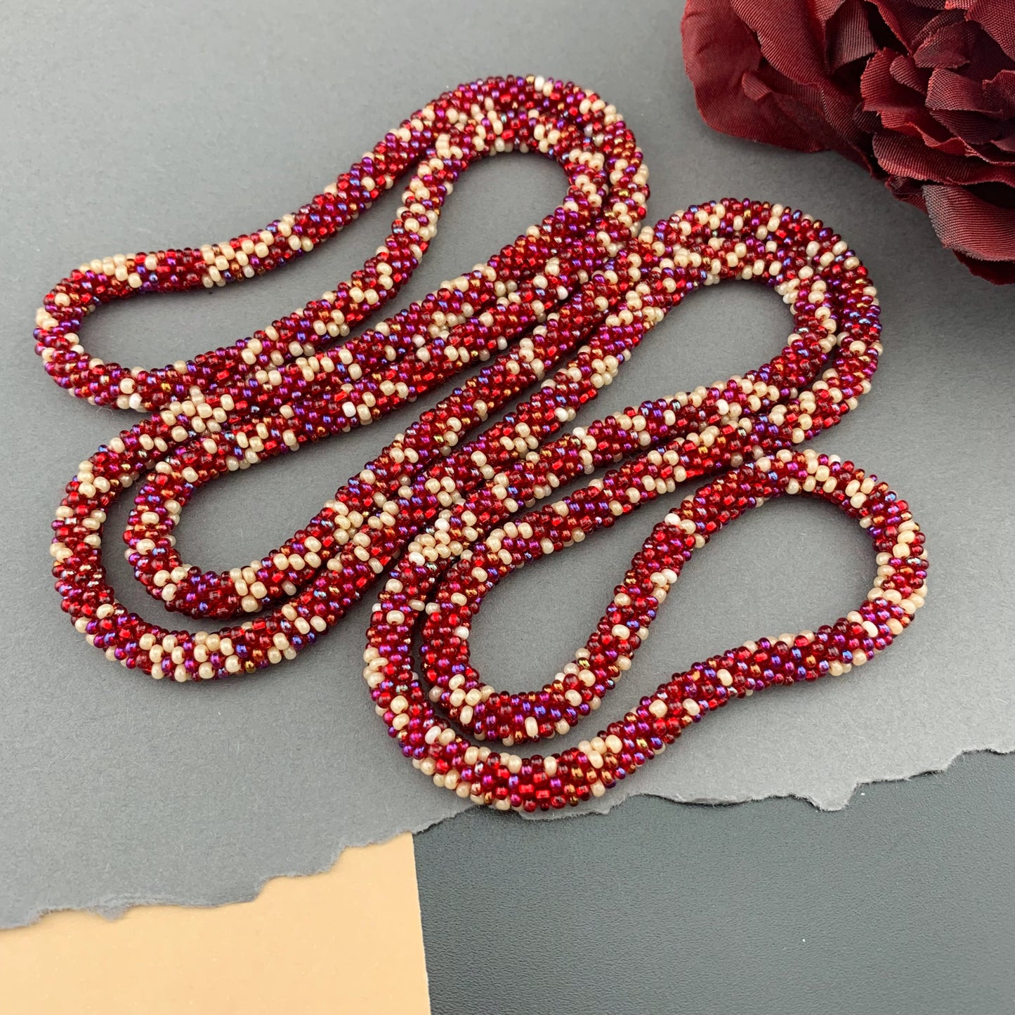 Soft, supple, luxurious beaded crochet rope necklace is hand crocheted with Czech glass 10/0 seed beads; a mix of shimmering reds and cream in an abstract pattern. Ends are sewn together creating a "seamless join". They are continuous with no clasp. Beautiful heirloom pieces that will be passed on for generations!
