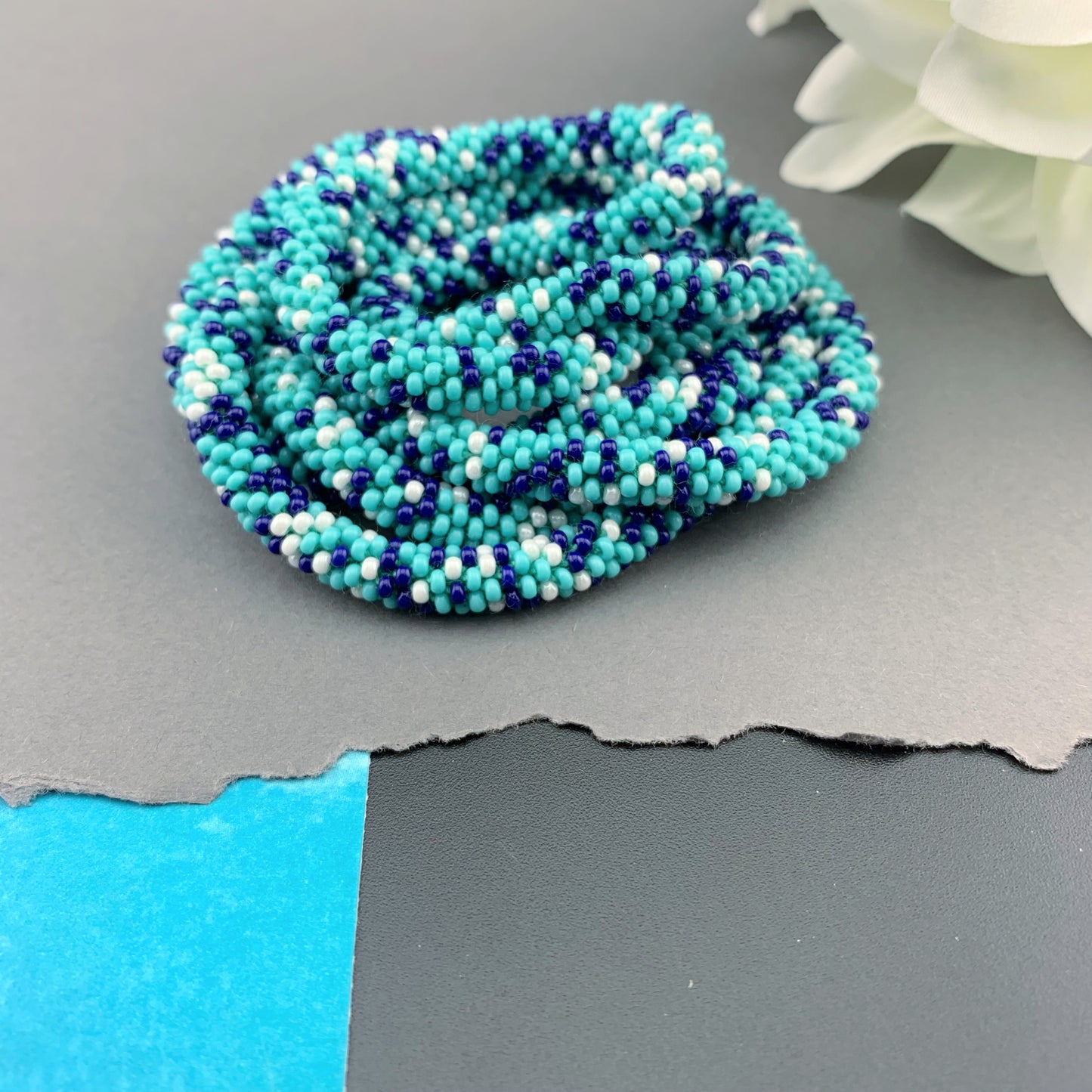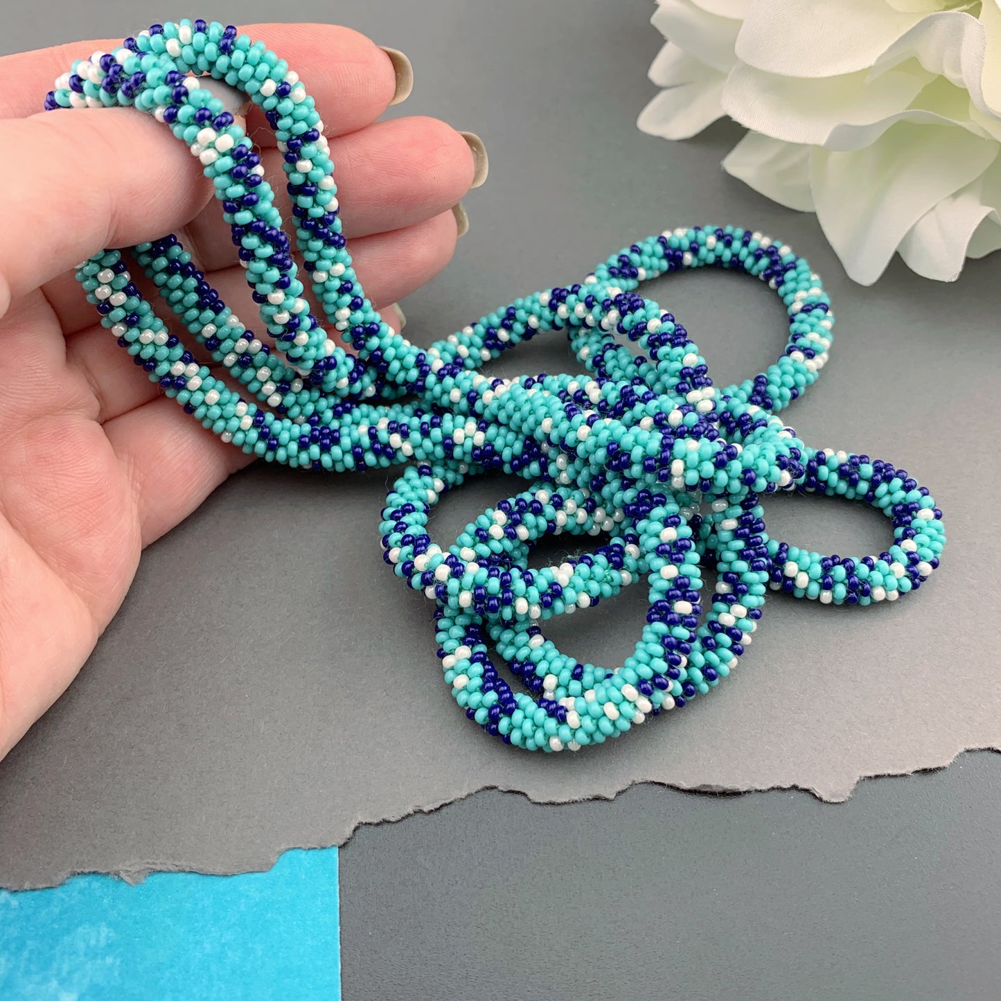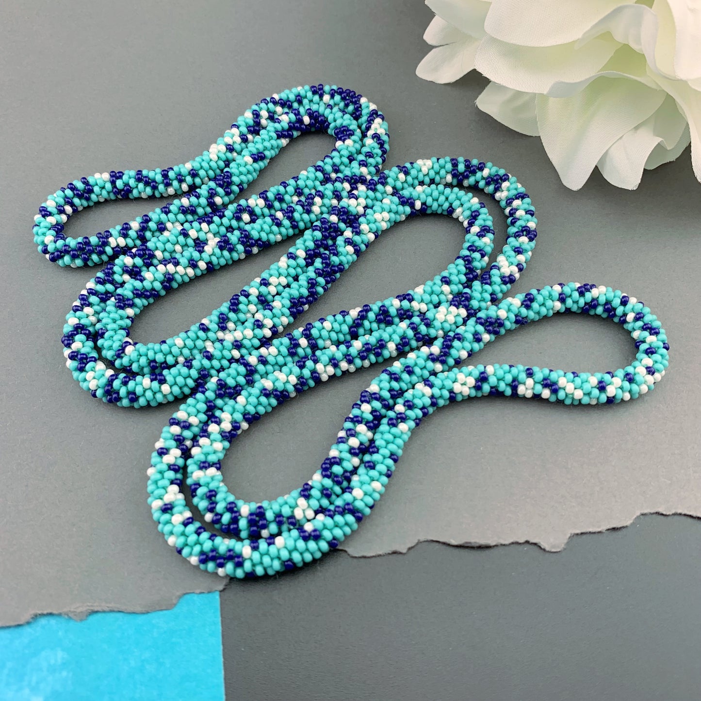 Soft, supple, luxurious beaded crochet rope necklace is hand crocheted with Czech glass 10/0 seed beads; a mix of turquoise, navy blue and white in an abstract pattern. Ends are sewn together creating a "seamless join". They are continuous with no clasp. Beautiful heirloom pieces that will be passed on for generations!