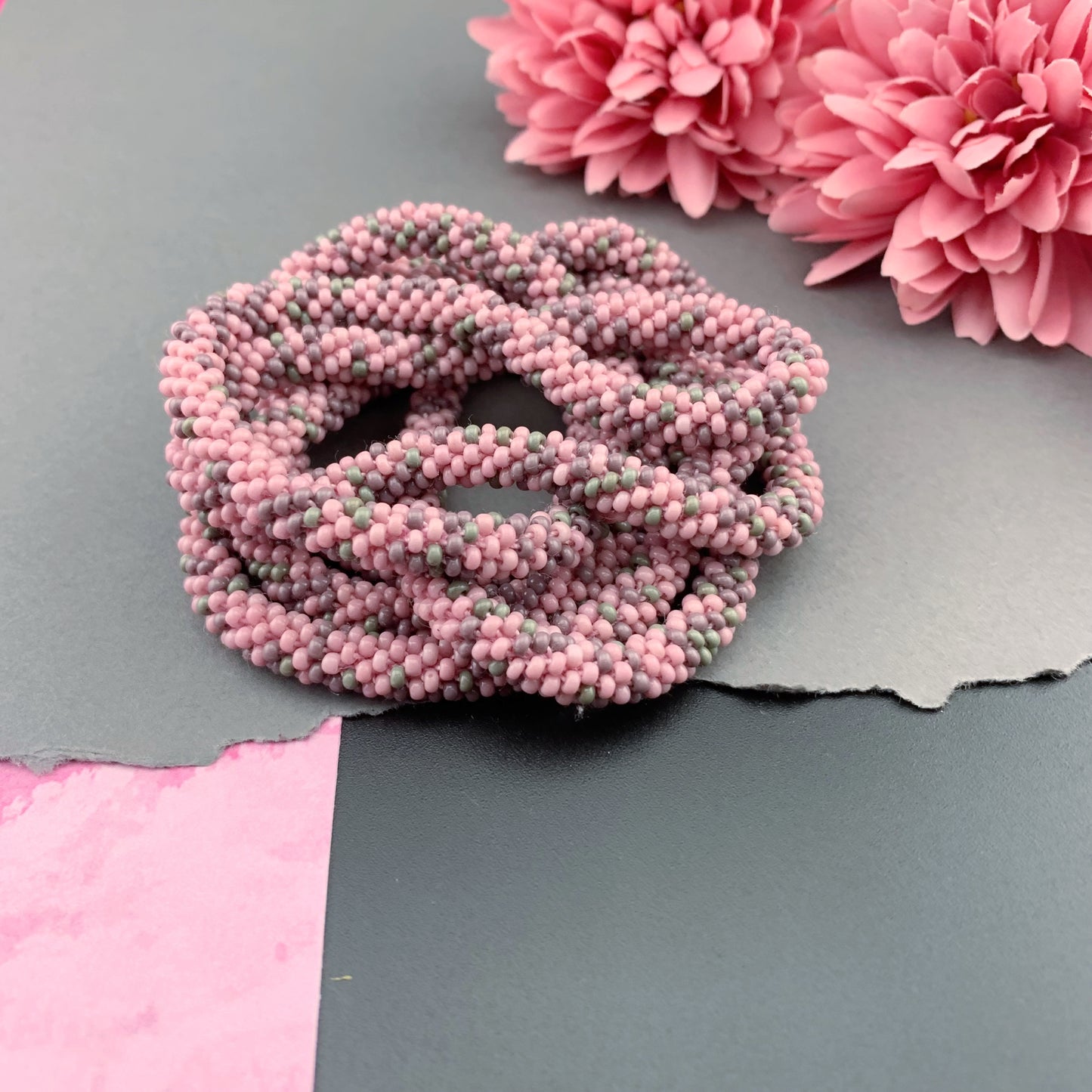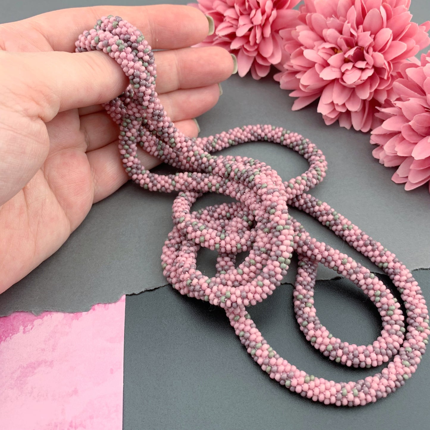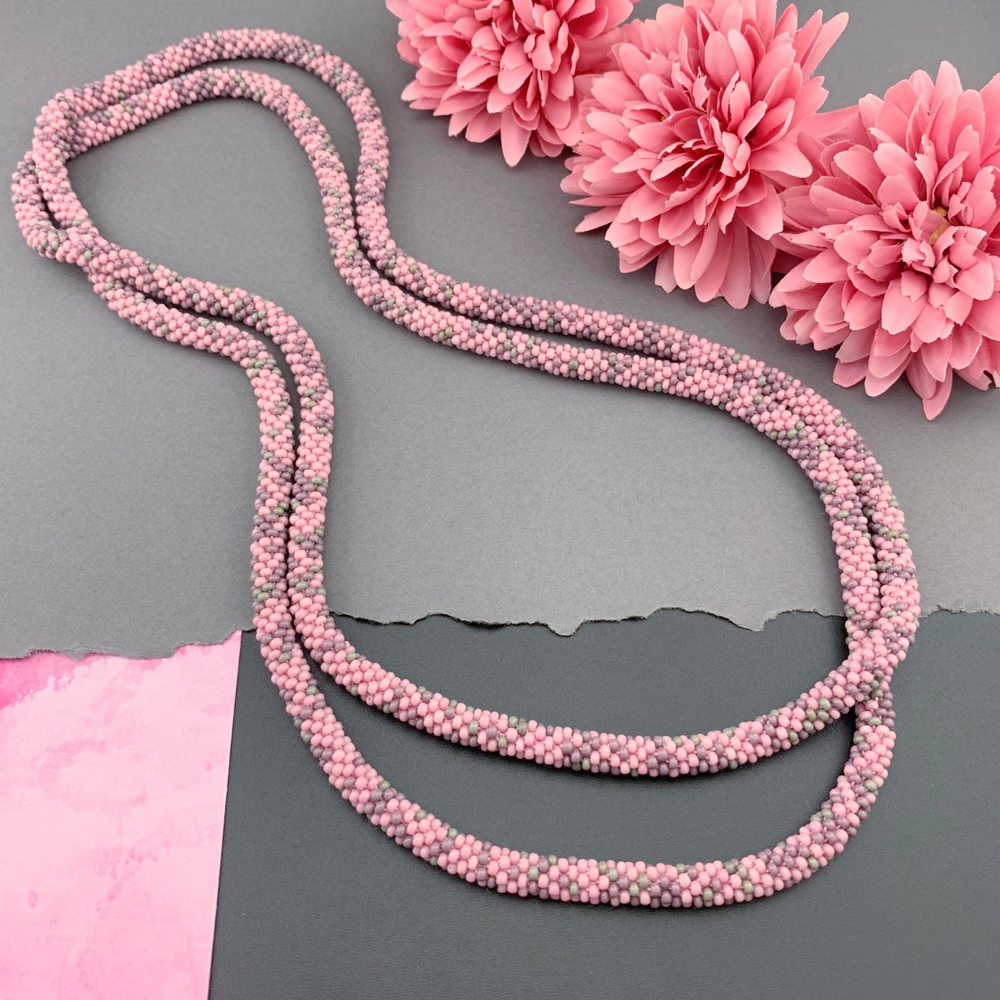 Soft, supple, luxurious beaded crochet rope necklace is hand crocheted with Czech glass 10/0 seed beads; rose pink, mauve purple and grey in an abstract pattern. Ends are sewn together creating a "seamless join". They are continuous with no clasp. Beautiful heirloom pieces that will be passed on for generations!