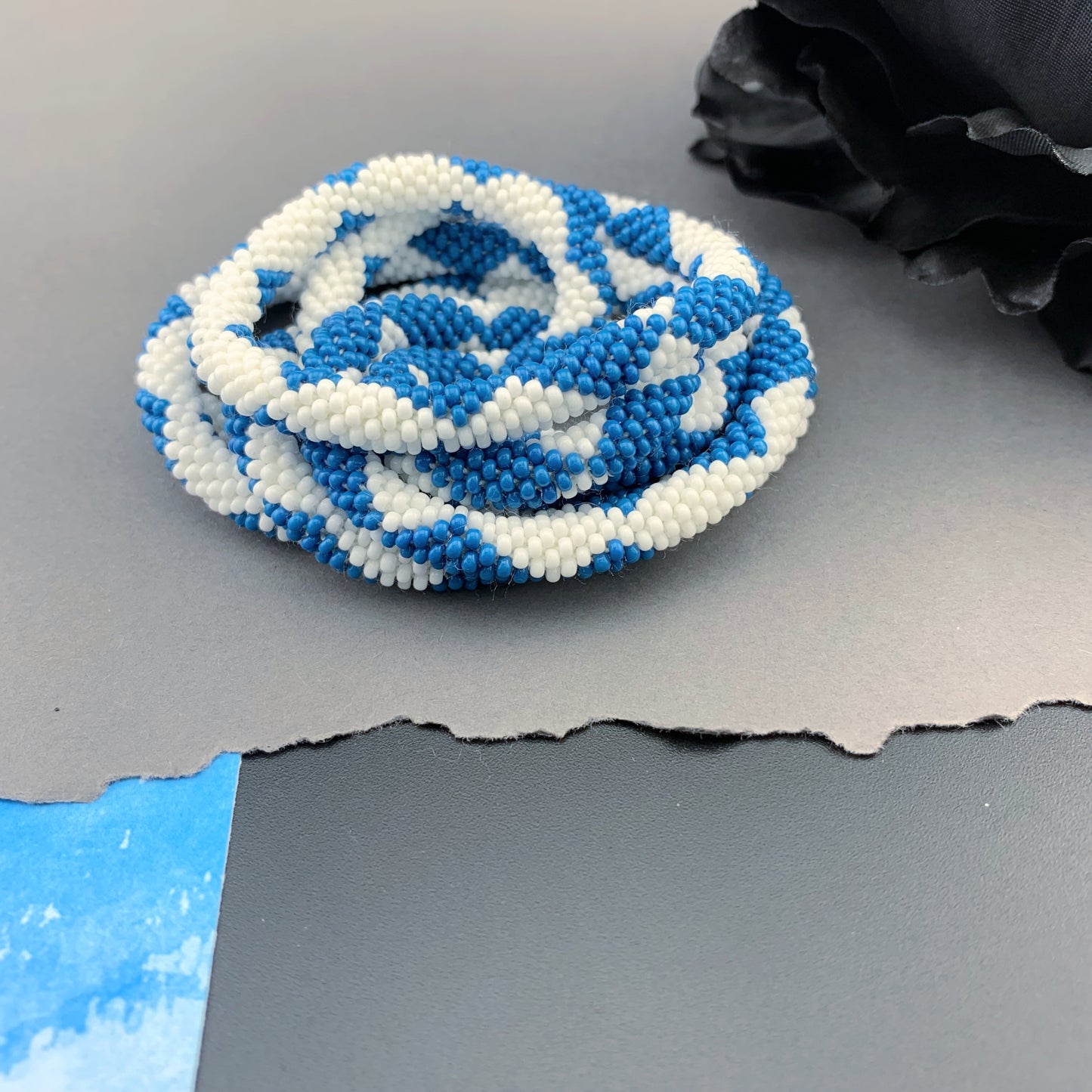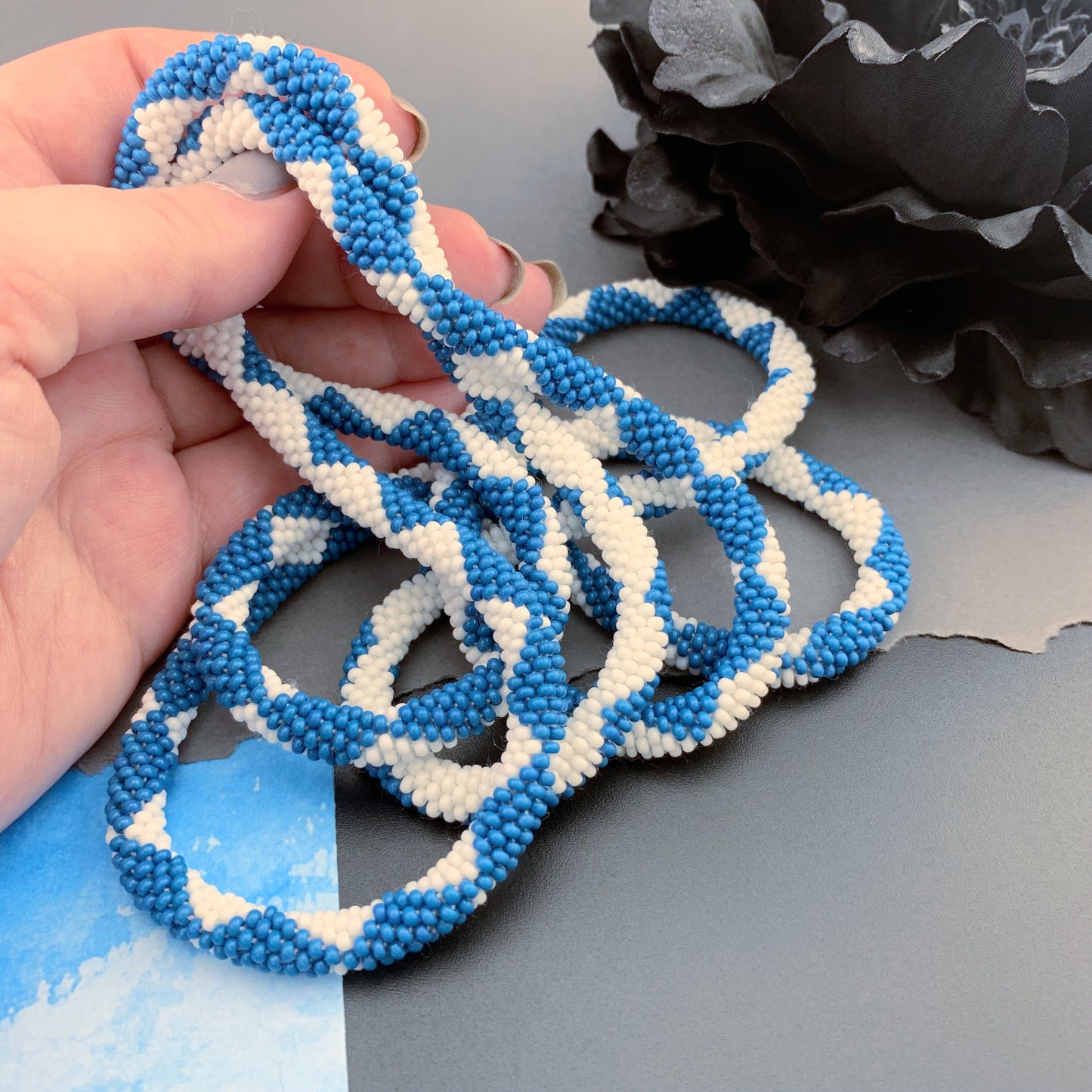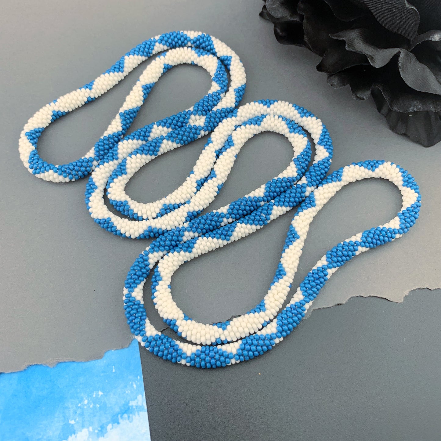 Soft, supple, luxurious beaded crochet rope necklace is hand crocheted with Czech glass 10/0 seed beads; denim blue and white in a diamond pattern. Ends are sewn together creating a "seamless join". They are continuous with no clasp. Beautiful heirloom pieces that will be passed on for generations!