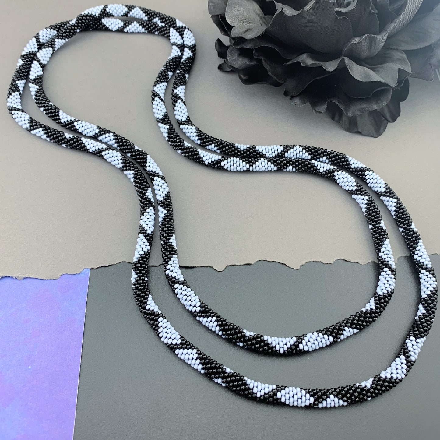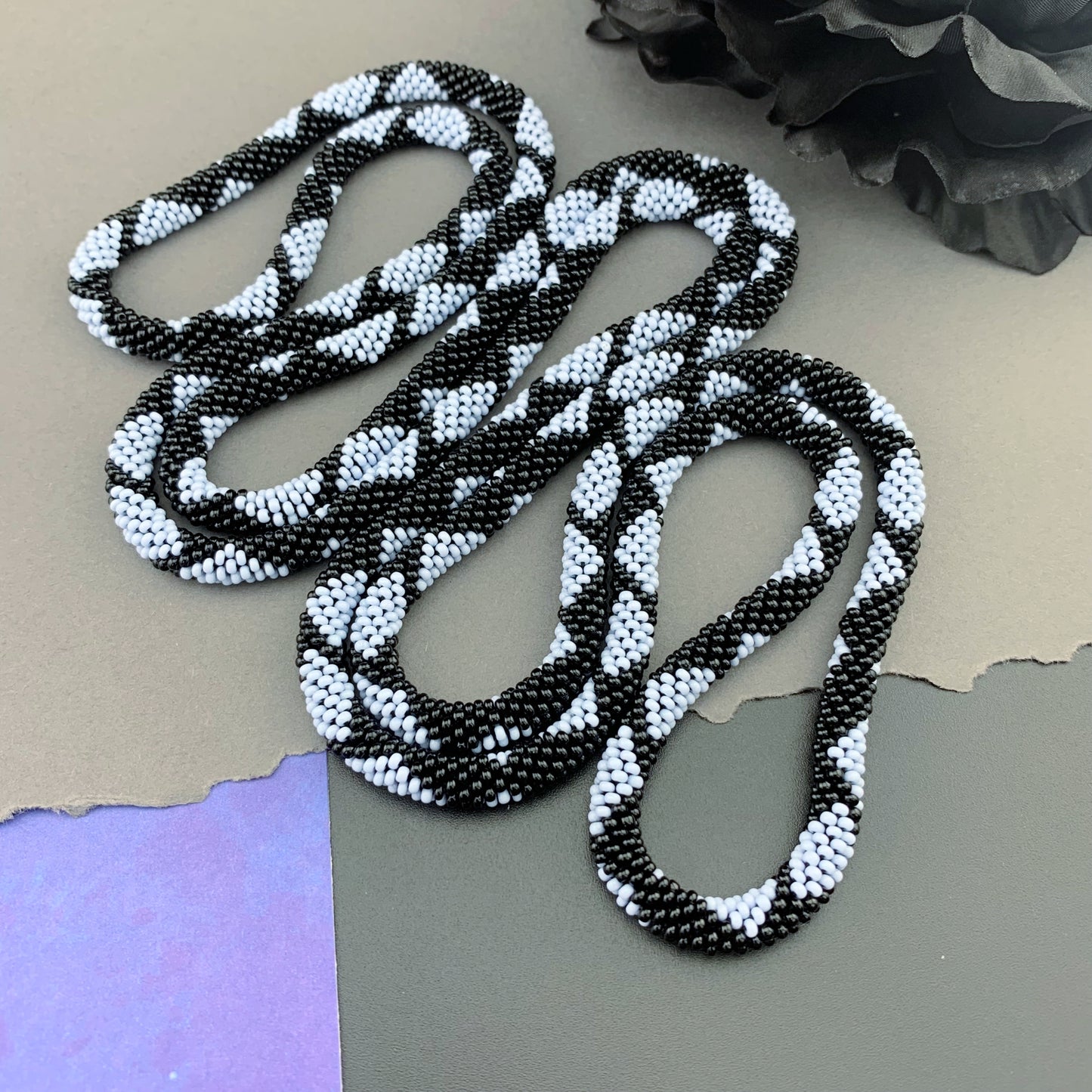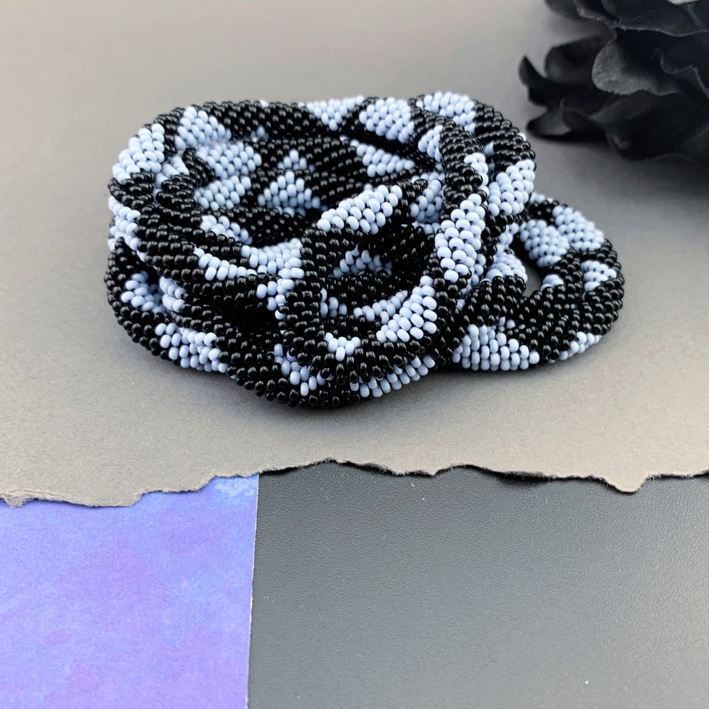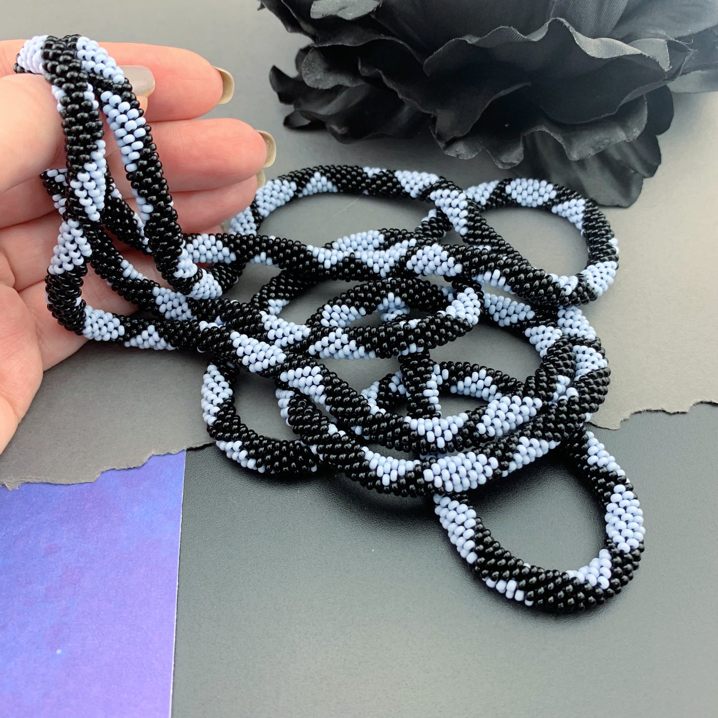 Soft, supple, luxurious beaded crochet rope necklace is hand crocheted with Czech glass 10/0 seed beads; shiny black and pale powder blue in a diamond pattern. Ends are sewn together creating a "seamless join". They are continuous with no clasp. Beautiful heirloom pieces that will be passed on for generations!