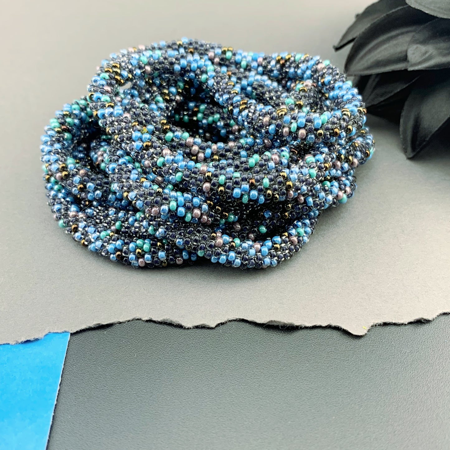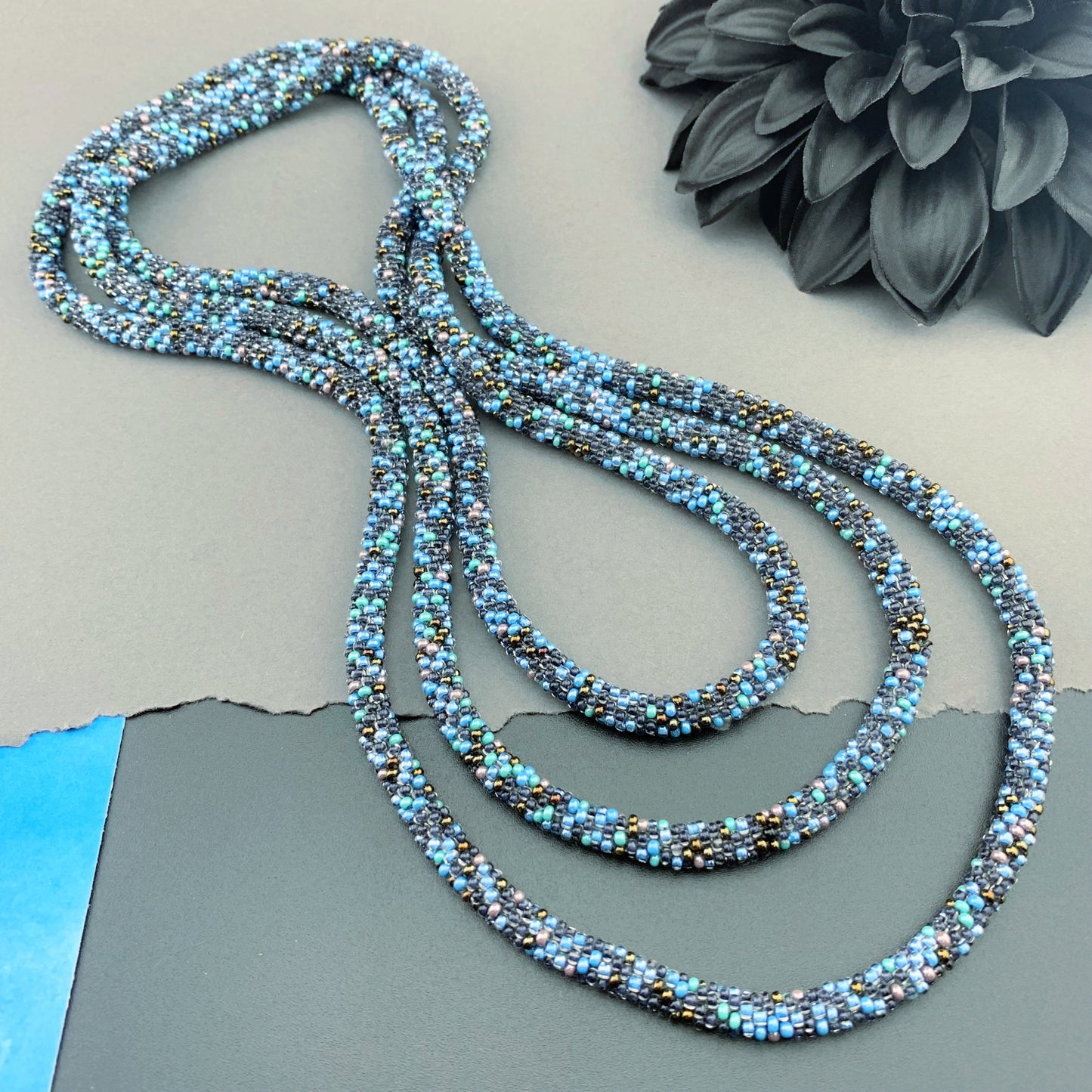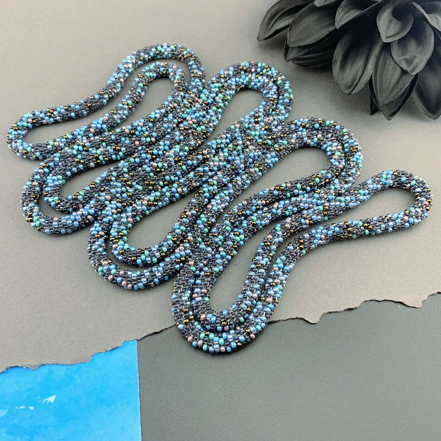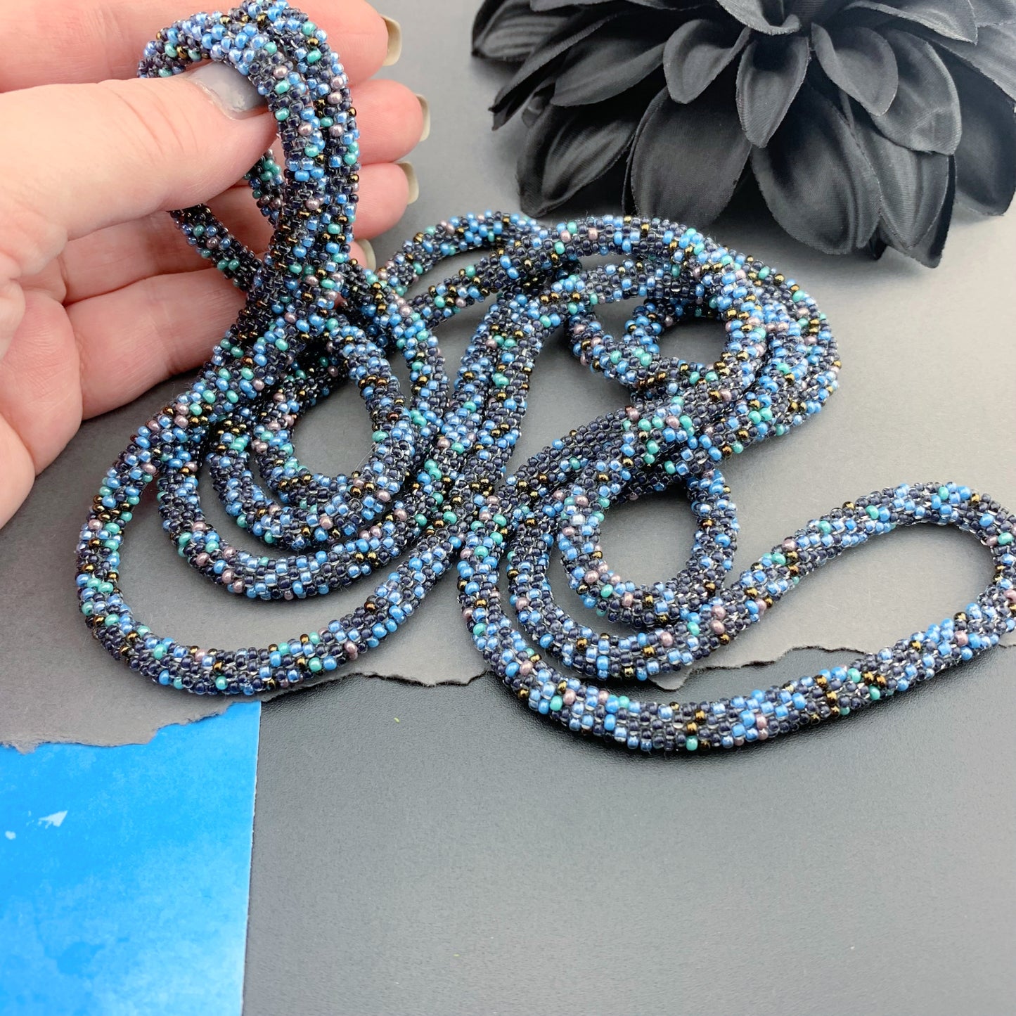 Soft, supple, luxurious beaded crochet rope necklace is hand crocheted with Czech glass 10/0 seed beads; a mix of shimmering black, blue, turquoise and mauve in an abstract pattern. Ends are sewn together creating a "seamless join". They are continuous with no clasp. Beautiful heirloom pieces that will be passed on for generations!