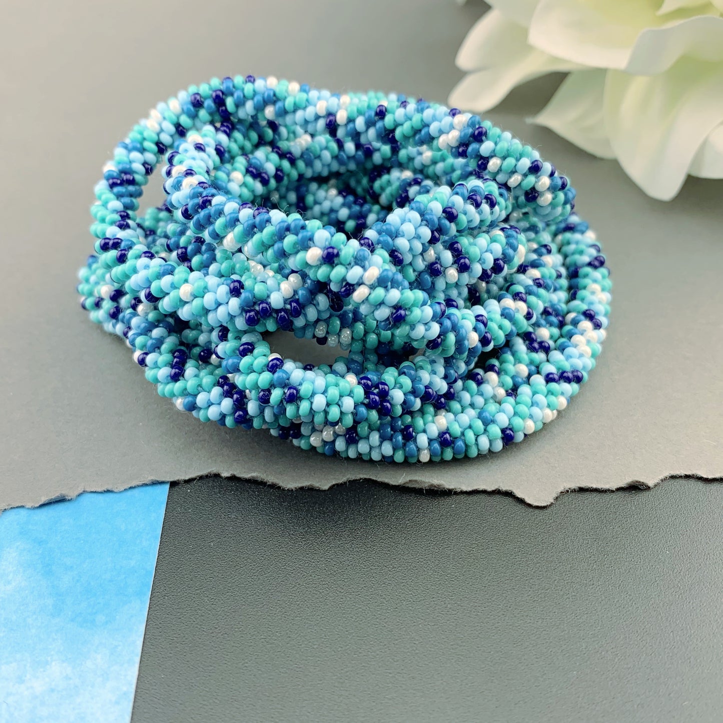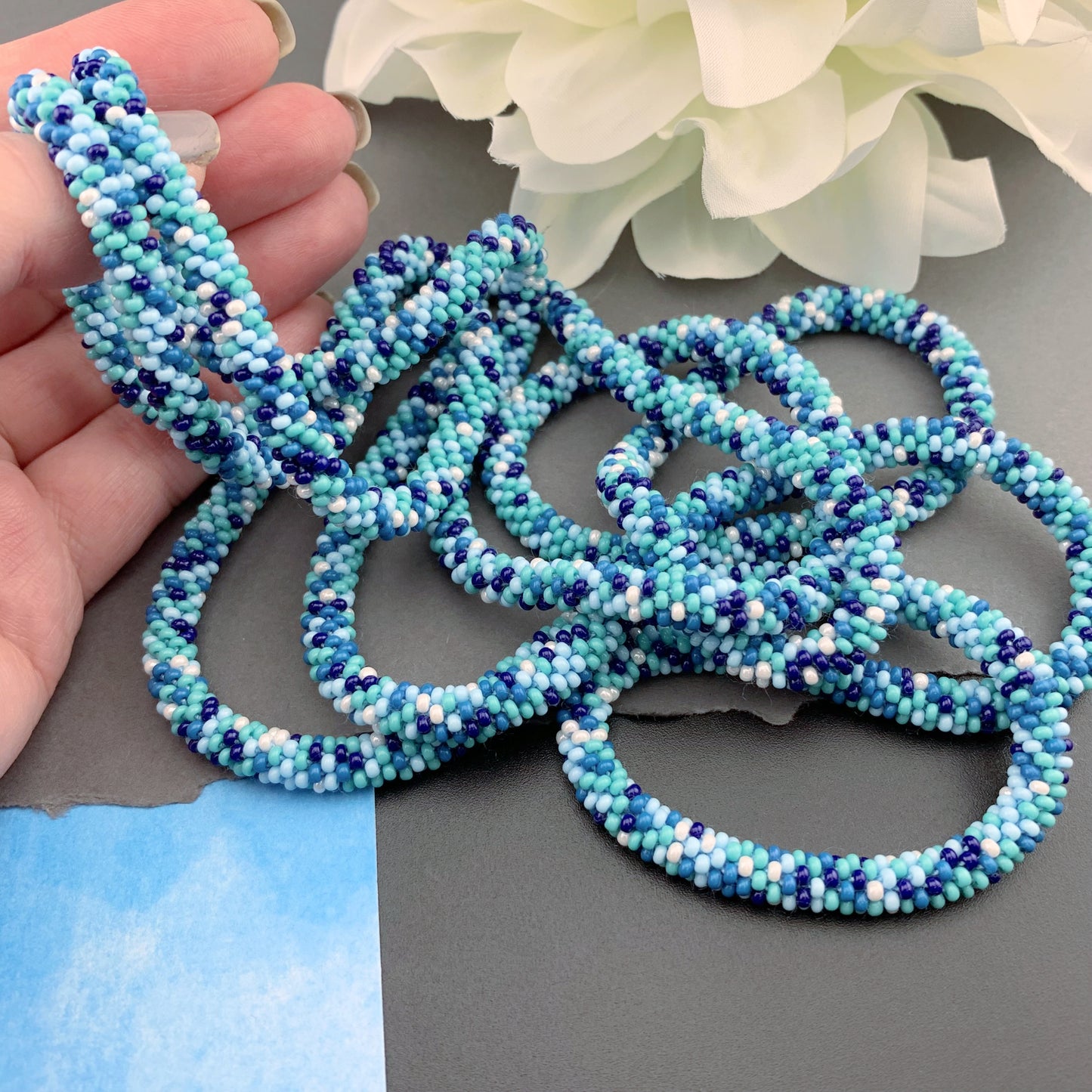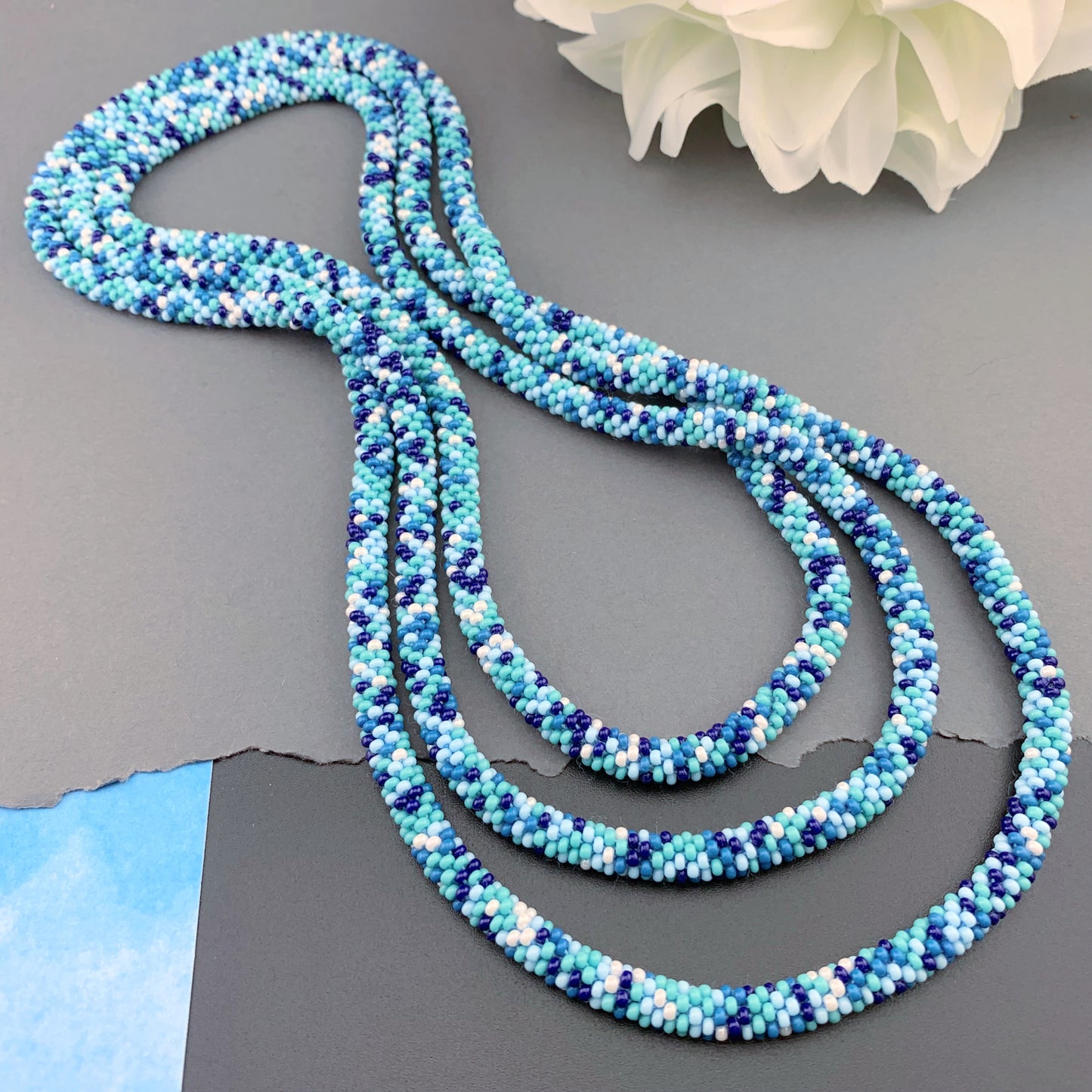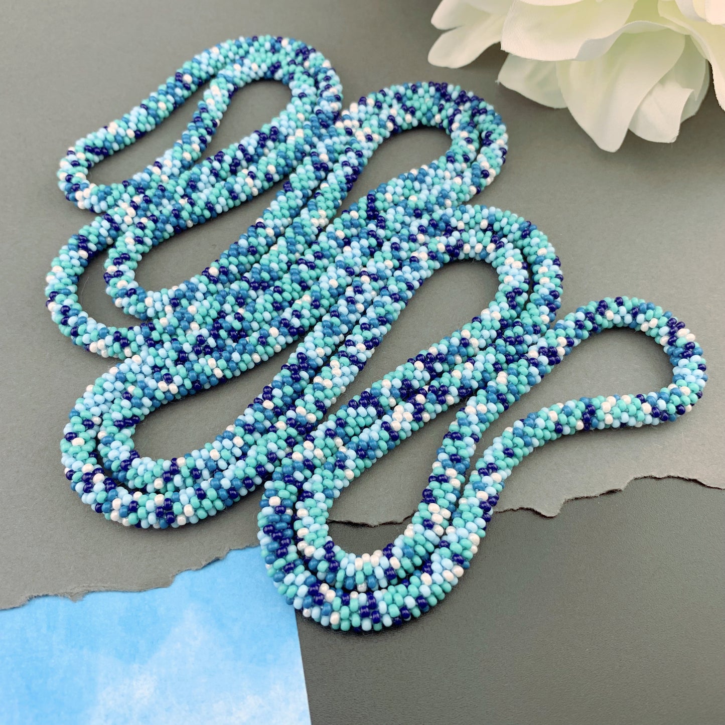 Soft, supple, luxurious beaded crochet rope necklace is hand crocheted with Czech glass 10/0 seed beads; a mix of turquoise, navy blue, denim blue, sky blue and white in an abstract pattern. Ends are sewn together creating a "seamless join". They are continuous with no clasp. Beautiful heirloom pieces that will be passed on for generations!