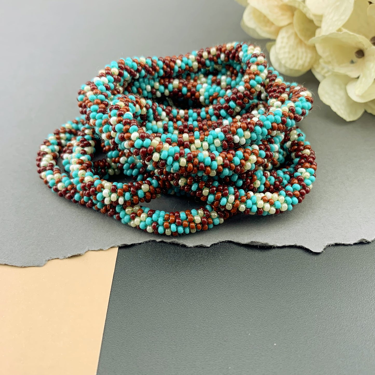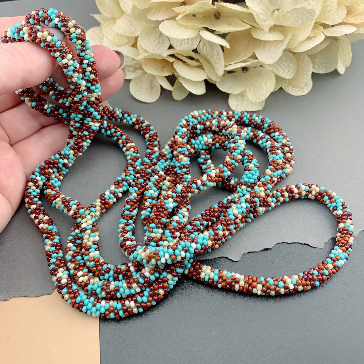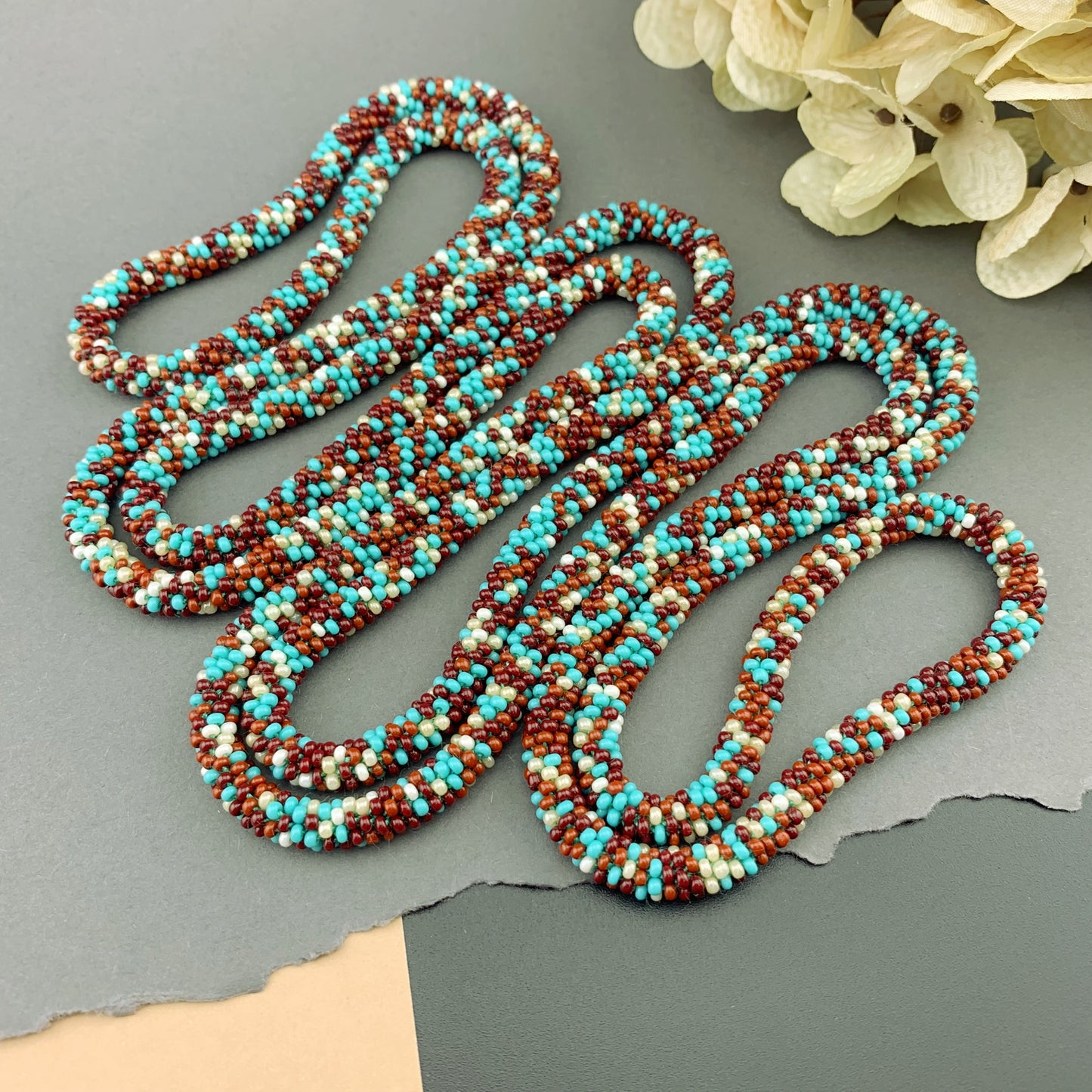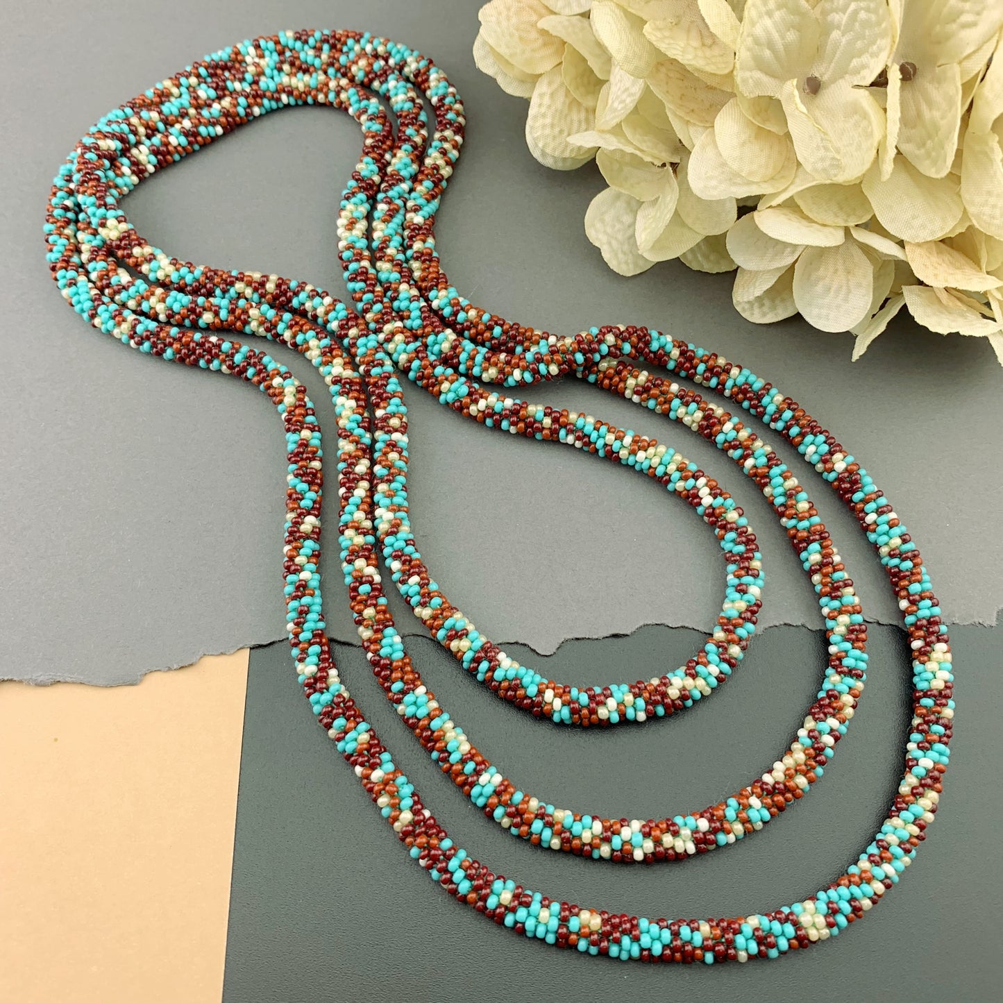 Soft, supple, luxurious beaded crochet rope necklace is hand crocheted with Czech glass 10/0 seed beads; a mix of turquoise, eggshell, cream, brown and chocolate in an abstract pattern. Ends are sewn together creating a "seamless join". They are continuous with no clasp. Beautiful heirloom pieces that will be passed on for generations!