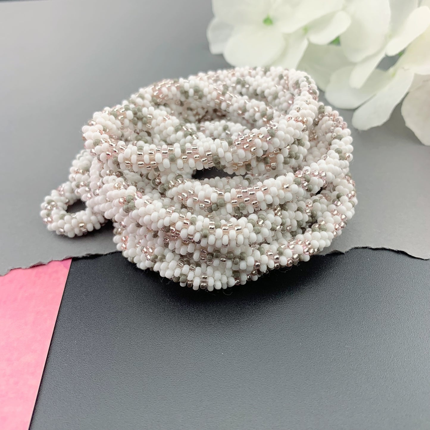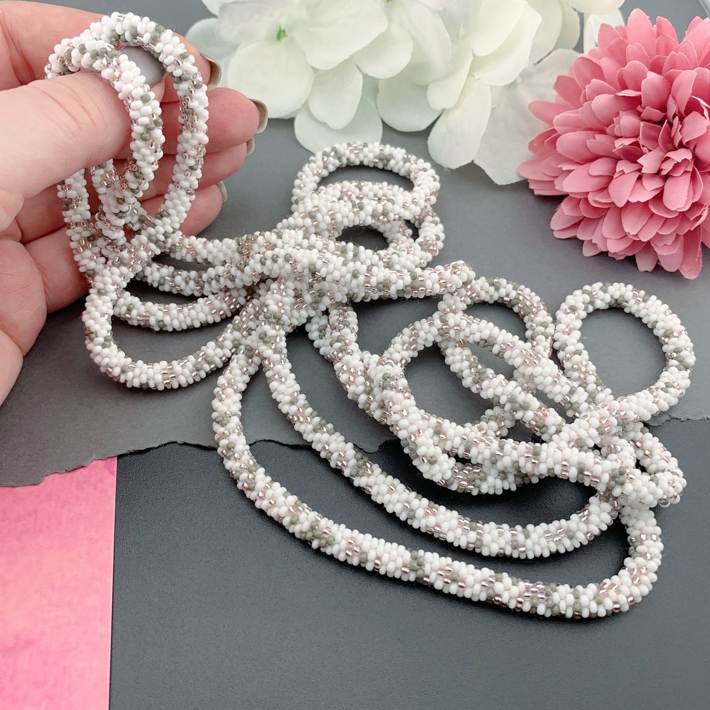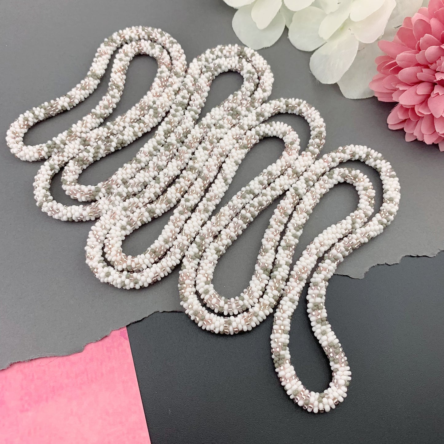 Soft, supple, luxurious beaded crochet rope necklace is hand crocheted with Czech glass 10/0 seed beads; a mix of white, grey and sparkling baby pink in an abstract pattern. Ends are sewn together creating a "seamless join". They are continuous with no clasp. Beautiful heirloom pieces that will be passed on for generations!