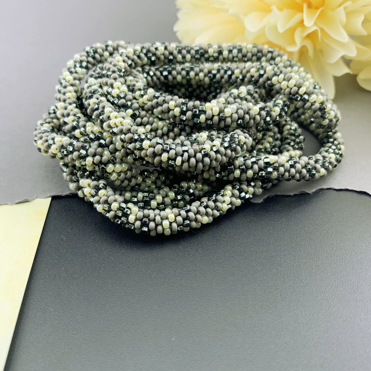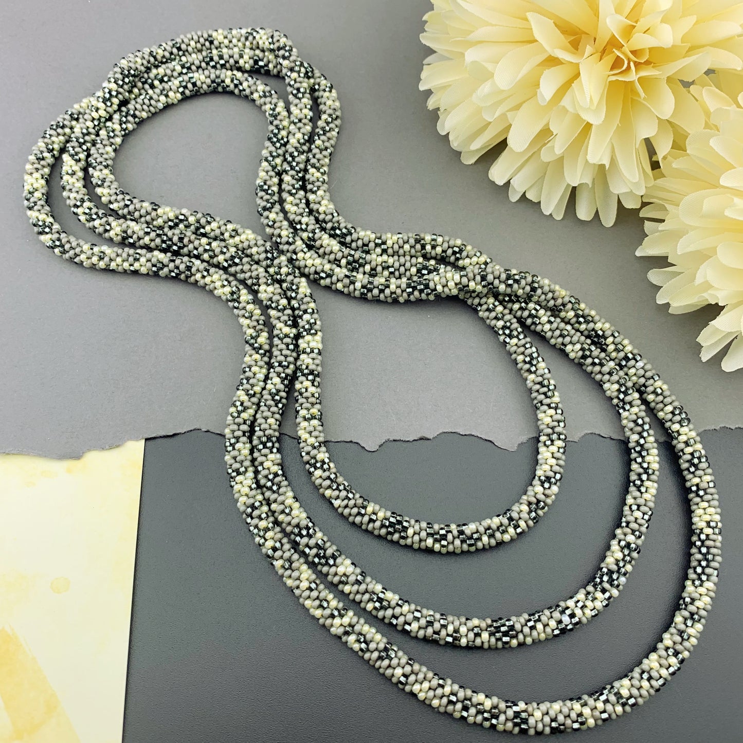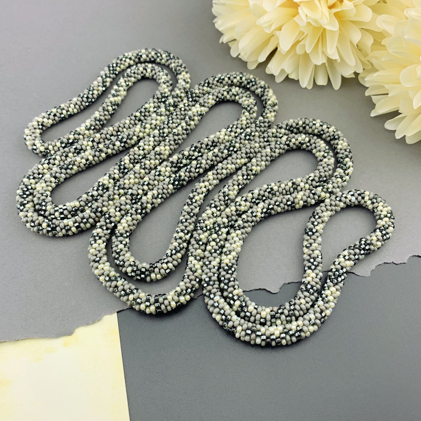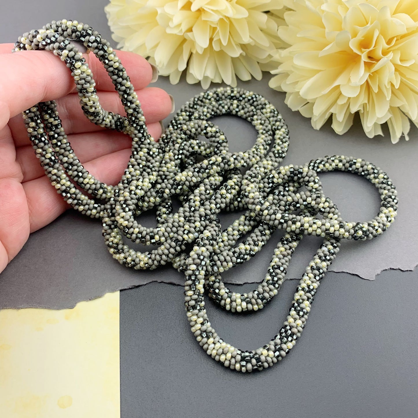 Soft, supple, luxurious beaded crochet rope necklace is hand crocheted with Czech glass 10/0 seed beads; a mix of greys and soft yellow in an abstract pattern. Ends are sewn together creating a "seamless join". They are continuous with no clasp. Beautiful heirloom pieces that will be passed on for generations!
