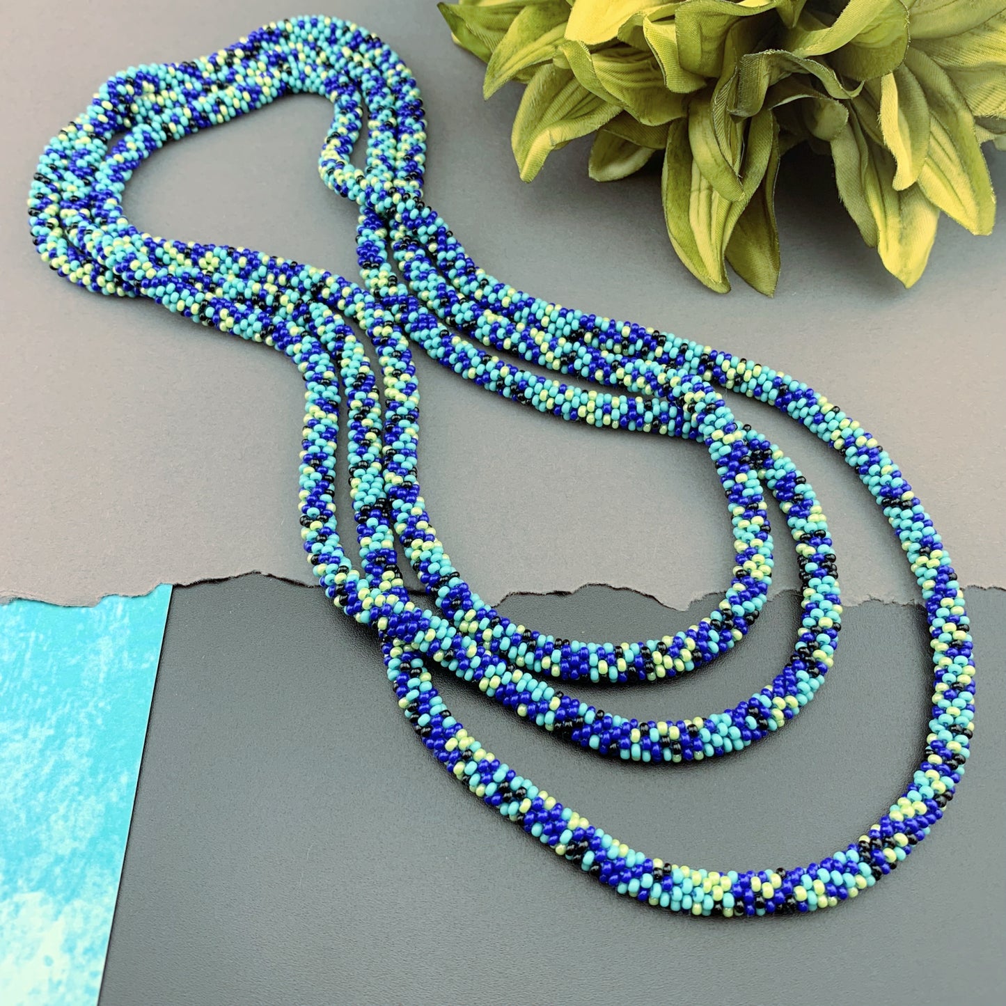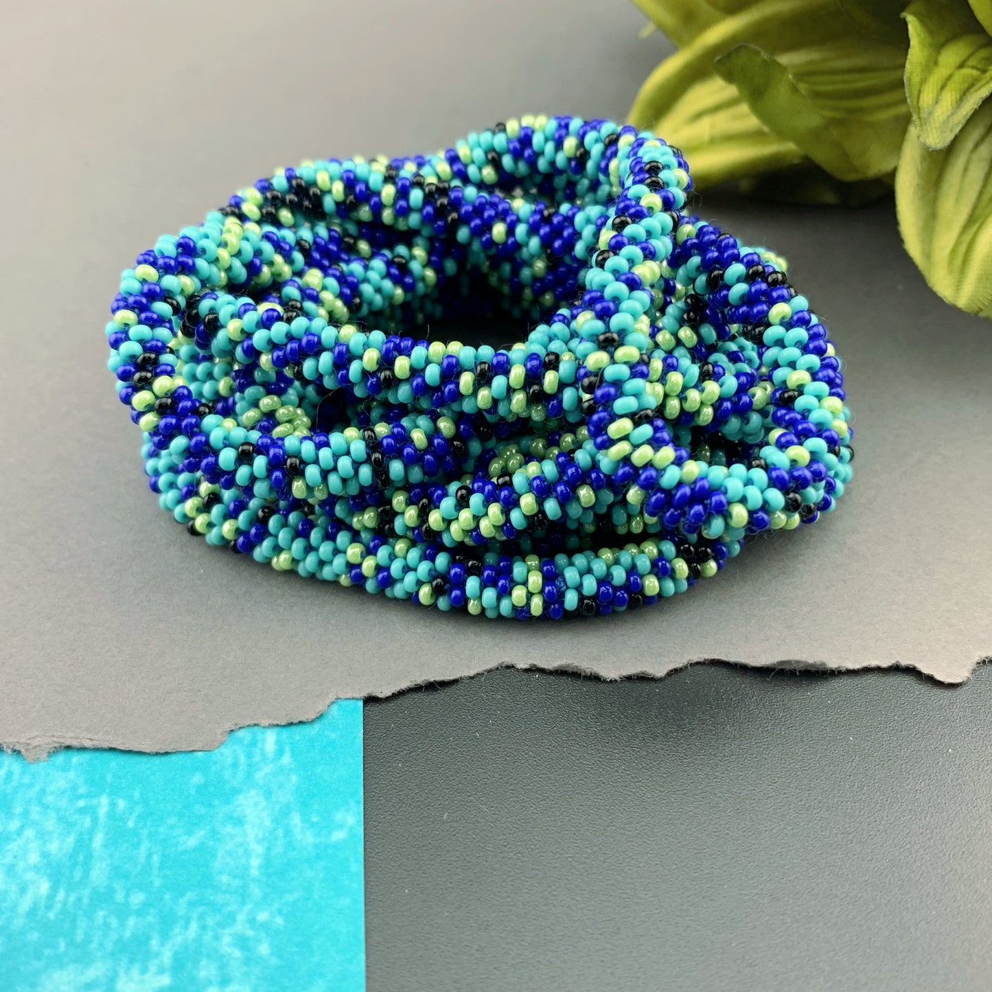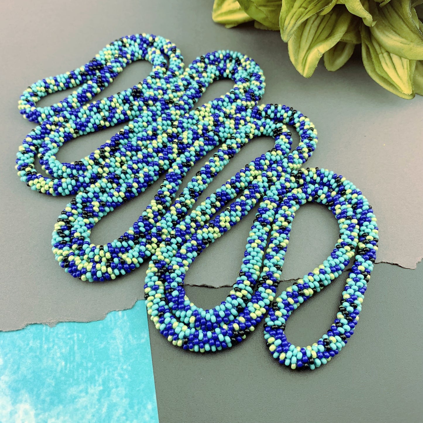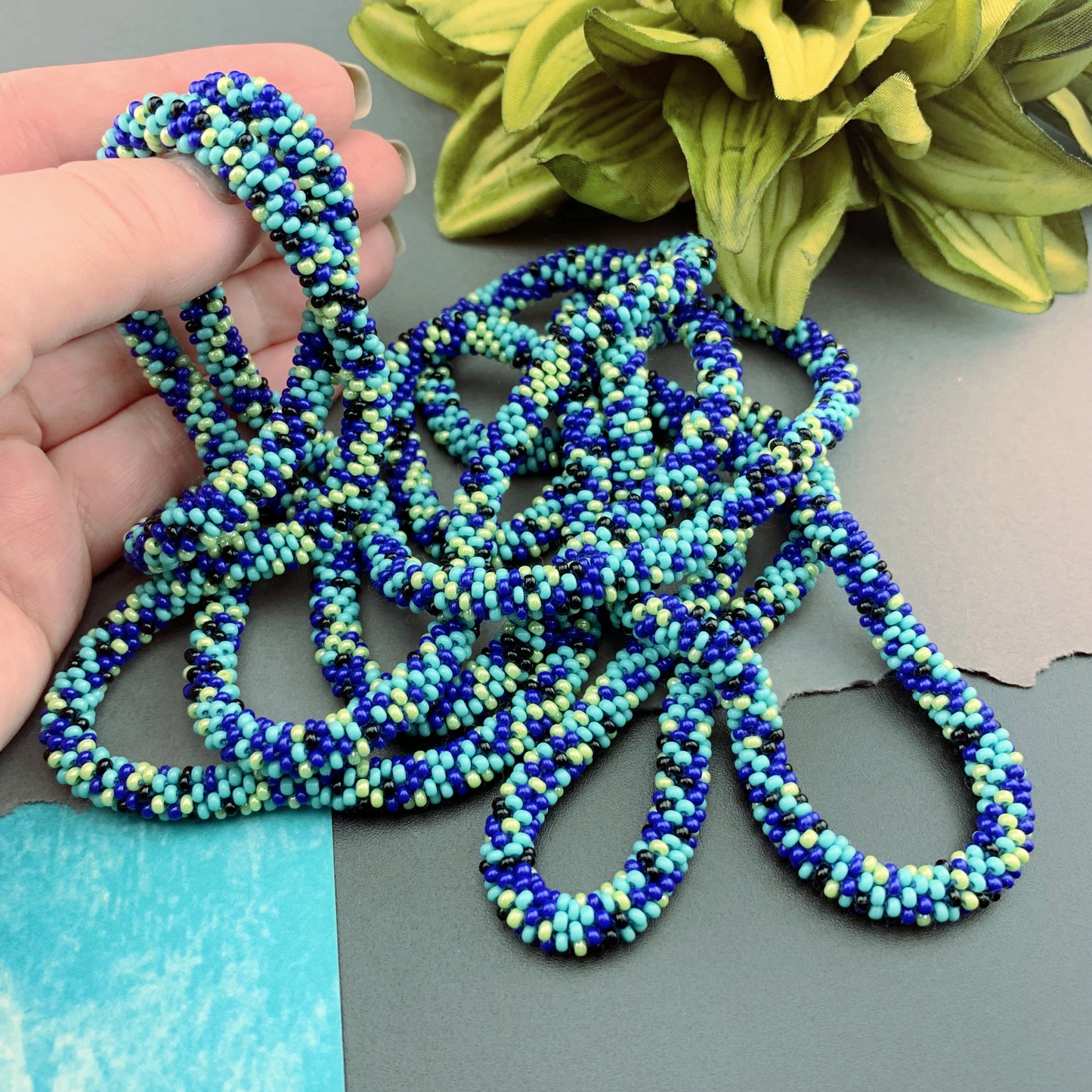 Soft, supple, luxurious beaded crochet rope necklace is hand crocheted with Czech glass 10/0 seed beads; a mix of dark cobalt blue, lime green, turquoise and black in an abstract pattern. Ends are sewn together creating a "seamless join". They are continuous with no clasp. Beautiful heirloom pieces that will be passed on for generations!