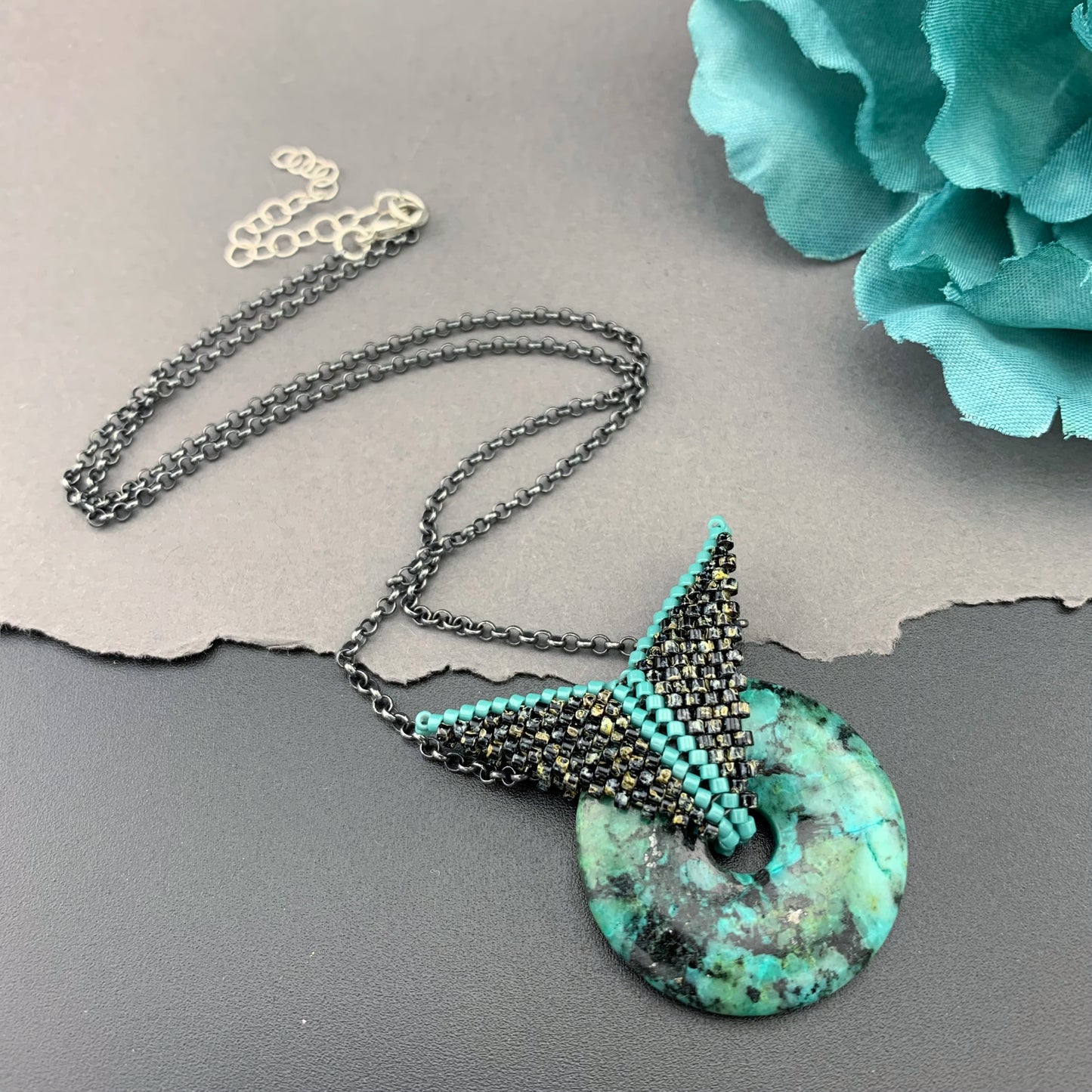 Enjoy 10% off when you buy the set: Natural African Turquoise Jasper gemstone pendant is suspended from Oxidized Sterling Silver chain by a hand stitched beaded bail combining Herringbone and Peyote stitch techniques in petite Miyuki Delica beads.