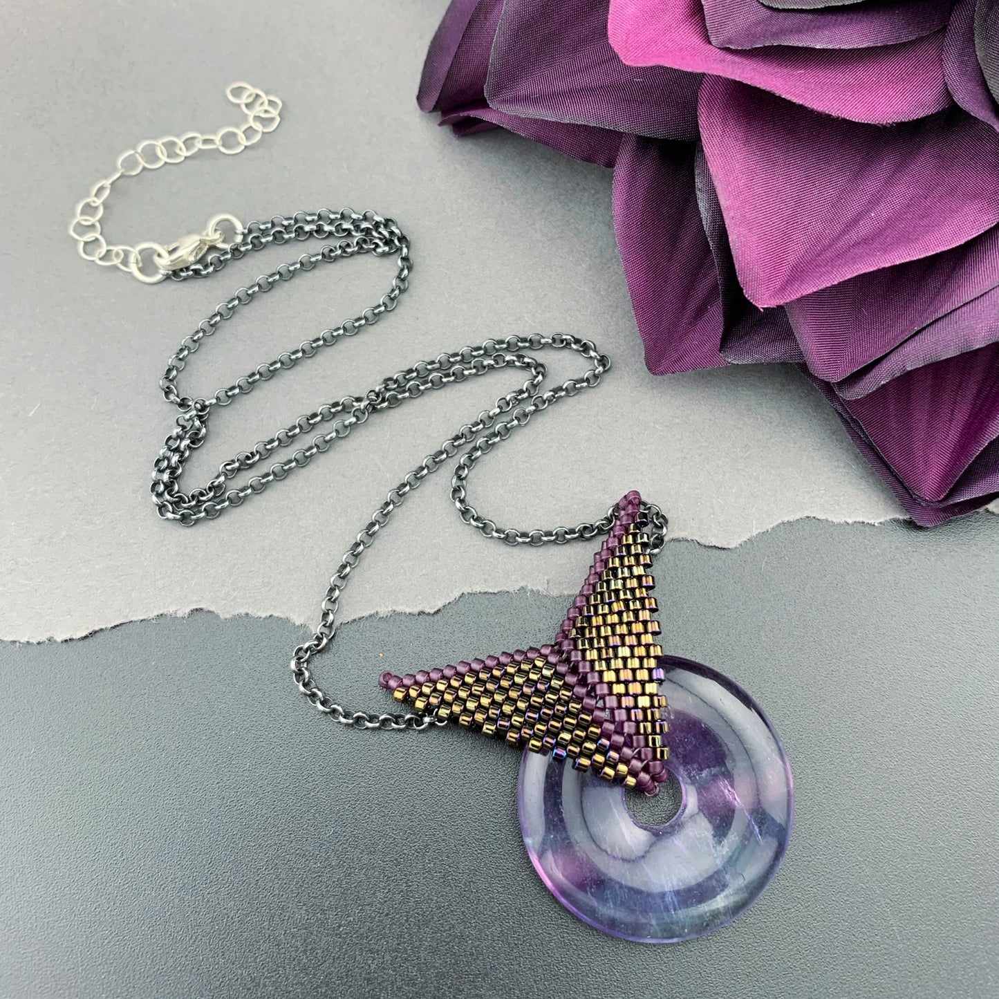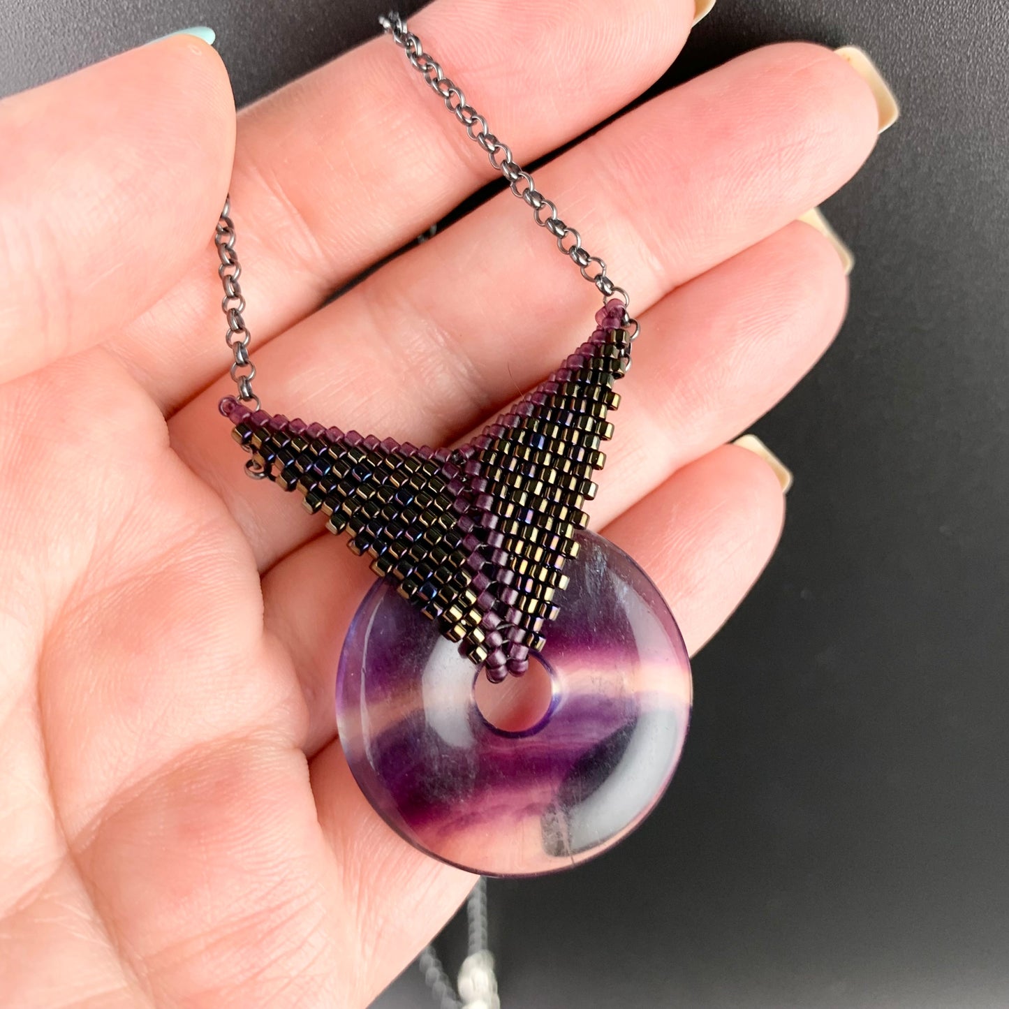 Enjoy 10% off when you buy the set: Natural Fluorite gemstone pendant is suspended from Oxidized Sterling Silver chain by a hand stitched beaded bail combining Herringbone and Peyote stitch techniques in petite Miyuki Delica beads.