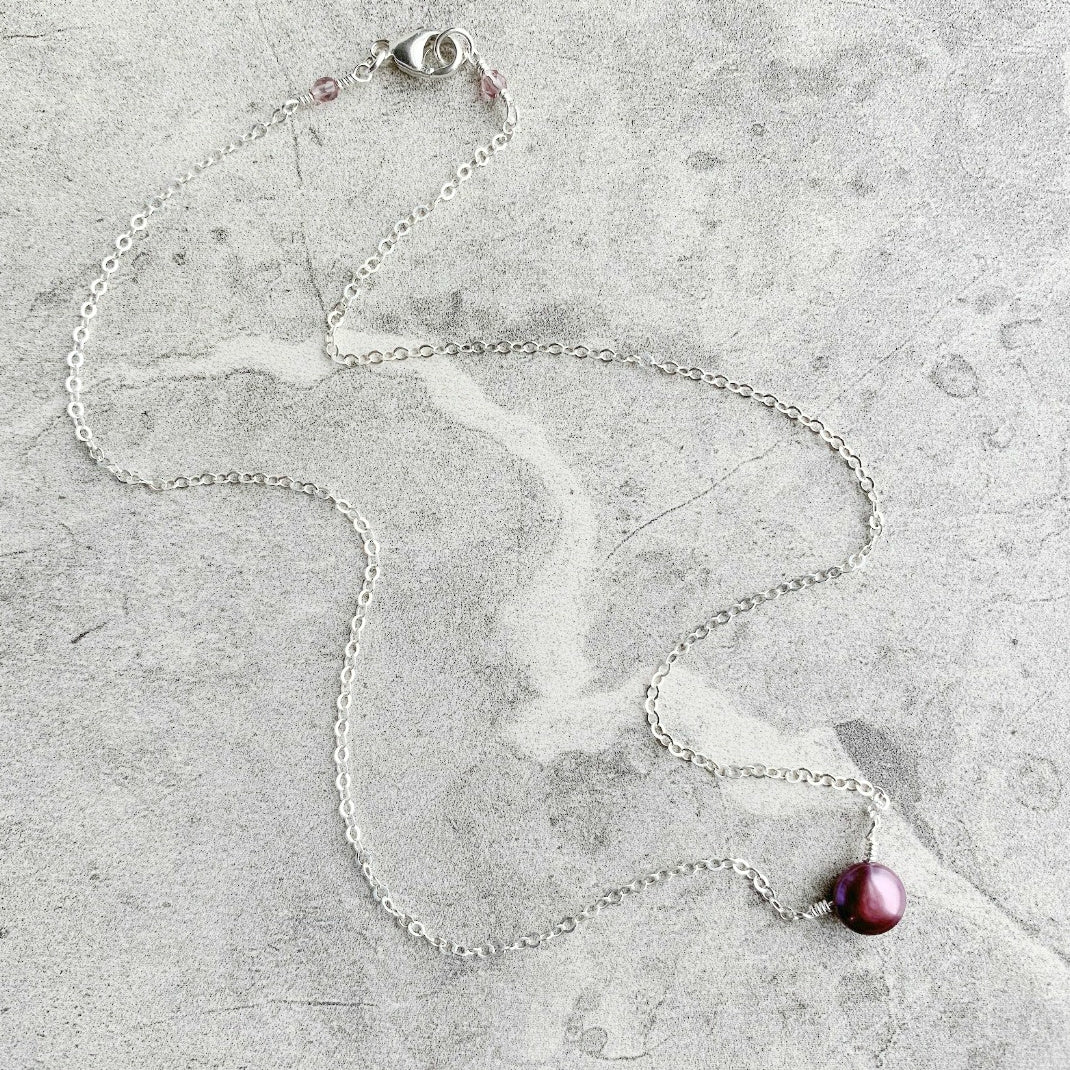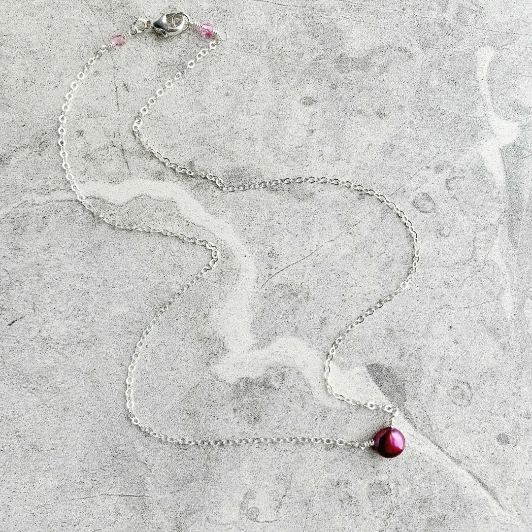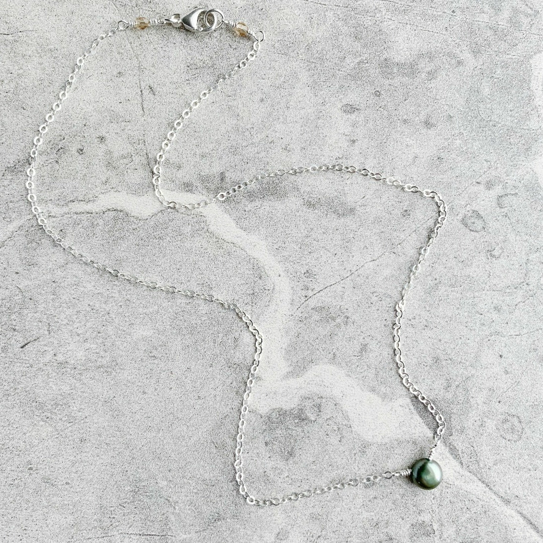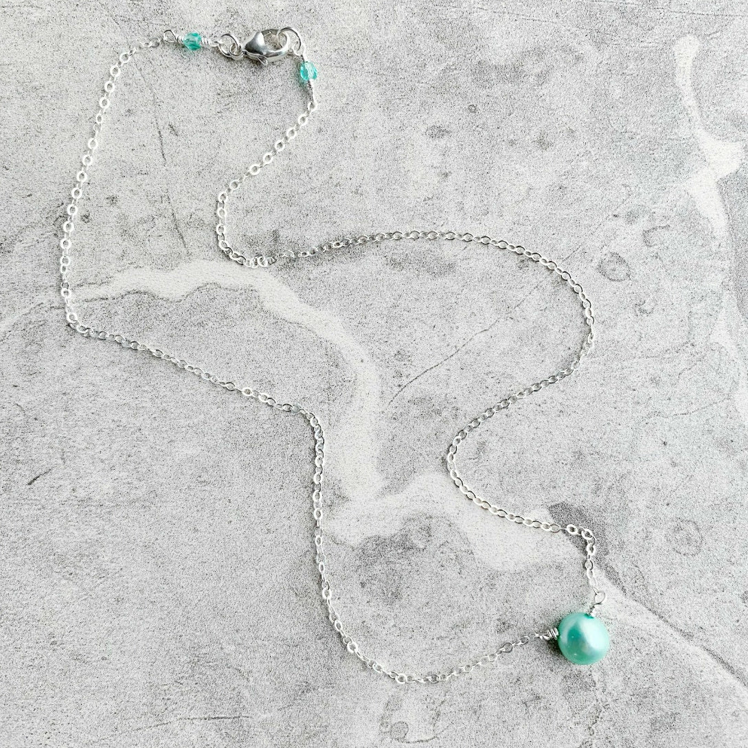 Minimalist necklace featuring a colorful Freshwater Pearl wrapped in Sterling Silver wire connected to delicate 1.7mm Sterling Silver flat cable chain finished with Czech Preciosa crystals. Lobster clasp closure.