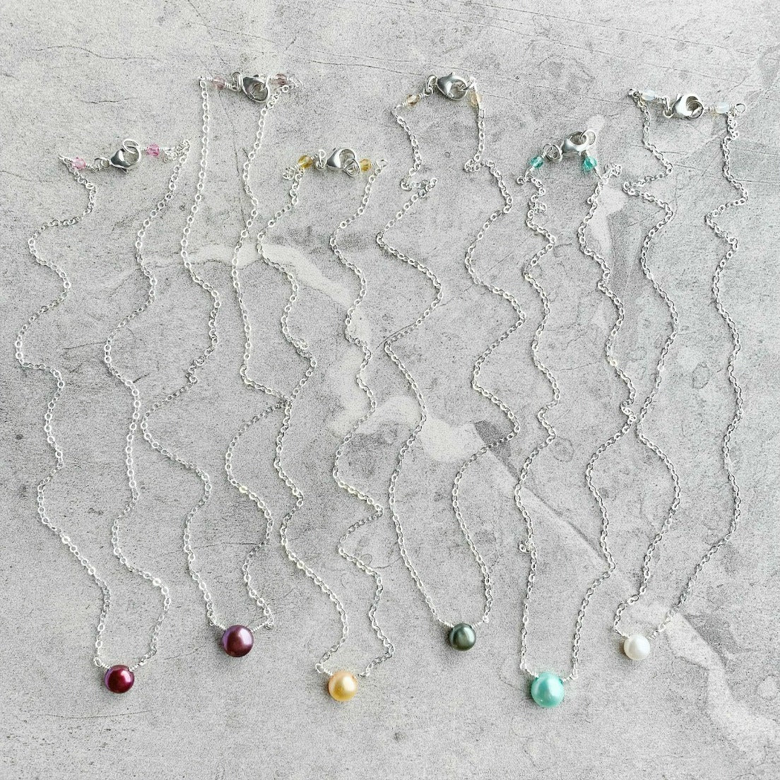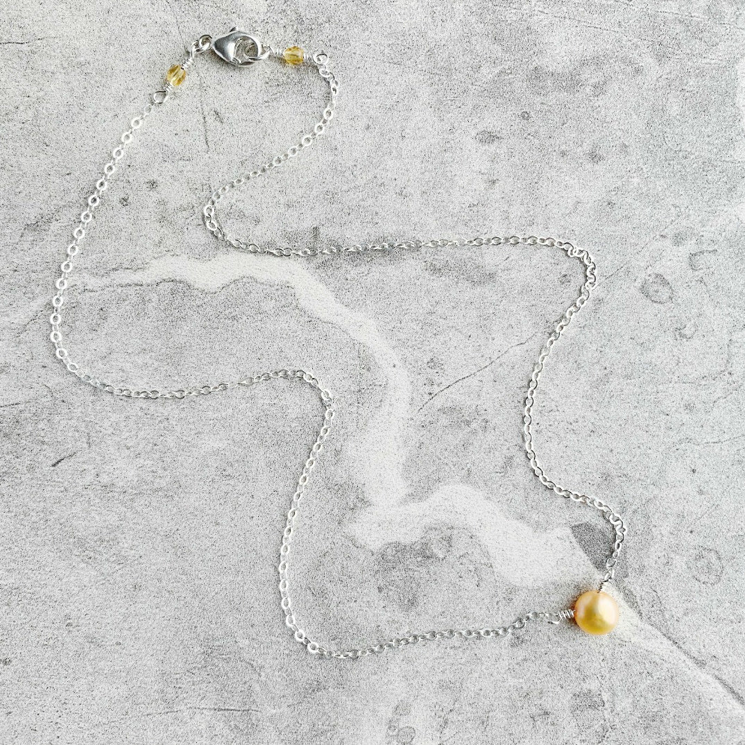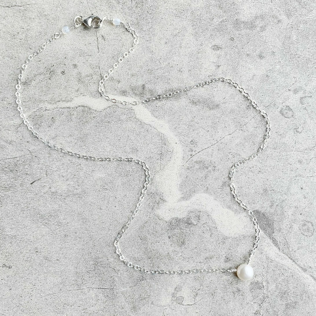 Minimalist necklace featuring a colorful Freshwater Pearl wrapped in Sterling Silver wire connected to delicate 1.7mm Sterling Silver flat cable chain finished with Czech Preciosa crystals. Lobster clasp closure.