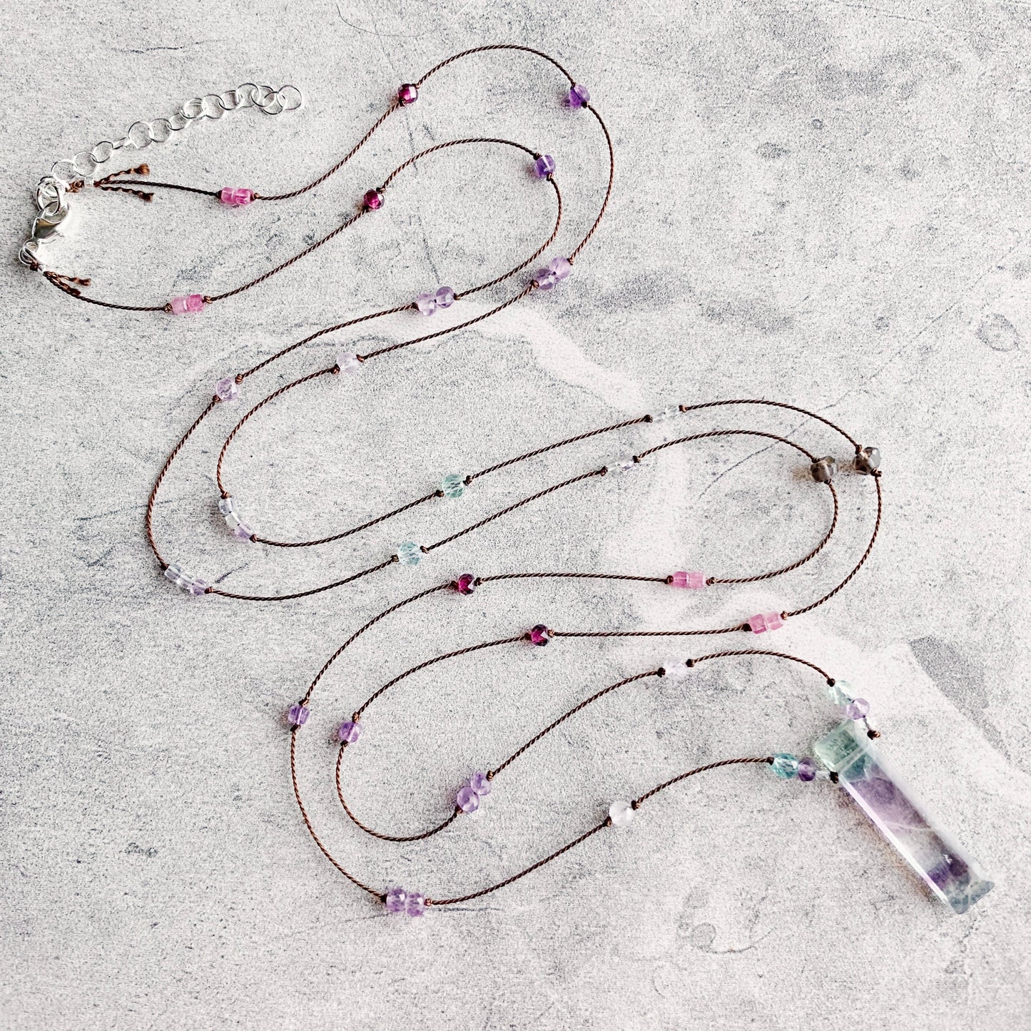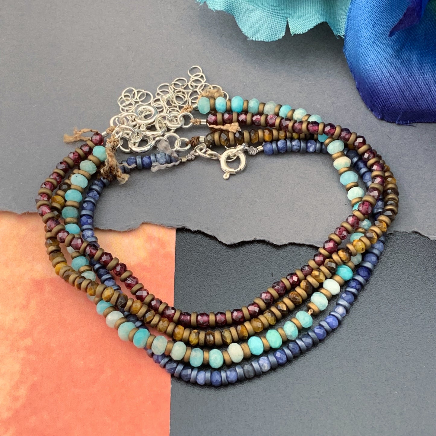 If it features natural gemstones, it lives here. This collection celebrates the infinite ways stones can be transformed into wearable art - silk knotted, wire wrapped, bead woven, crocheted over silk. Oxidized copper meets sterling silver. Necklaces that layer, bracelets to stack, earrings that catch the light.