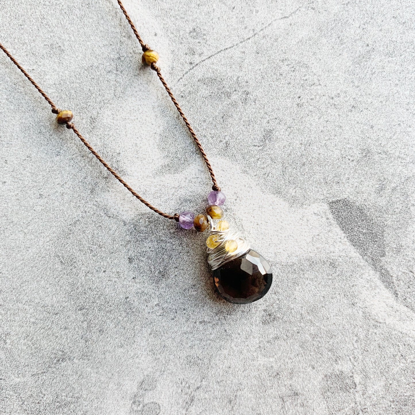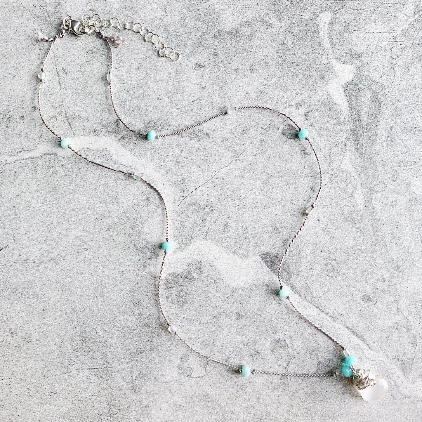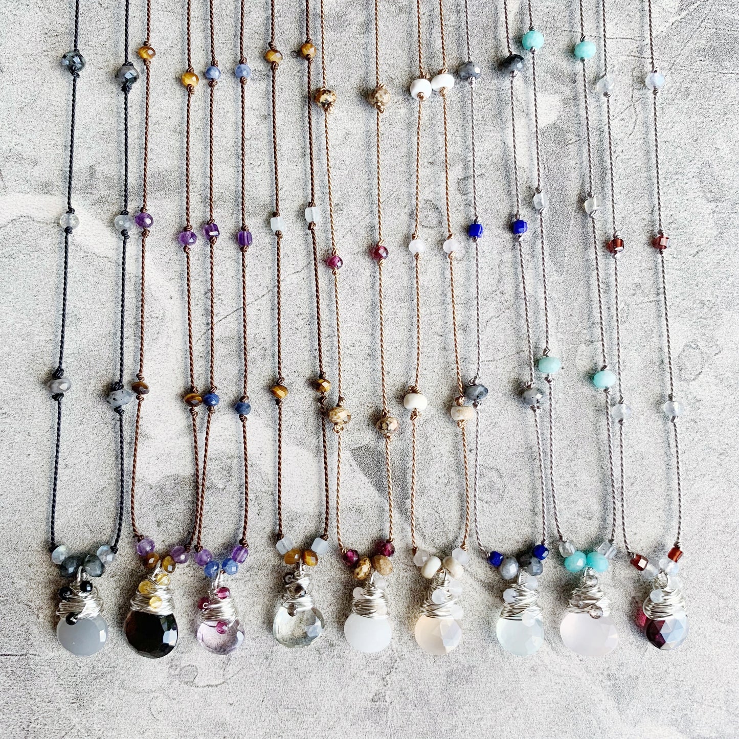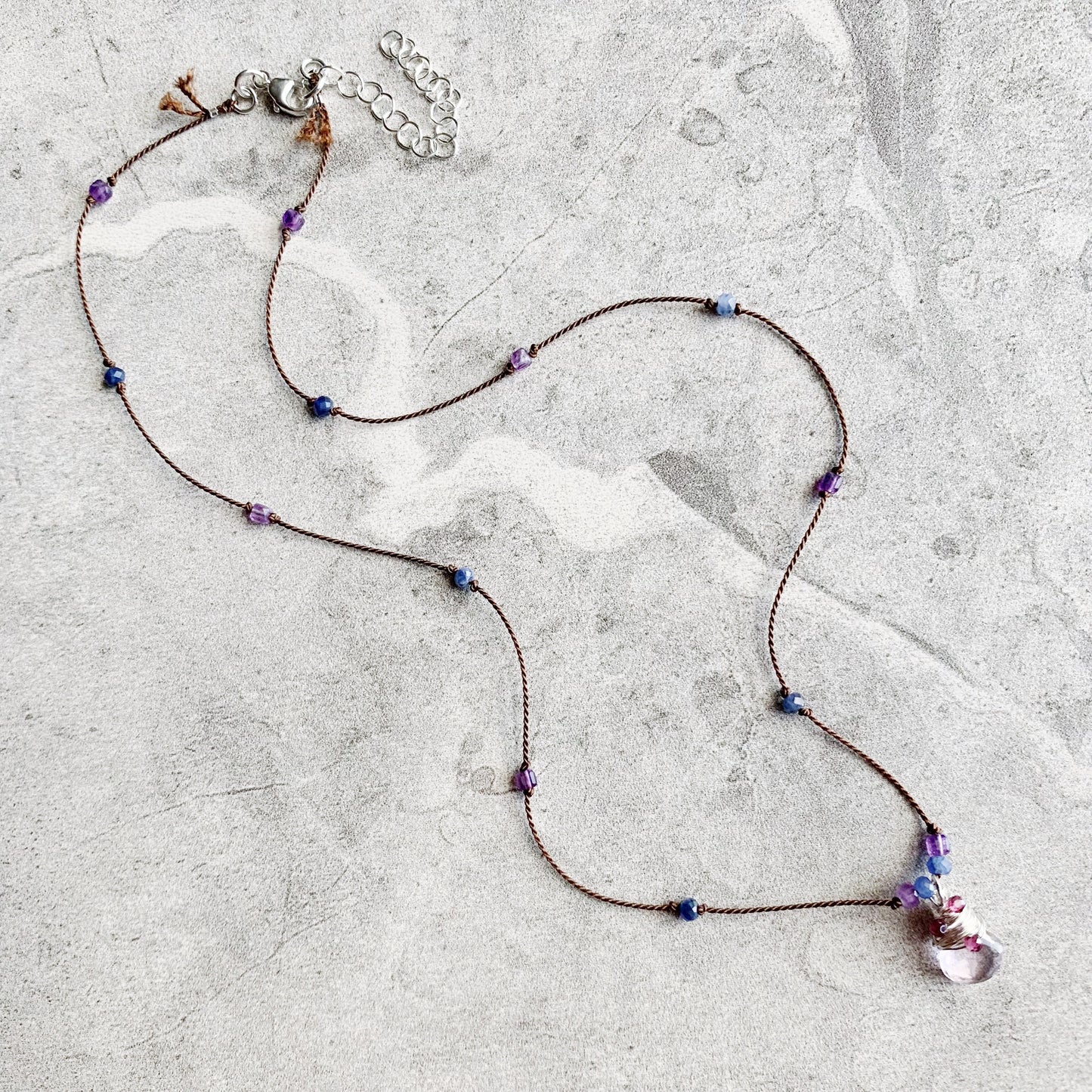 Delicate, minimalist and packed with sparkle! Petite faceted gemstones are hand knotted on luxurious silk cord, leading down to the eye catching pendant: a faceted gemstone heart drop wire wrapped in Sterling Silver with extra petite faceted gemstones, surrounded by gemstones knotted into place. Silk is knotted onto closed rings and then crimped for extra security, signature silk tassel is left at the clasp.