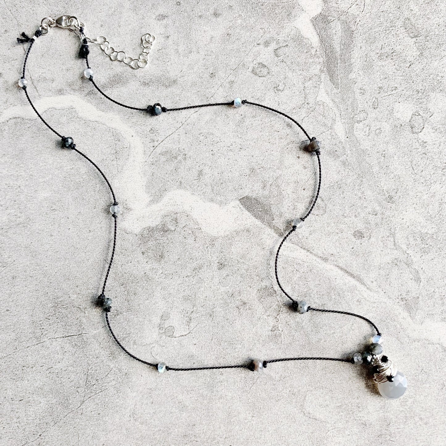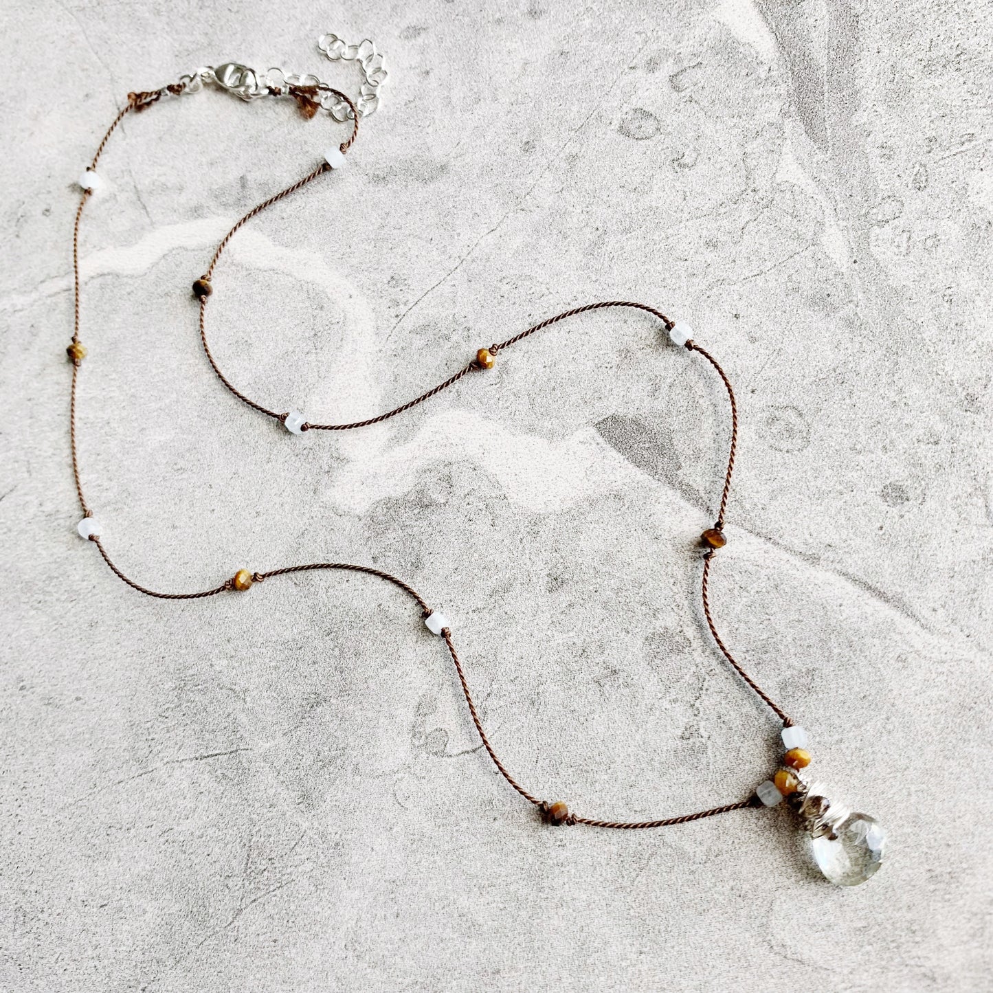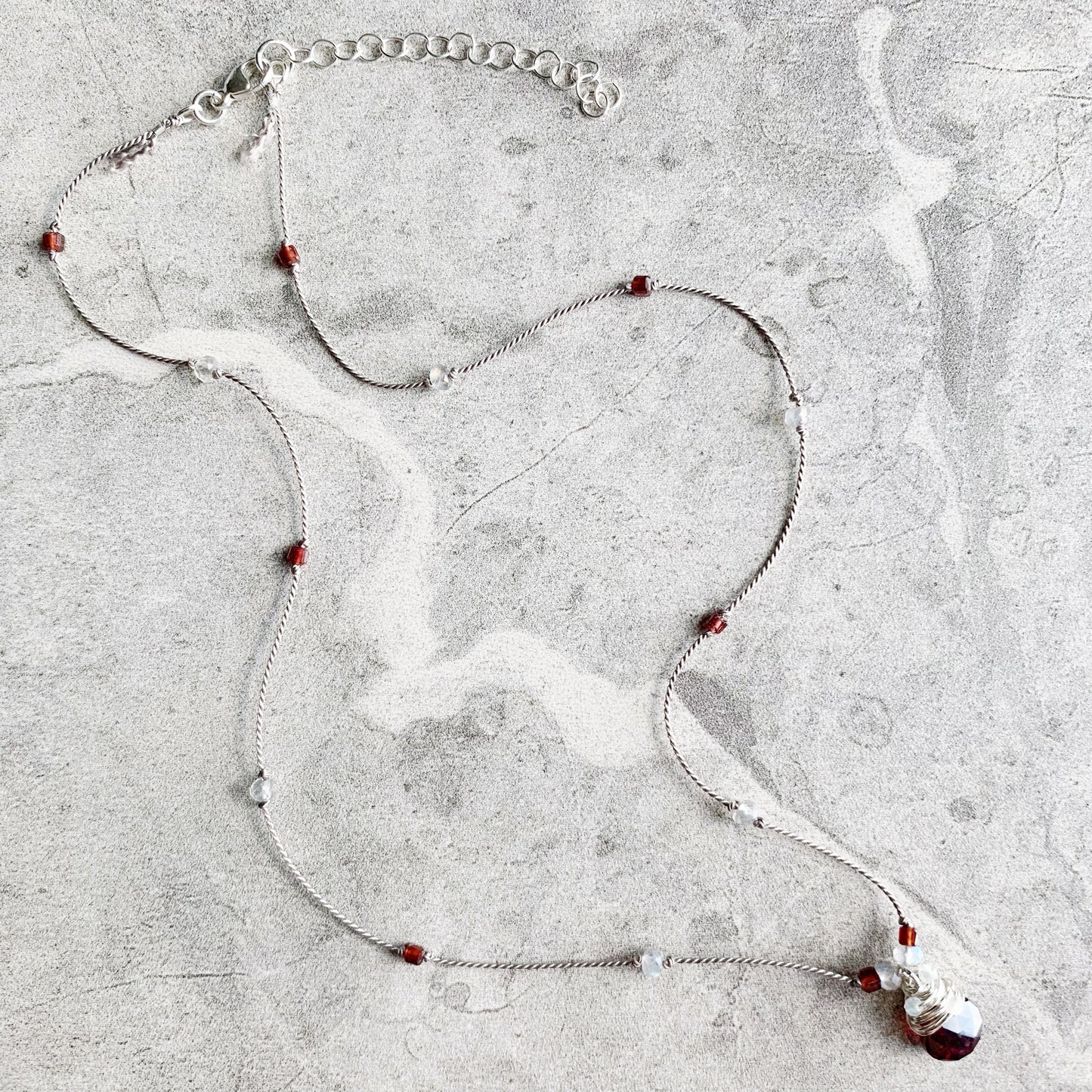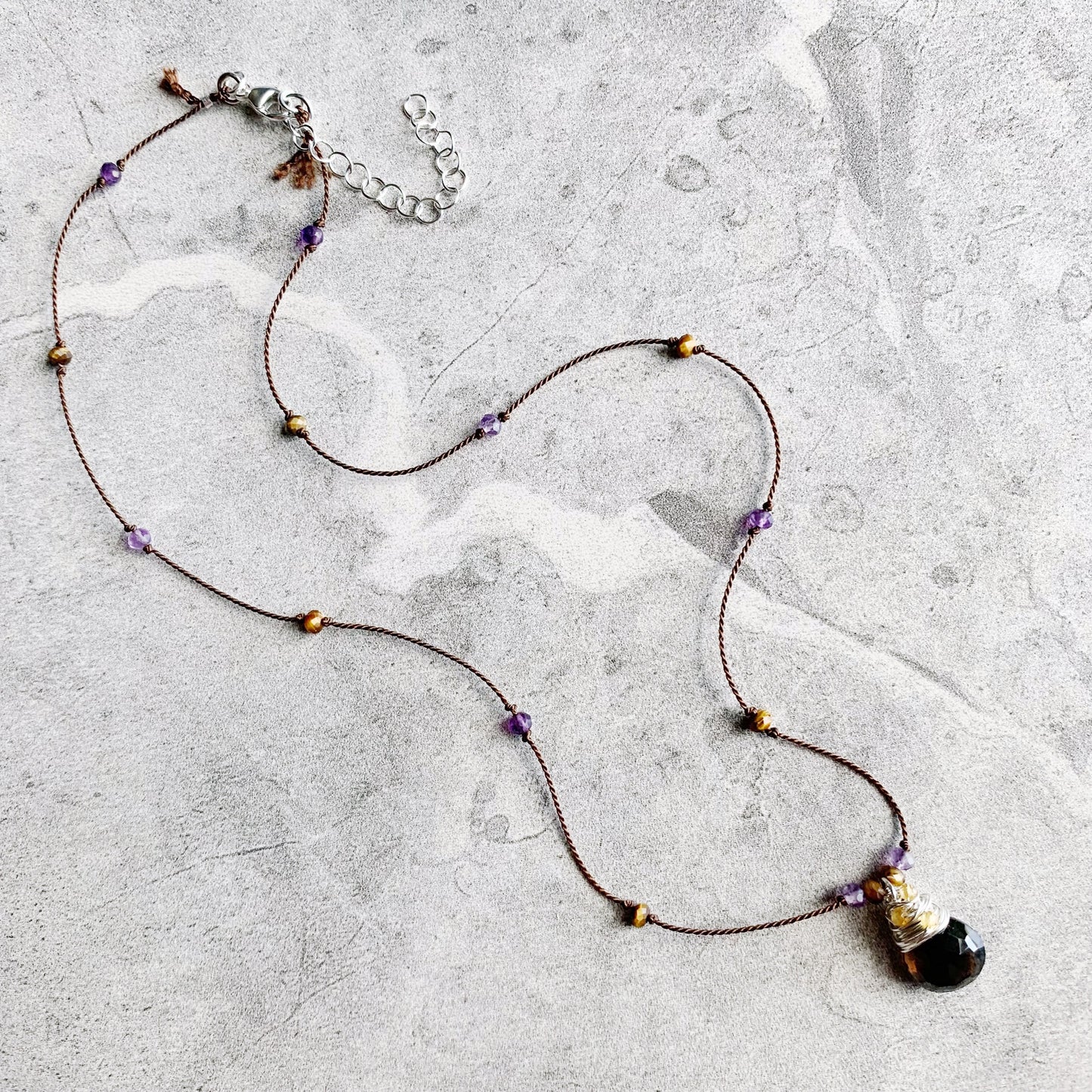 Delicate, minimalist and packed with sparkle! Petite faceted gemstones are hand knotted on luxurious silk cord, leading down to the eye catching pendant: a faceted gemstone heart drop wire wrapped in Sterling Silver with extra petite faceted gemstones, surrounded by gemstones knotted into place. Silk is knotted onto closed rings and then crimped for extra security, signature silk tassel is left at the clasp.