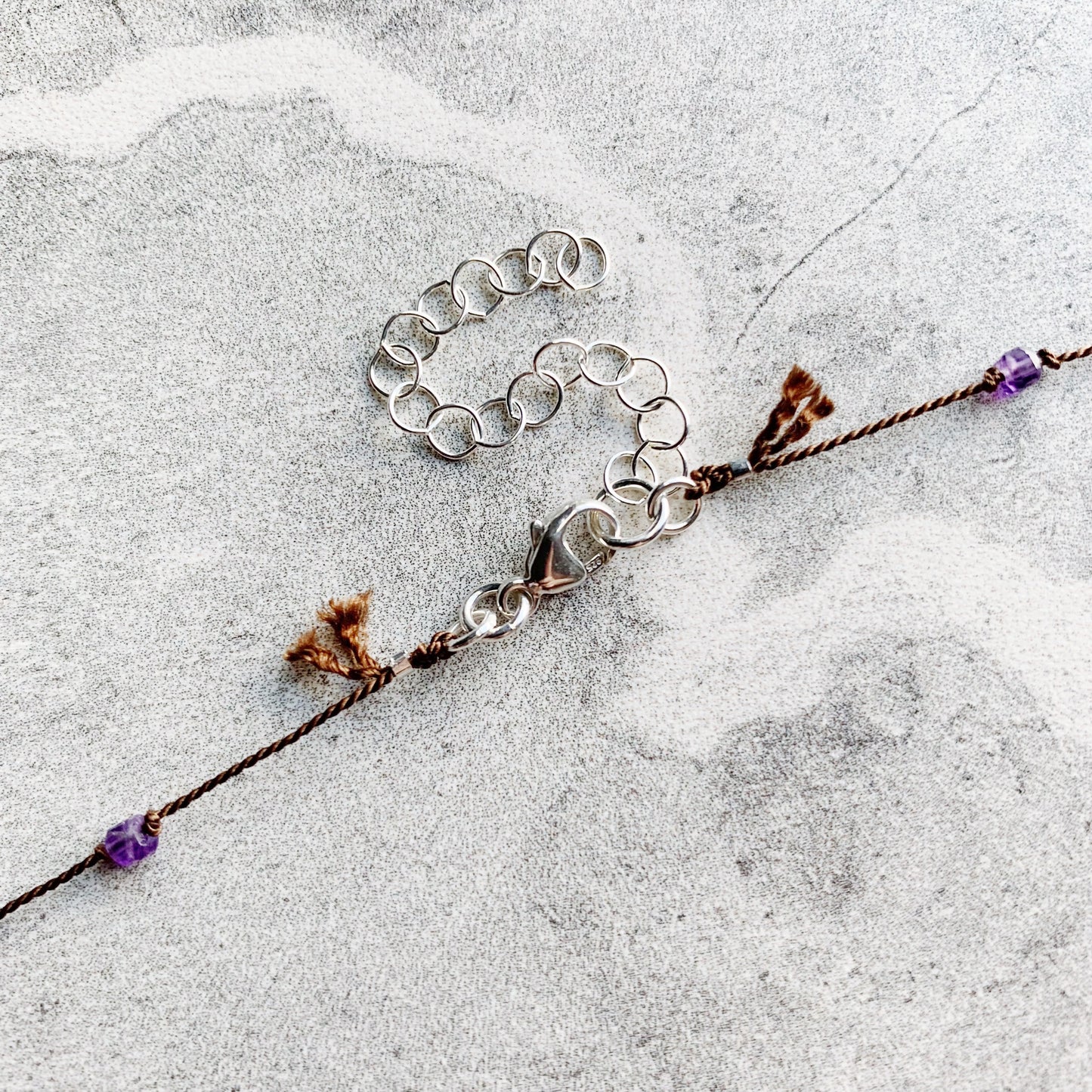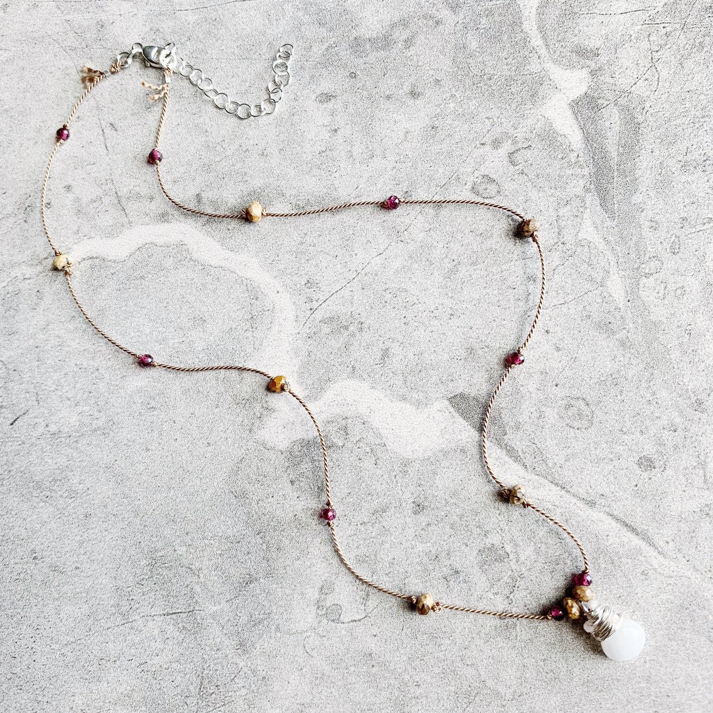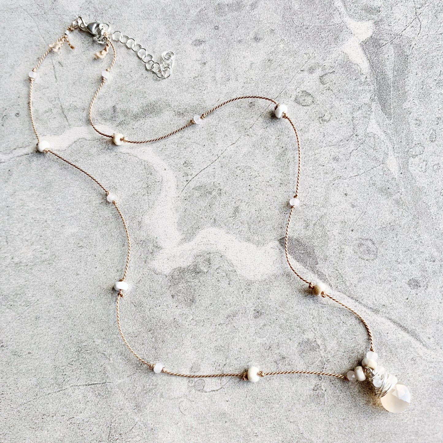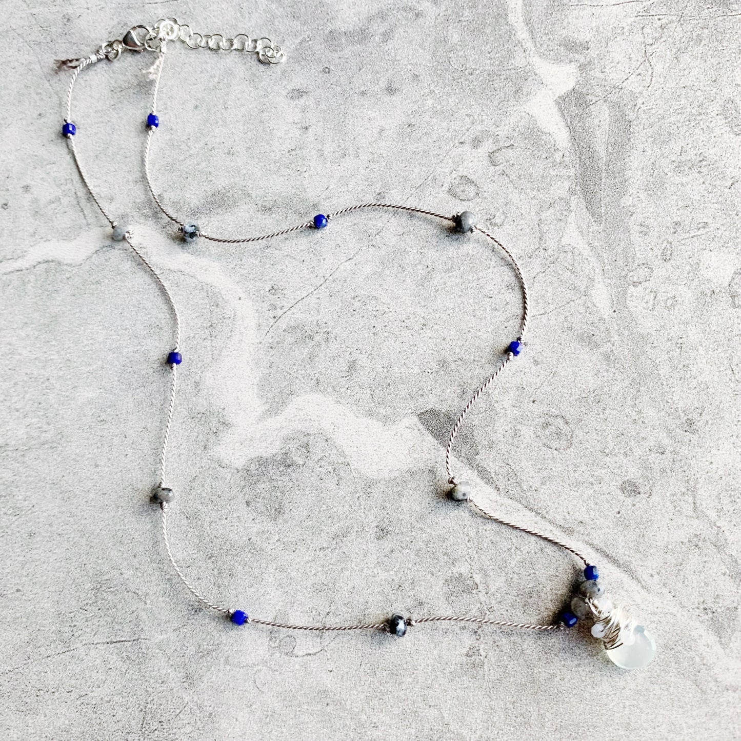 Delicate, minimalist and packed with sparkle! Petite faceted gemstones are hand knotted on luxurious silk cord, leading down to the eye catching pendant: a faceted gemstone heart drop wire wrapped in Sterling Silver with extra petite faceted gemstones, surrounded by gemstones knotted into place. Silk is knotted onto closed rings and then crimped for extra security, signature silk tassel is left at the clasp.
