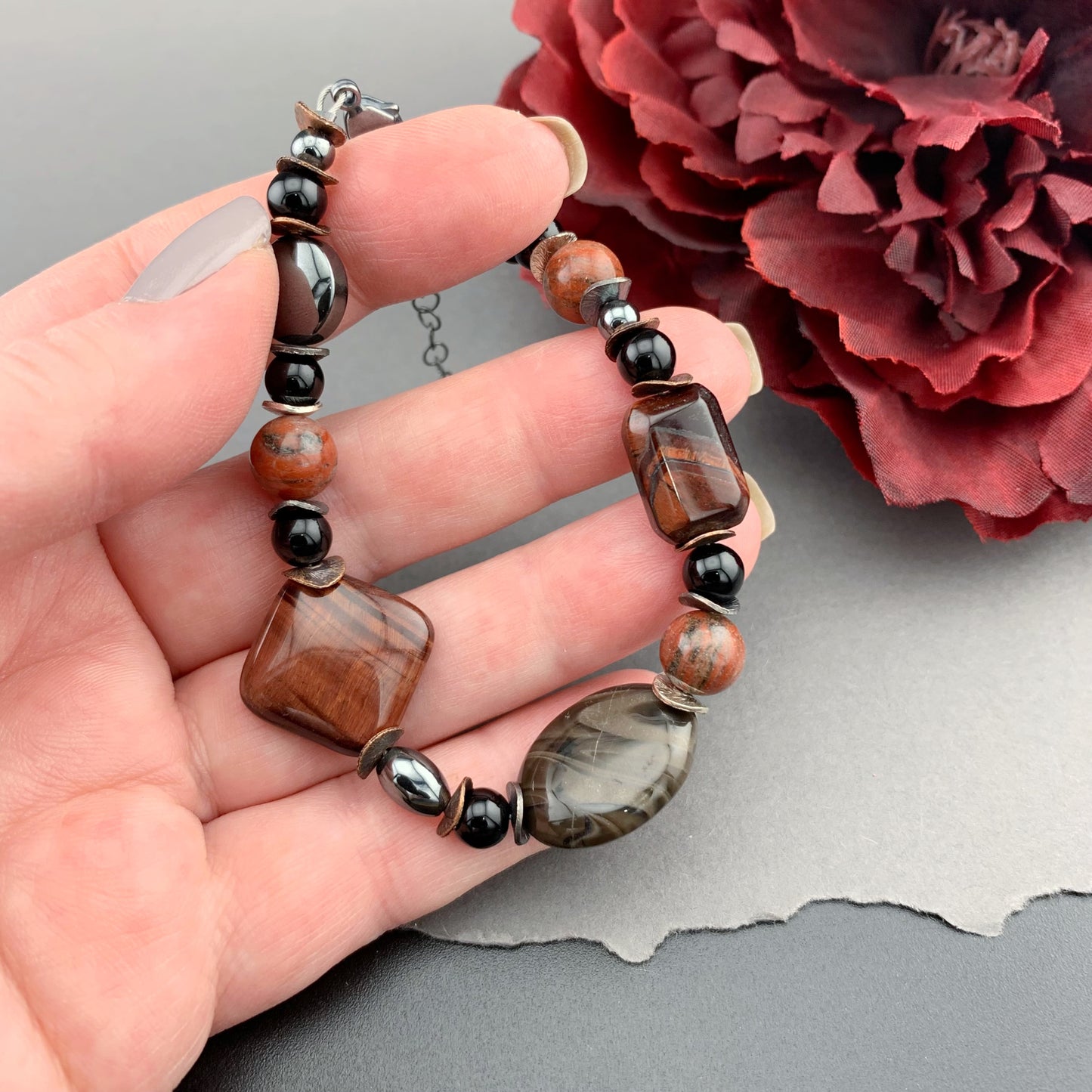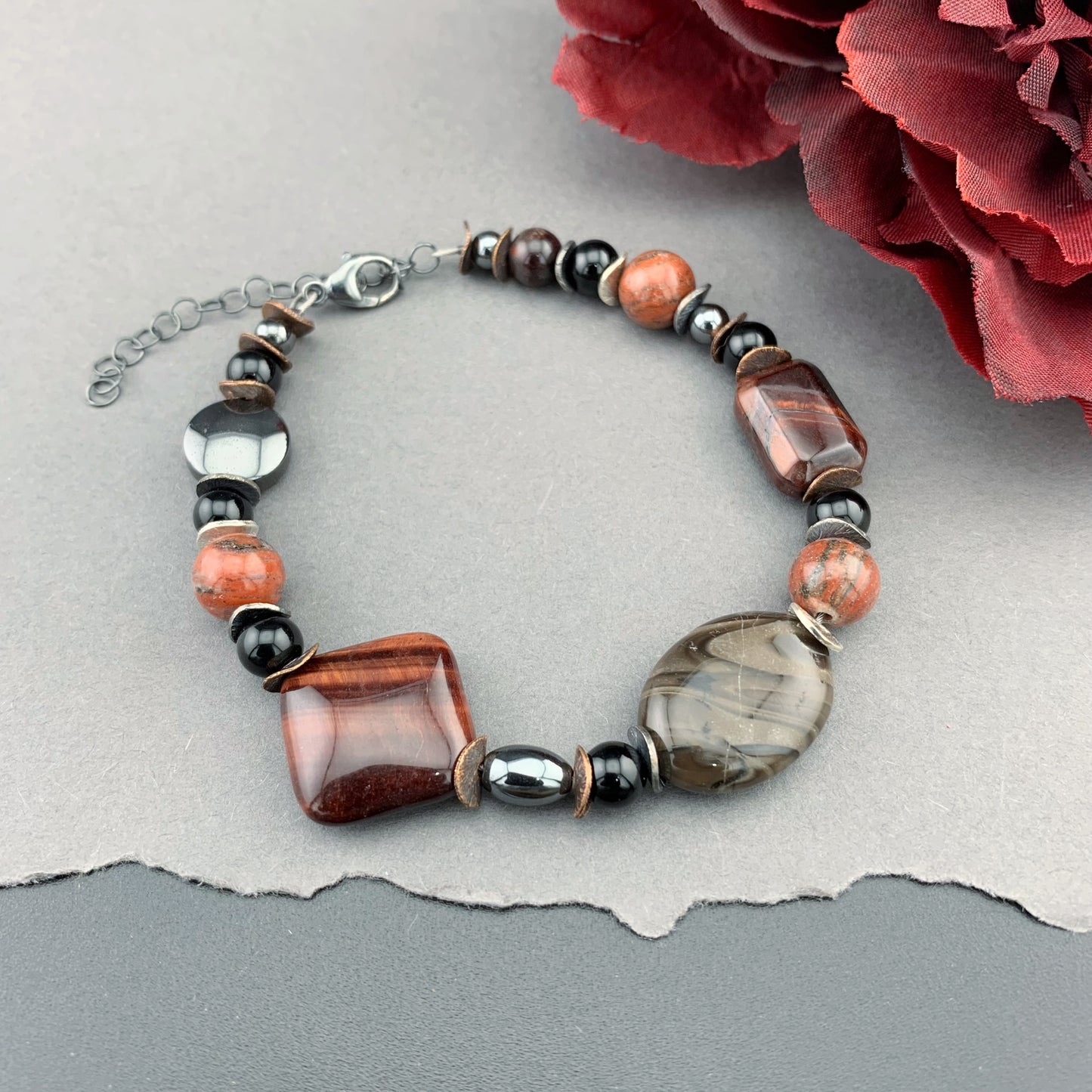 -Red Tiger's Eye, Brown Striated Jasper, Red Sesame Jasper, Hematite, Black Obsidian