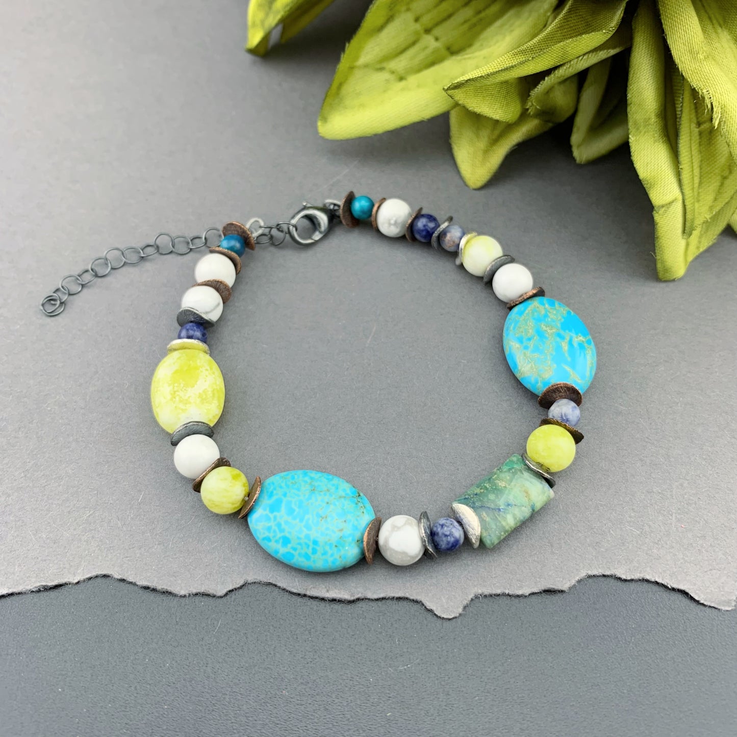Mixed gemstones are surrounded by 6mm wavy discs in Oxidized Copper, Bright and Oxidized Sterling Silver that just melt around your wrist. Beautiful when worn alone, and layers so well with the other Balance Bracelets and Decadent Bangles!