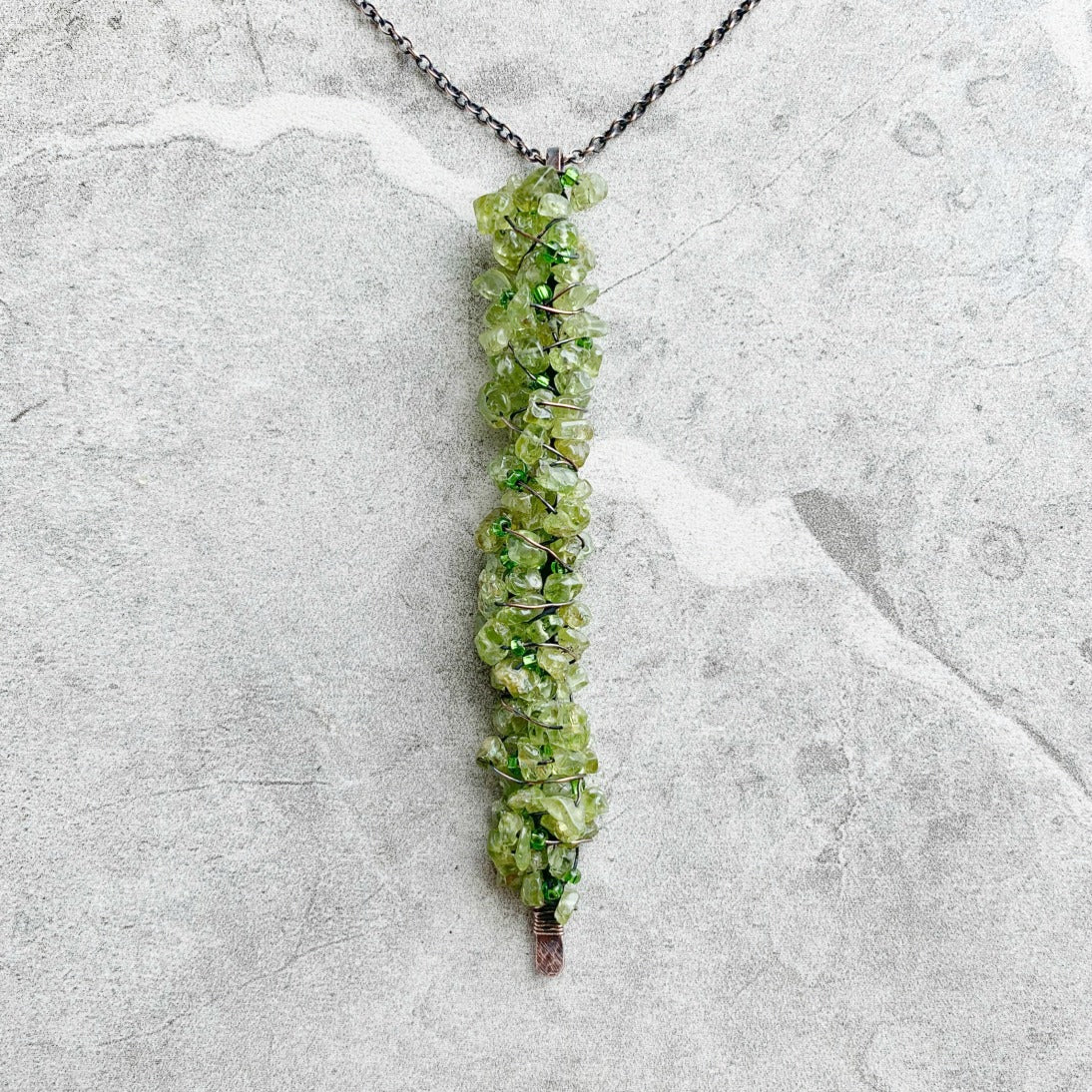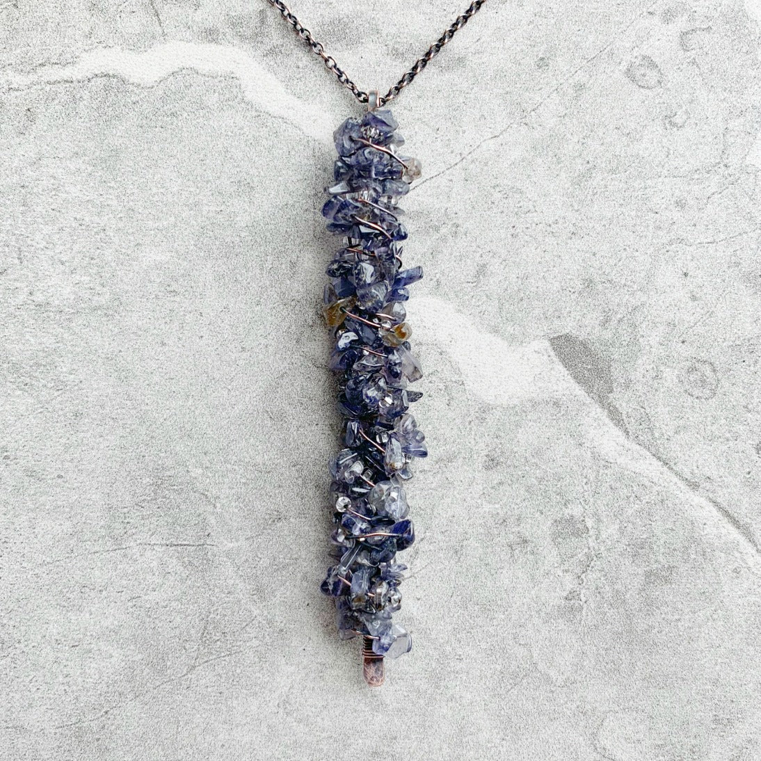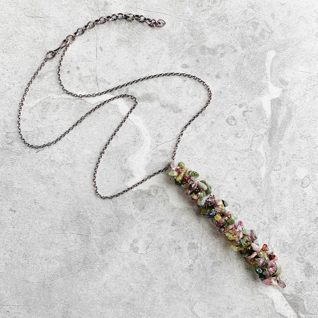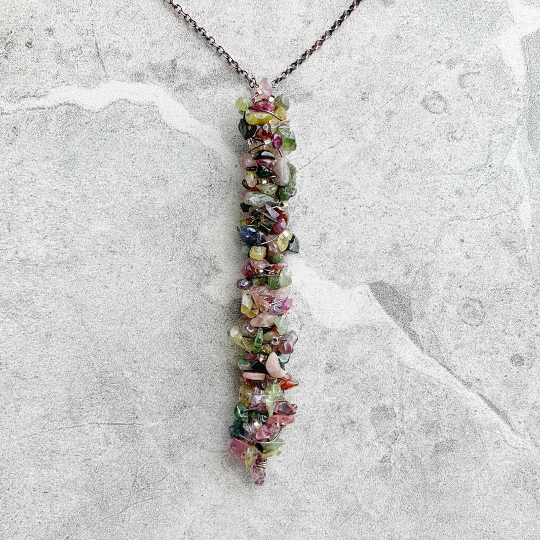 Vertical bar pendant necklace featuring natural gemstone chips and Czech glass seed beads wire wrapped onto a hand forged bar to achieve the "cluster" effect. Hook clasp closure. *chain has been upgraded to a slightly thicker 2.4mm (from the original 1.7mm)