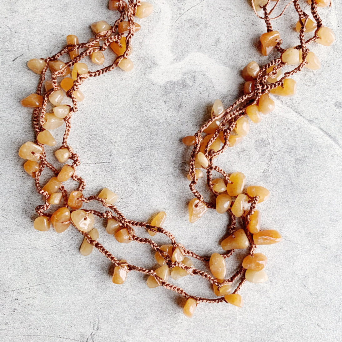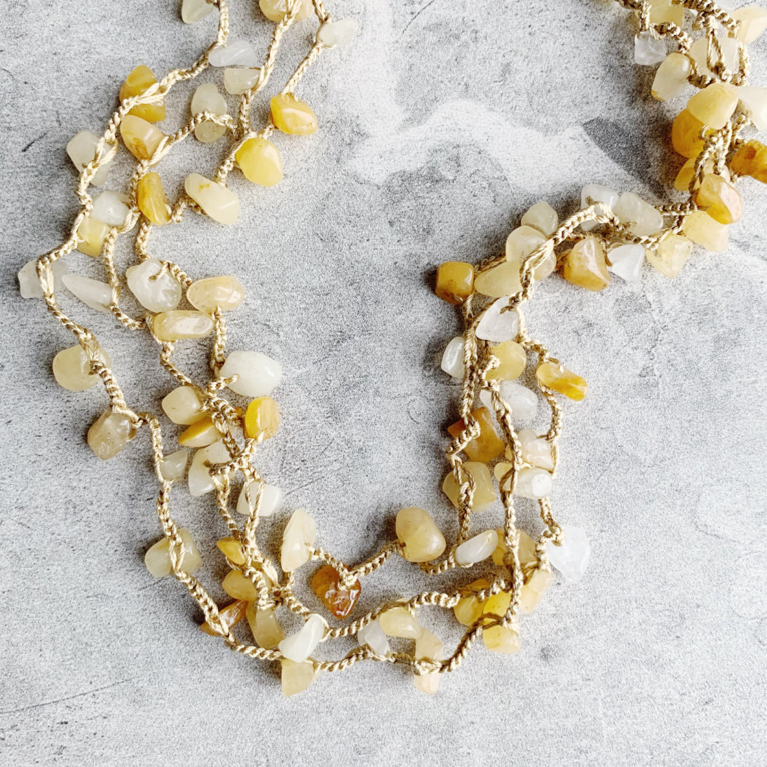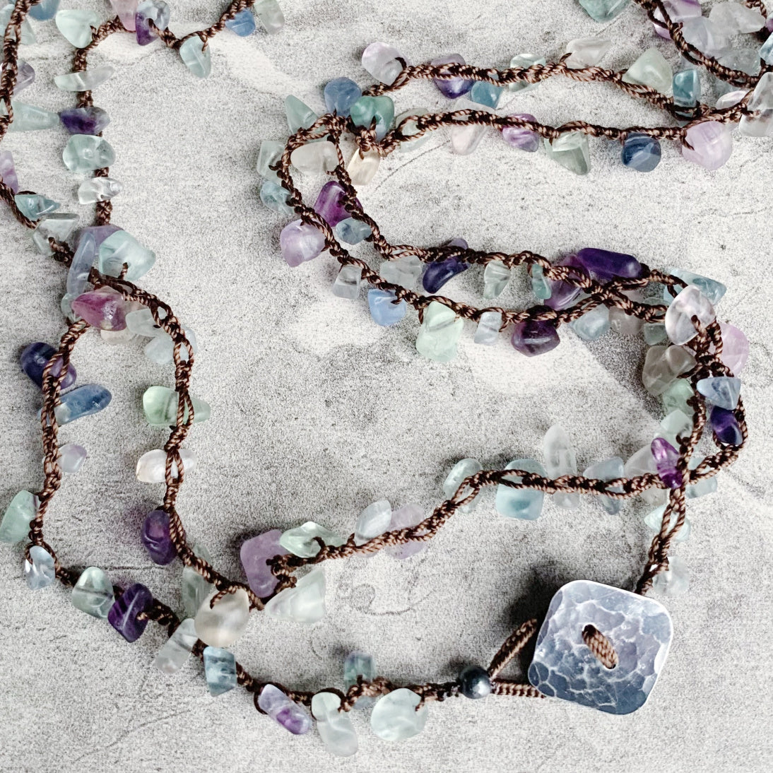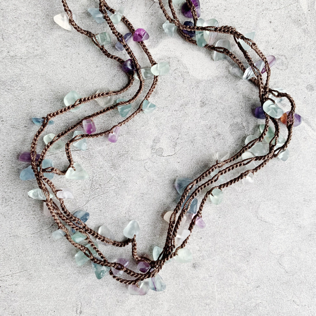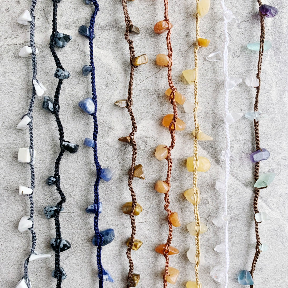 This is a redesigned version of the best selling original including thicker silk thread for even better durability, and named Uninhibited for the very reason that it may be worn all different ways: as a long layering necklace, doubled, wrapped many times as a choker necklace, bracelet, or as an anklet! The airy luxury of silk thread combined with gemstone chips sprinkled in results in softness that can be worn a variety of ways to compliment any outfit.