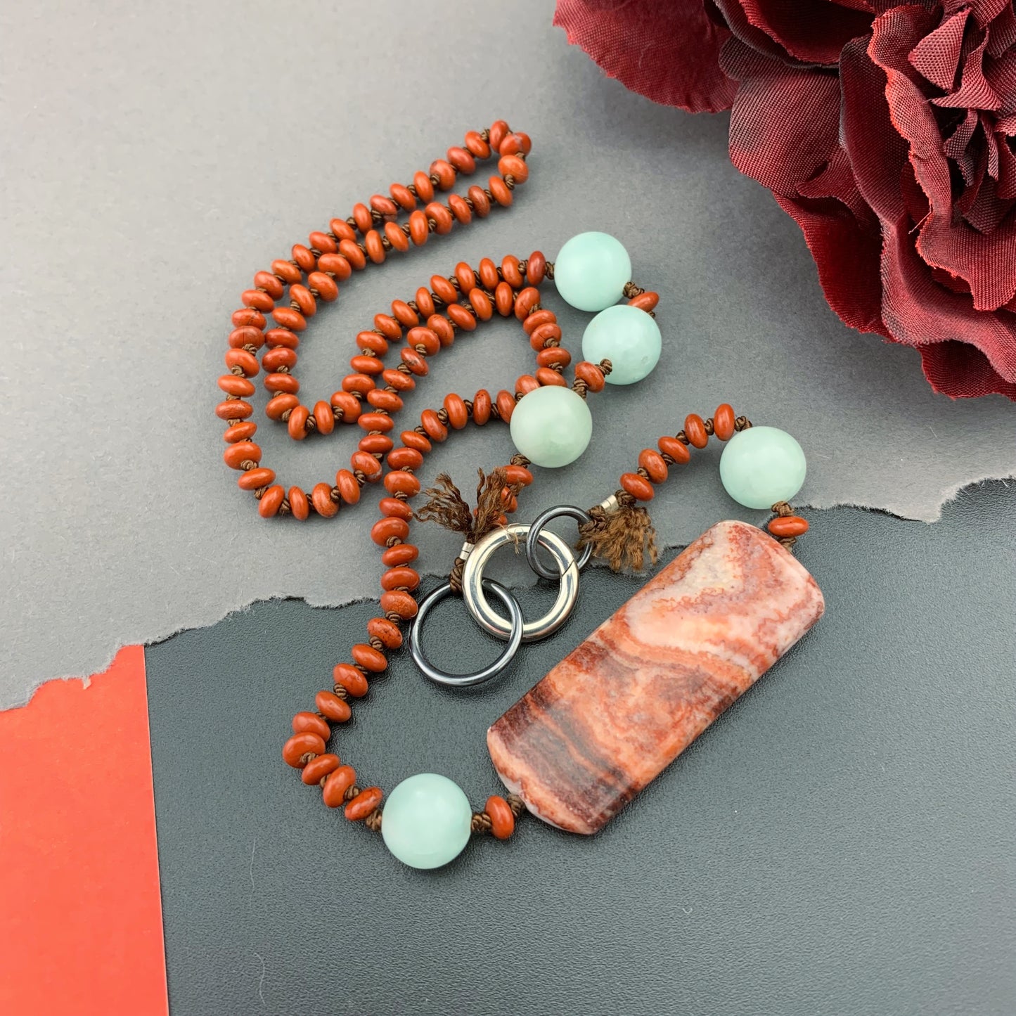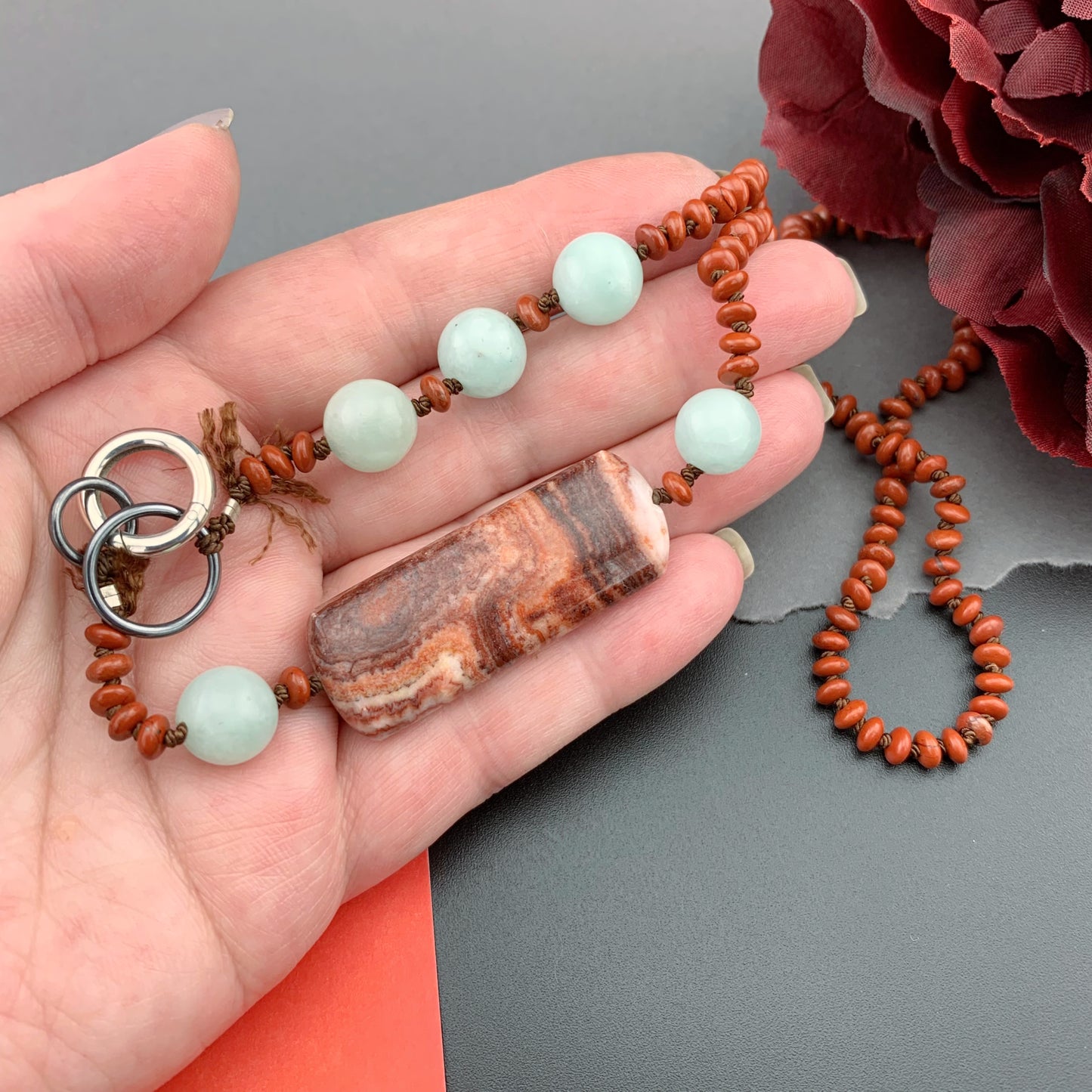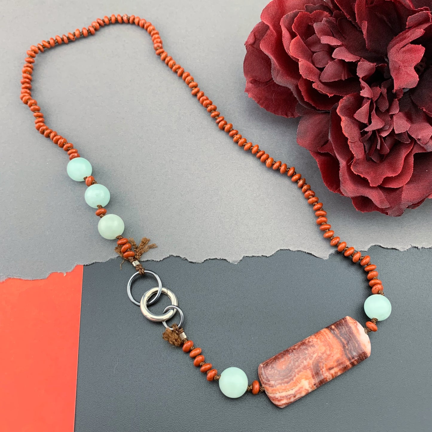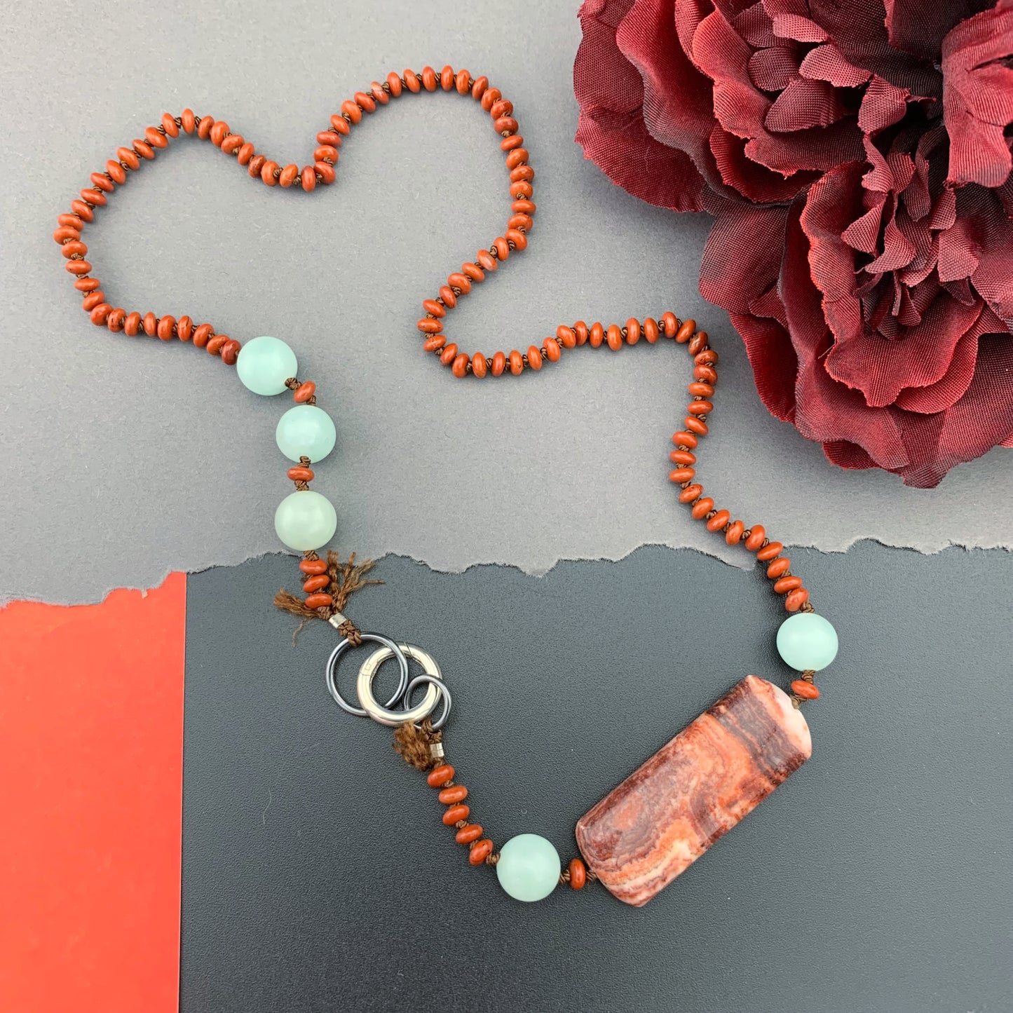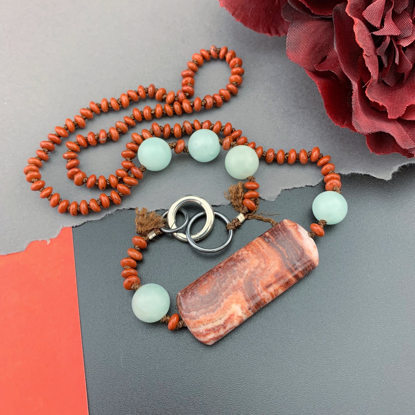 Rich Red Jasper and pale Amazonite gemstones are hand knotted on luxurious brown silk cord, knotted onto closed Oxidized Sterling Silver rings and crimped for extra security. Signature silk tassel is left at the clasp. These larger gemstones are from my coveted collection of many years, which means they can no longer be found, making this a treasured and unique piece.