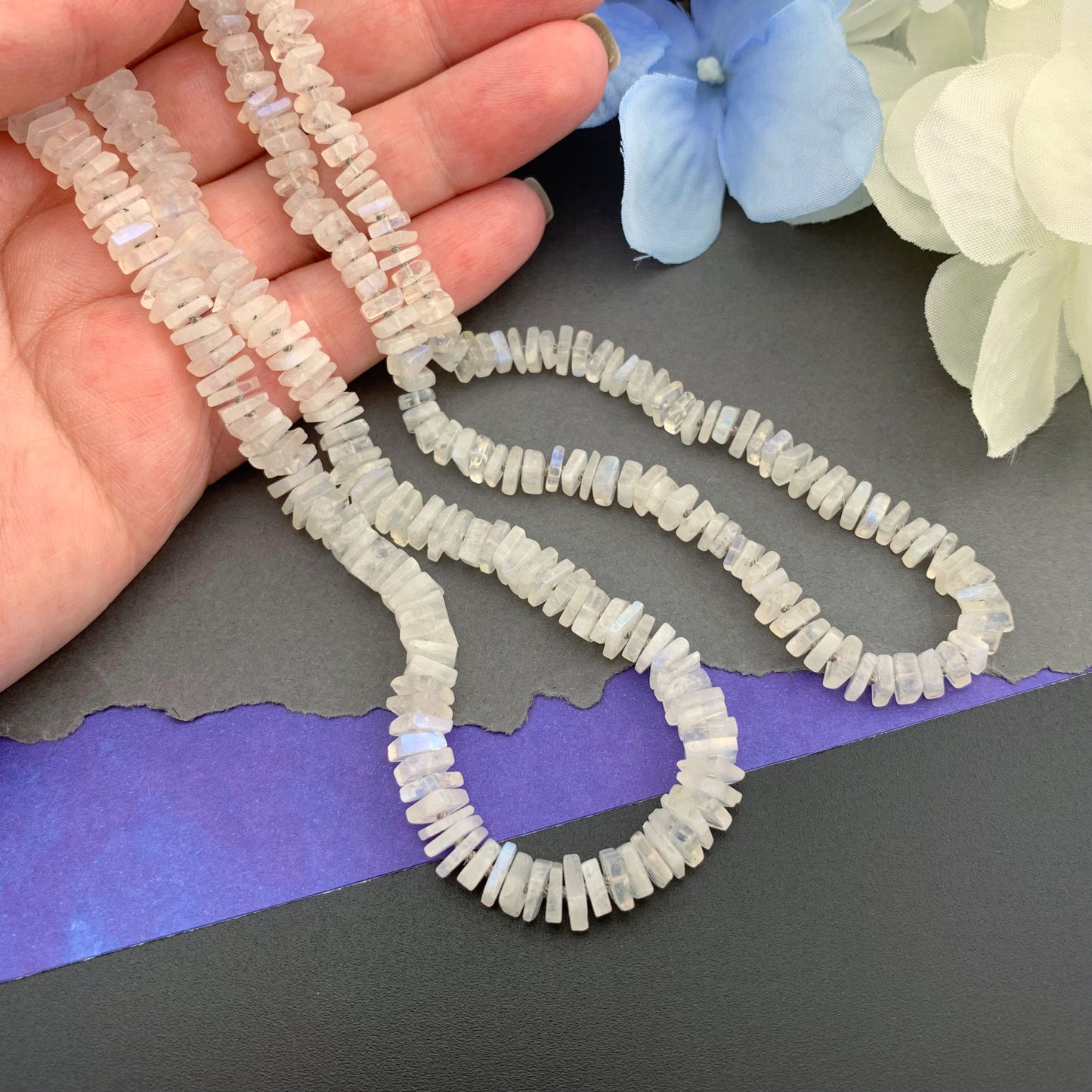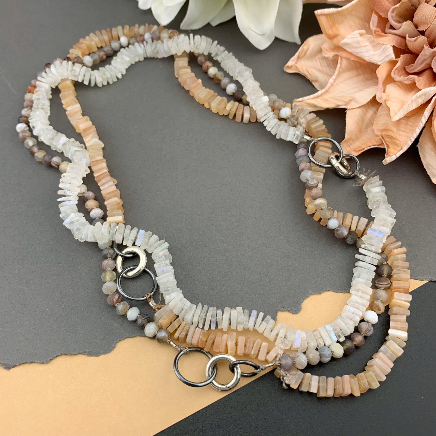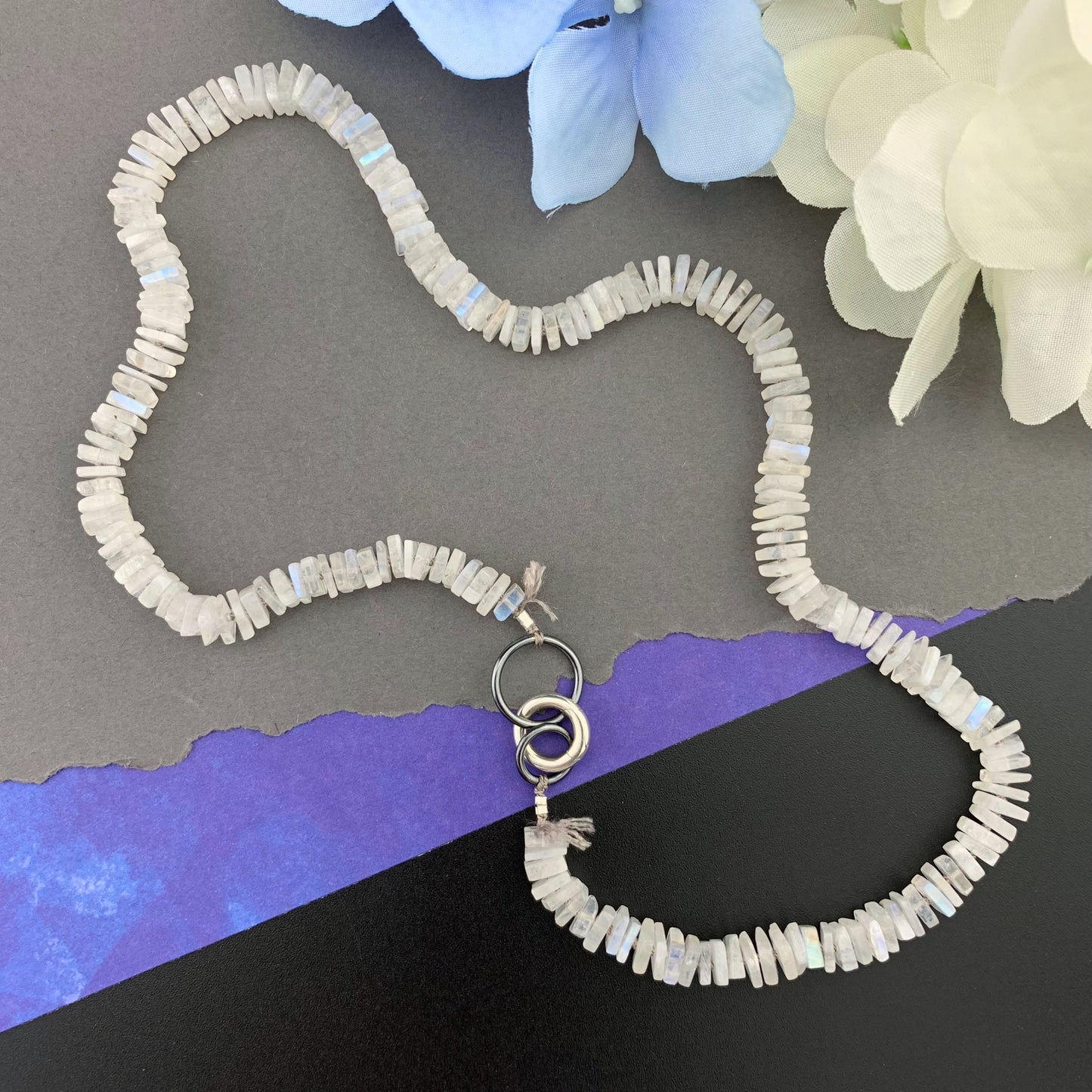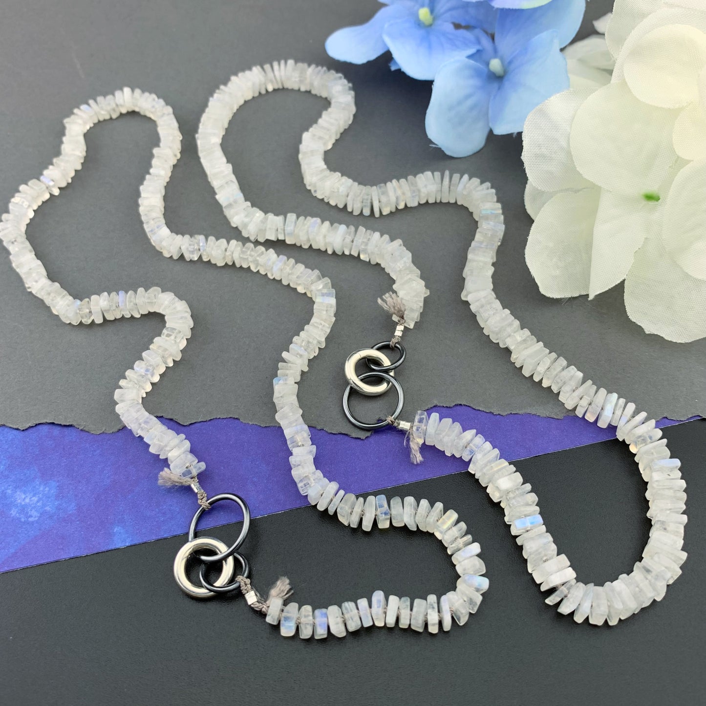 Square Moonstone Heishis are 5-6mm. Sterling Silver push clasp can be worn on either side, however it is comfortable for you to attach. Silk knotting provides a beautifully supple, luxurious drape, as you can see in the photos! This necklace is delicate enough to be worn layered with other Silk Knotted beauties; looks fabulous with the Botswanna Agate, Chevron Amethyst and Rose Quartz necklaces and is a perfect match to the Radiant Set in Moonstone!