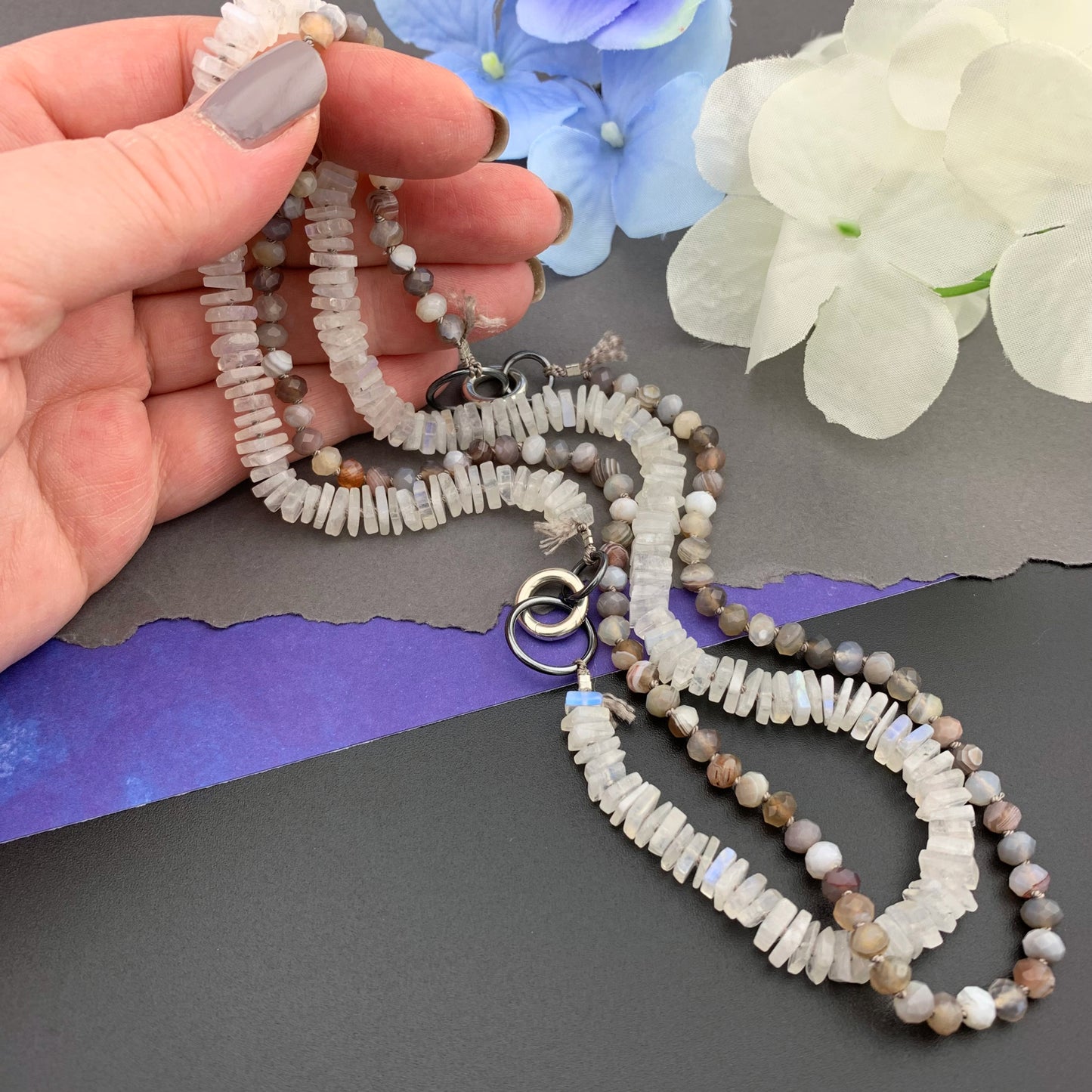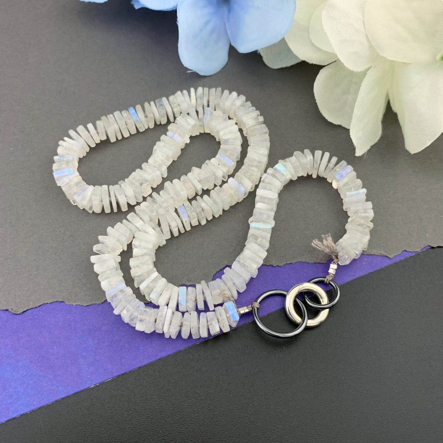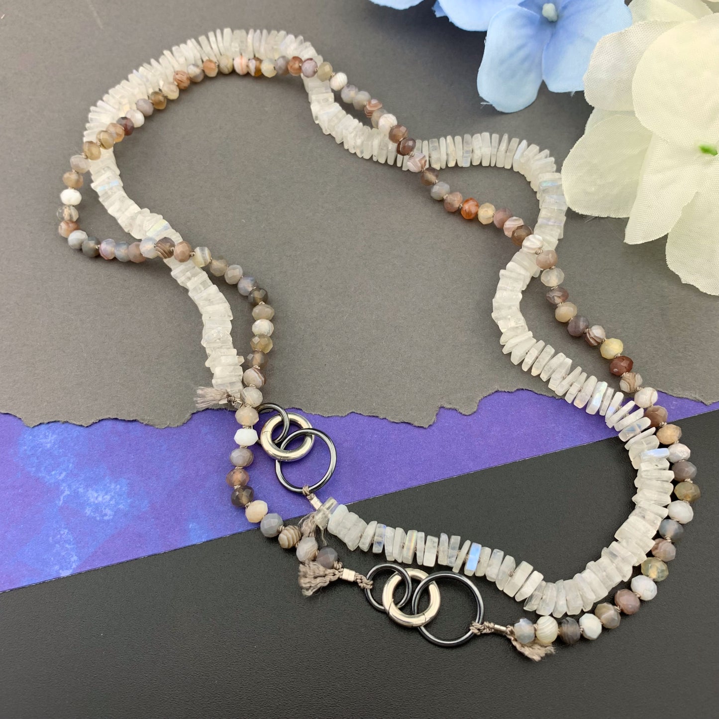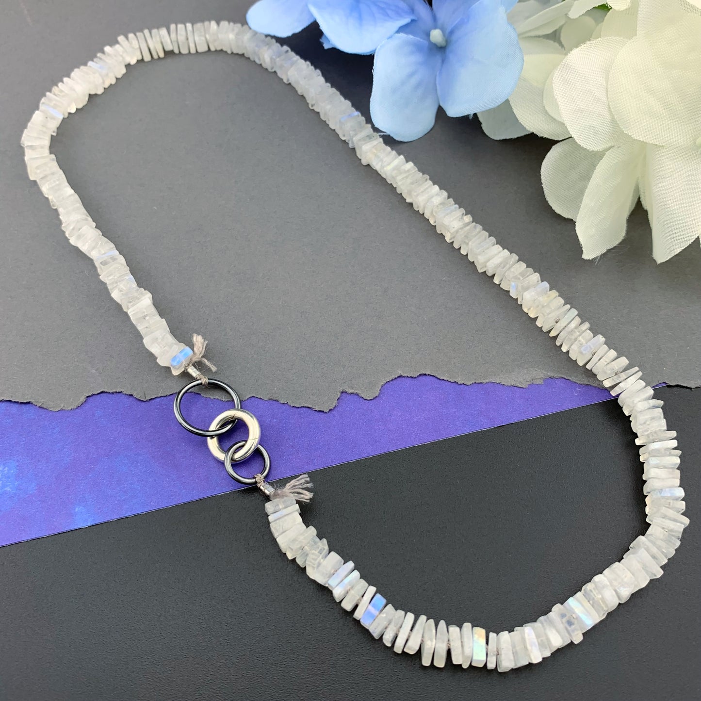 Rainbow Moonstone gemstones, in a very unique square shaped Heishi, are hand knotted on luxurious grey silk cord, knotted onto closed Oxidized Sterling Silver rings and crimped for extra security. Signature silk tassel is left at the clasp.