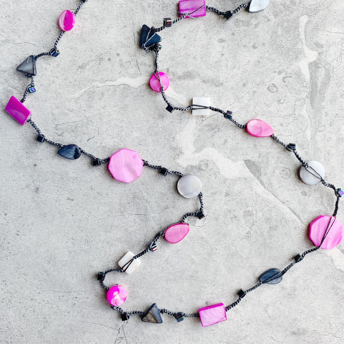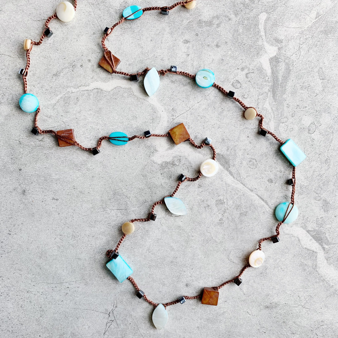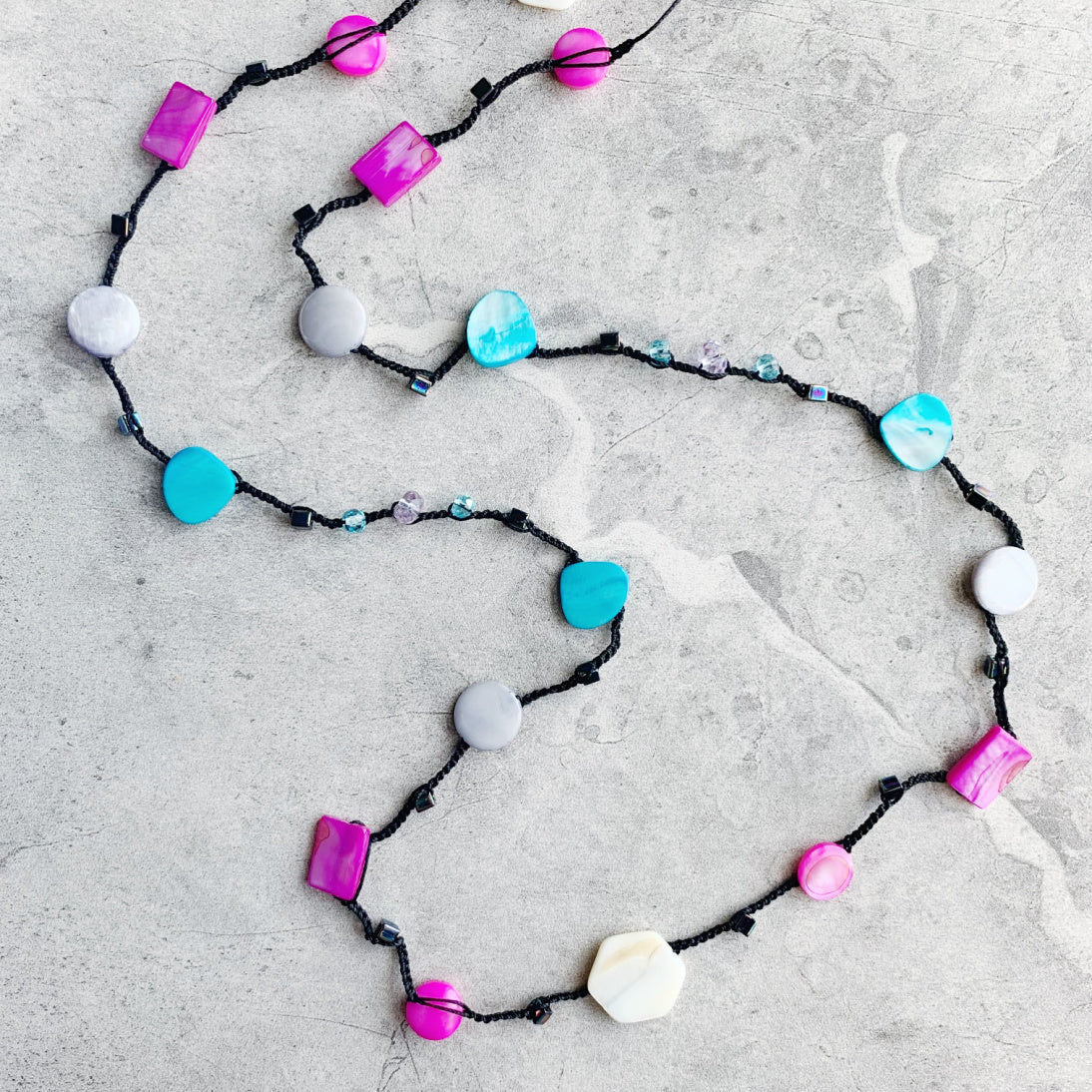 These supple necklaces are hand crocheted with luxurious silk thread, colorful Mother of Pearl shell beads, Czech glass rondelles and Miyuki square beads. Several stitches separate the beads, to allow the colorful silk to shine through. Silk is knotted onto closed Sterling Silver rings and crimped for extra security. Sterling Silver lobster clasp and 2" extender chain.