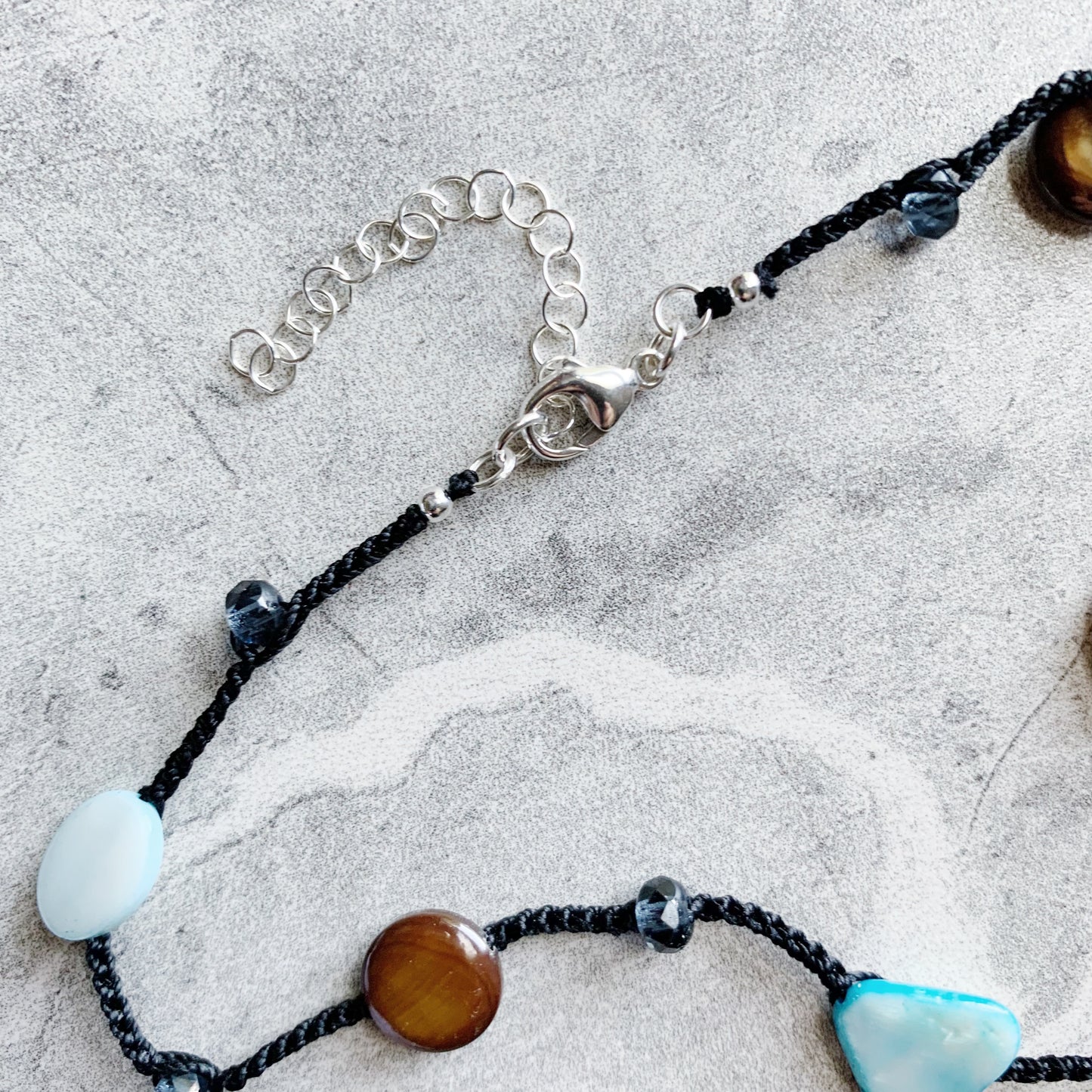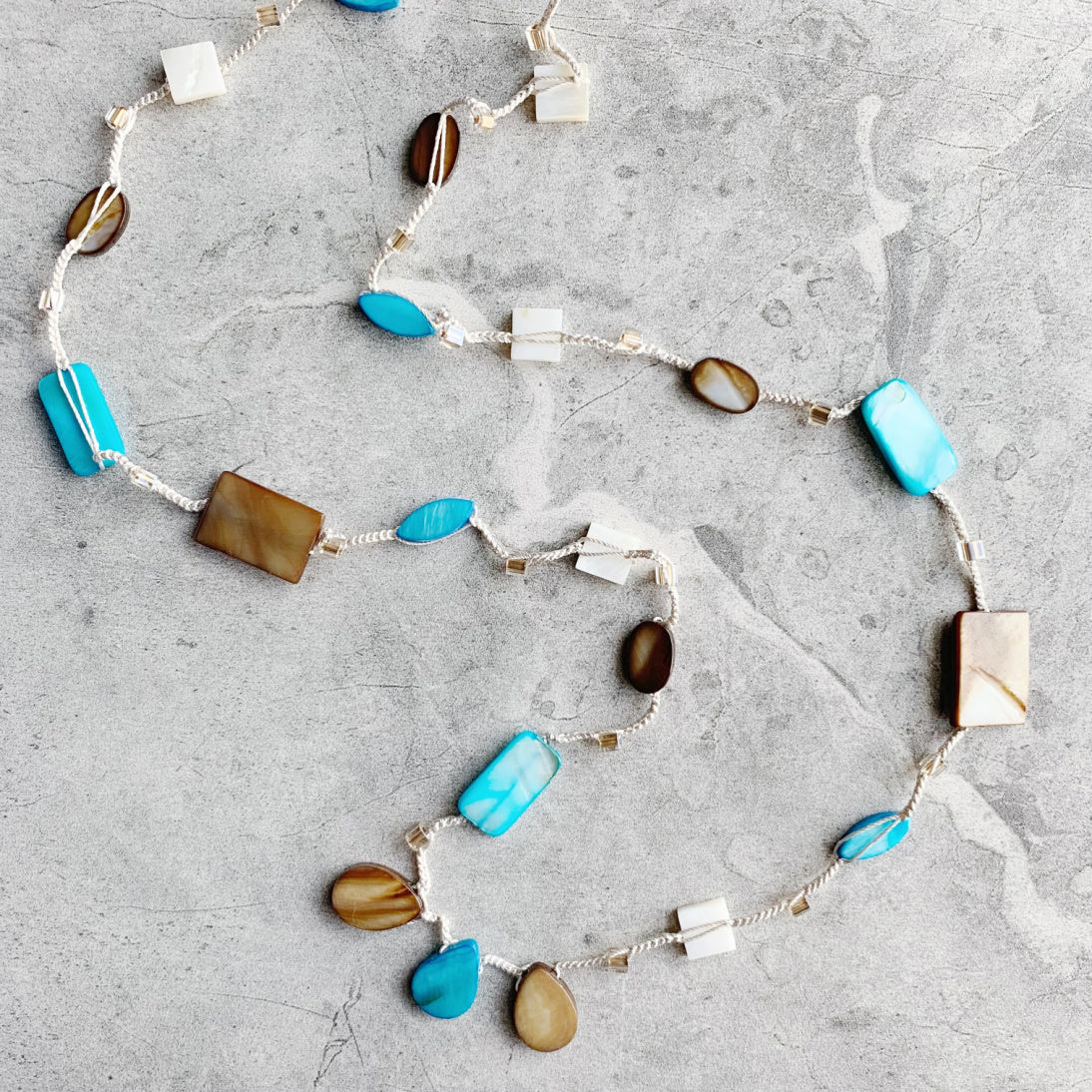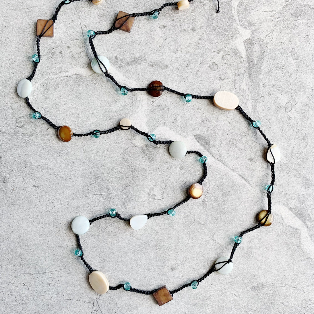 These supple necklaces are hand crocheted with luxurious silk thread, colorful Mother of Pearl shell beads, Czech glass rondelles and Miyuki square beads. Several stitches separate the beads, to allow the colorful silk to shine through. Silk is knotted onto closed Sterling Silver rings and crimped for extra security. Sterling Silver lobster clasp and 2" extender chain.