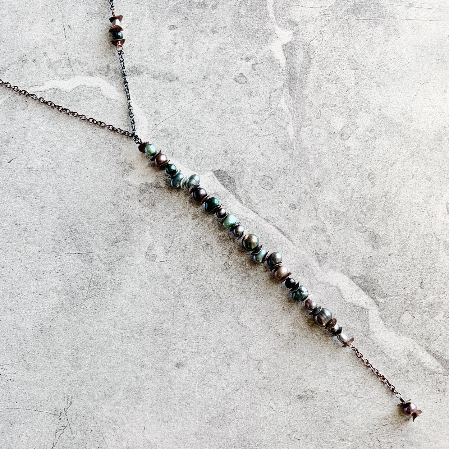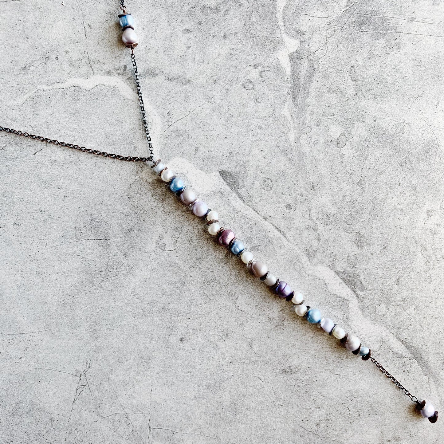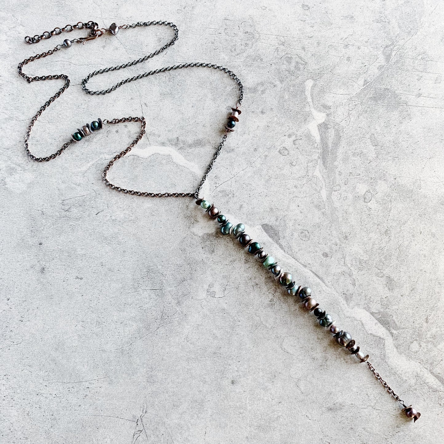 Long Y drop necklace features mixed metals of Copper and Sterling Silver and a mix of colorful Freshwater Pearls, surrounded by 6mm wavy discs in Oxidized Copper, Bright and Oxidized Sterling Silver. Hook clasp closure.