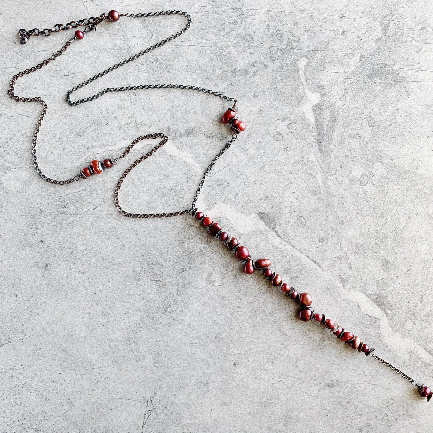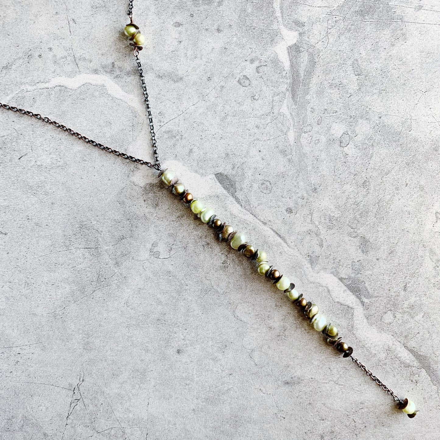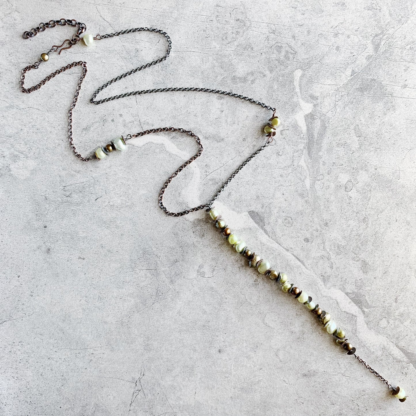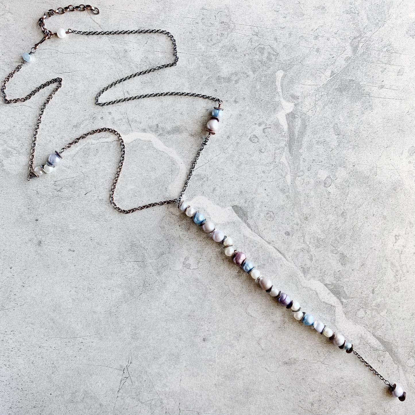 Long Y drop necklace features mixed metals of Copper and Sterling Silver and a mix of colorful Freshwater Pearls, surrounded by 6mm wavy discs in Oxidized Copper, Bright and Oxidized Sterling Silver. Hook clasp closure.