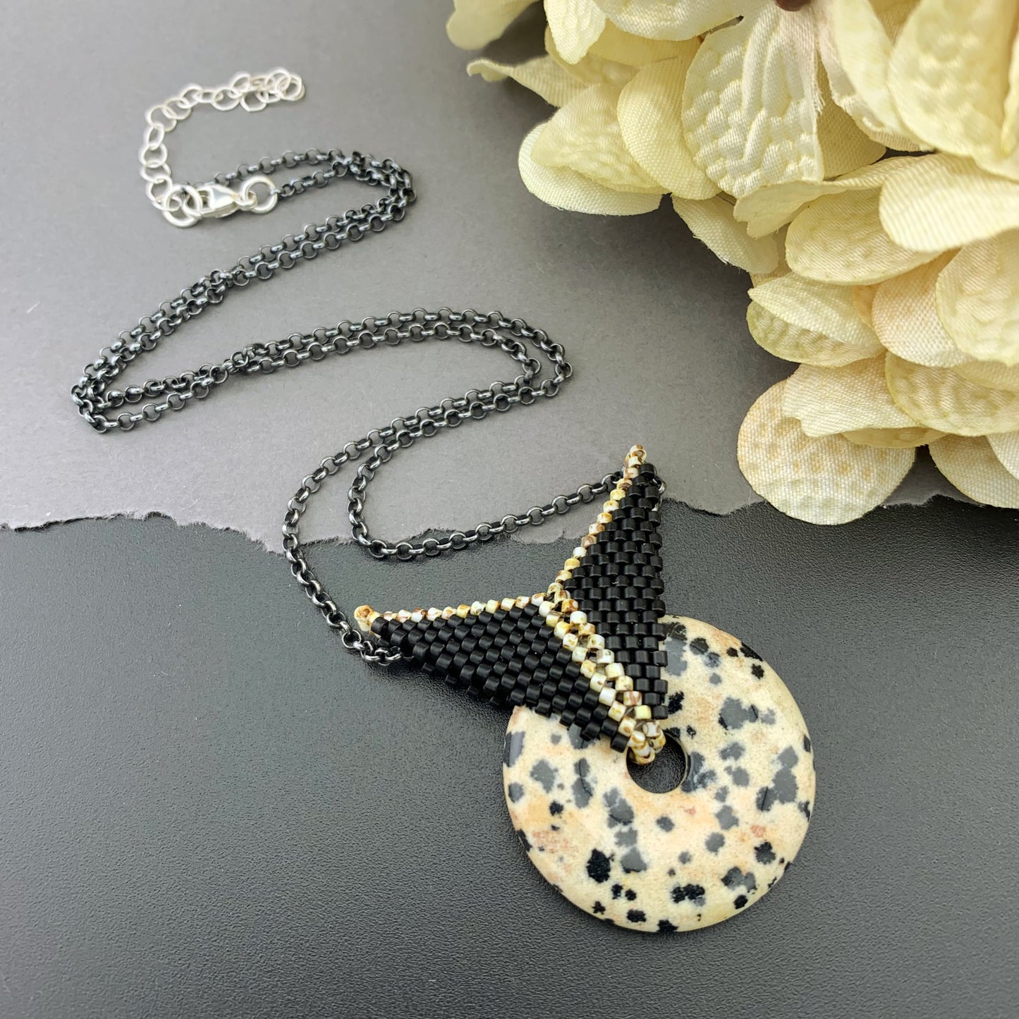 Enjoy 10% off when you buy the set: Natural Dalmatian Jasper gemstone pendant is suspended from Oxidized Sterling Silver chain by a hand stitched beaded bail combining Herringbone and Peyote stitch techniques in petite Miyuki Delica beads.