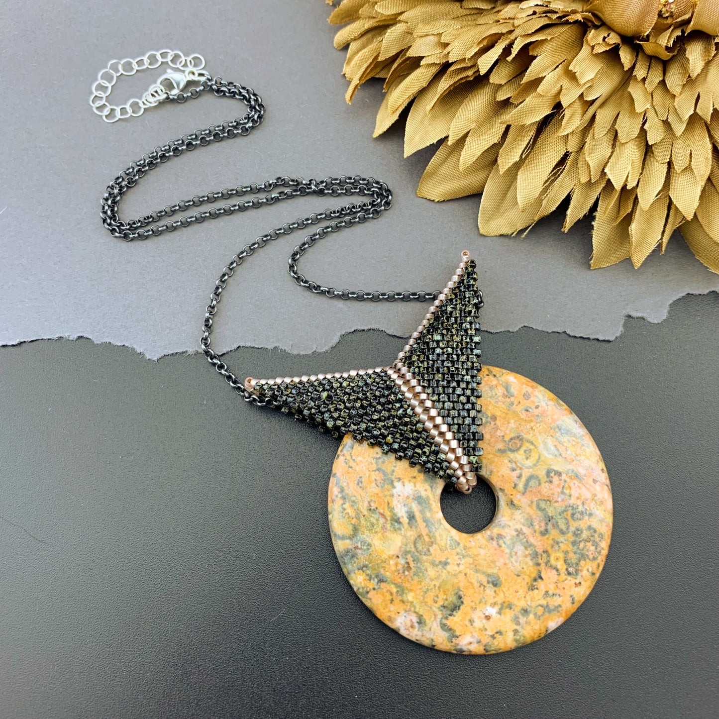Enjoy 10% off when you buy the set: Natural Leopardskin Jasper gemstone pendant is suspended from Oxidized Sterling Silver chain by a hand stitched beaded bail combining Herringbone and Peyote stitch techniques in petite Miyuki Delica beads.