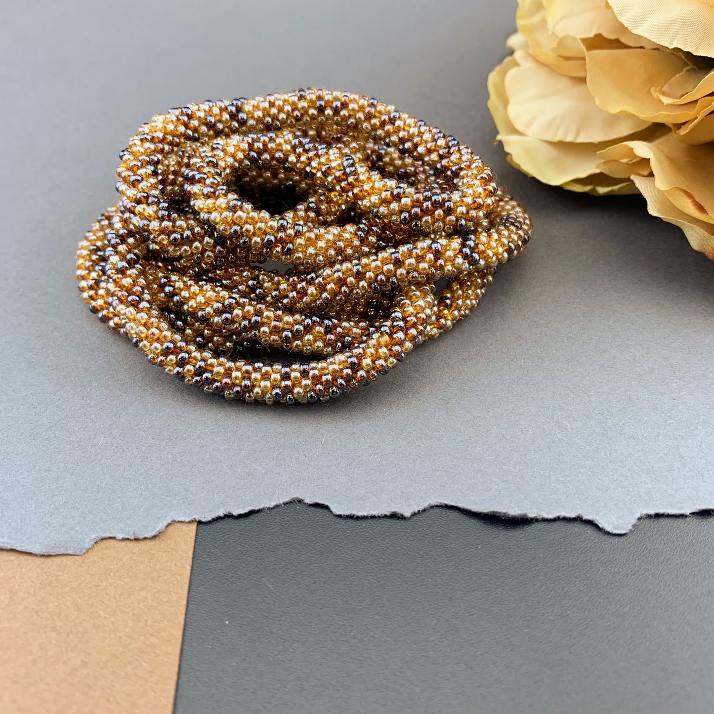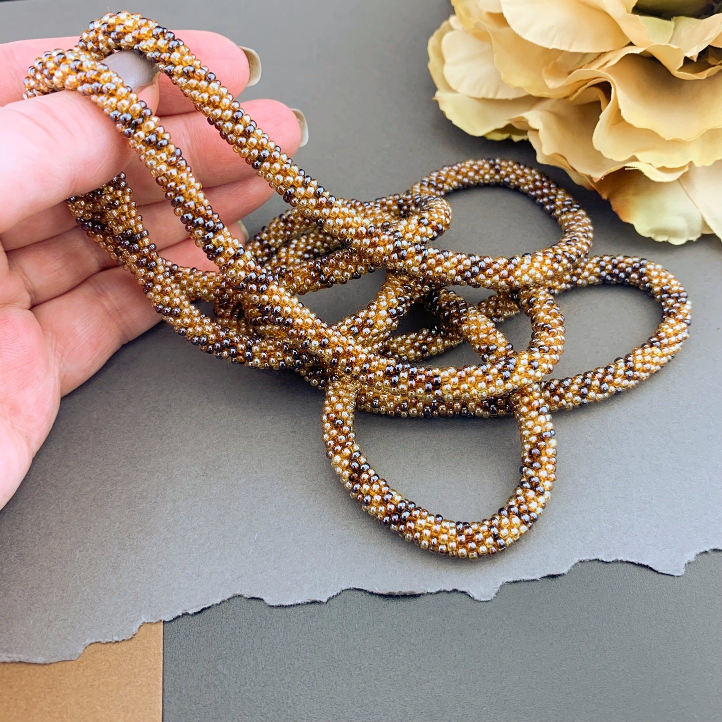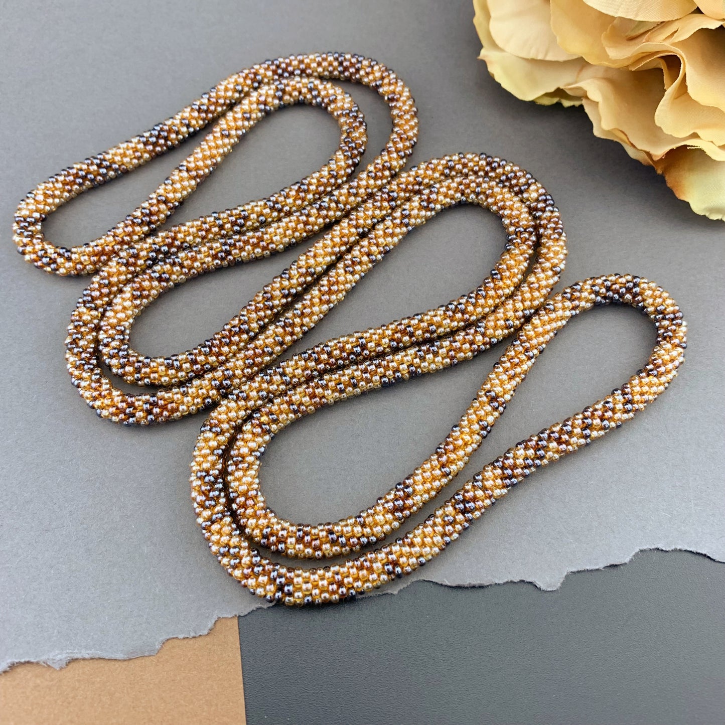 Soft, supple, luxurious beaded crochet rope necklace is hand crocheted with Czech glass 10/0 seed beads; a mix of shimmering topaz browns in an abstract pattern. Ends are sewn together creating a "seamless join". They are continuous with no clasp. Beautiful heirloom pieces that will be passed on for generations!