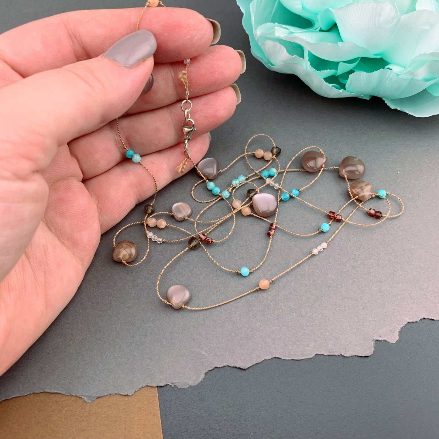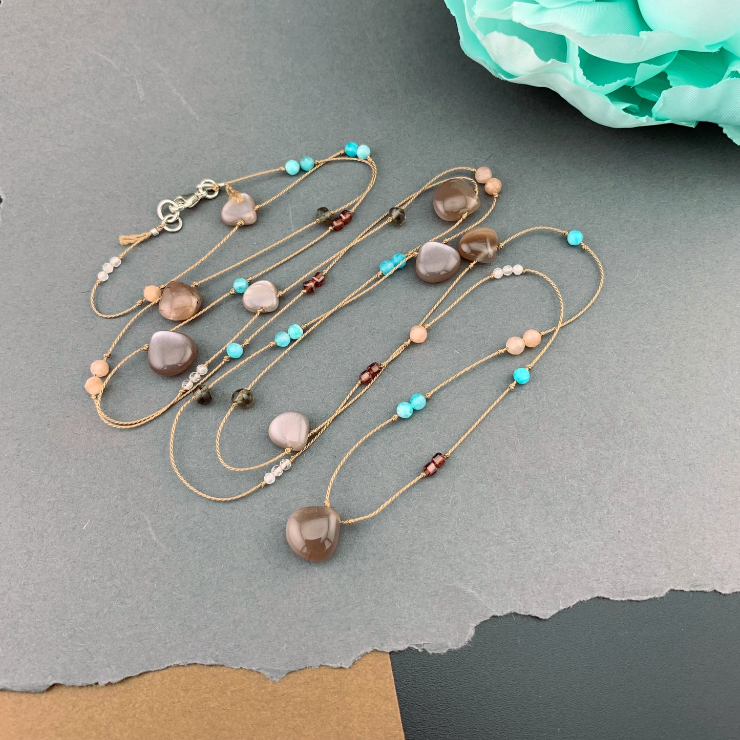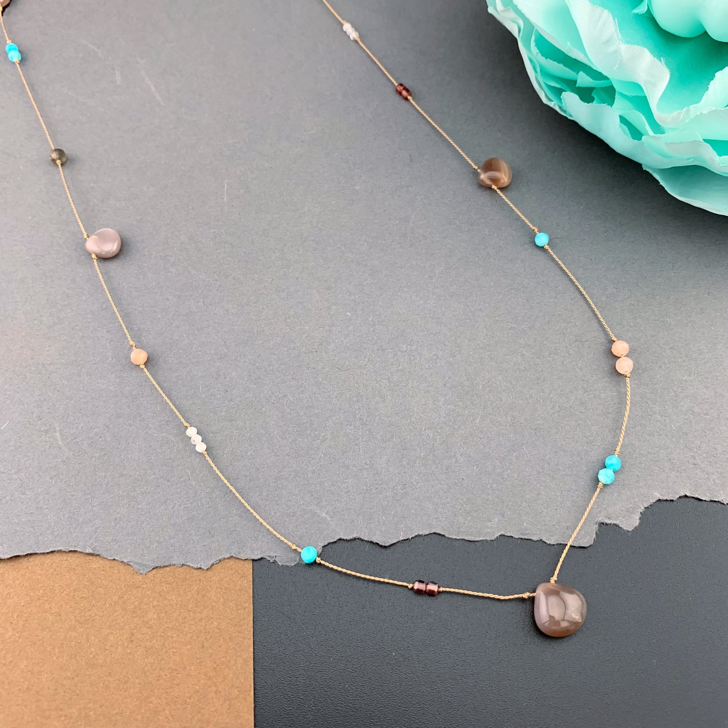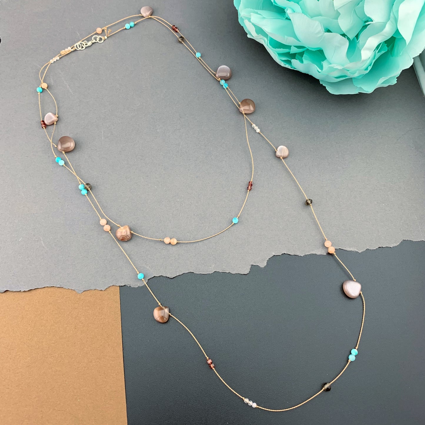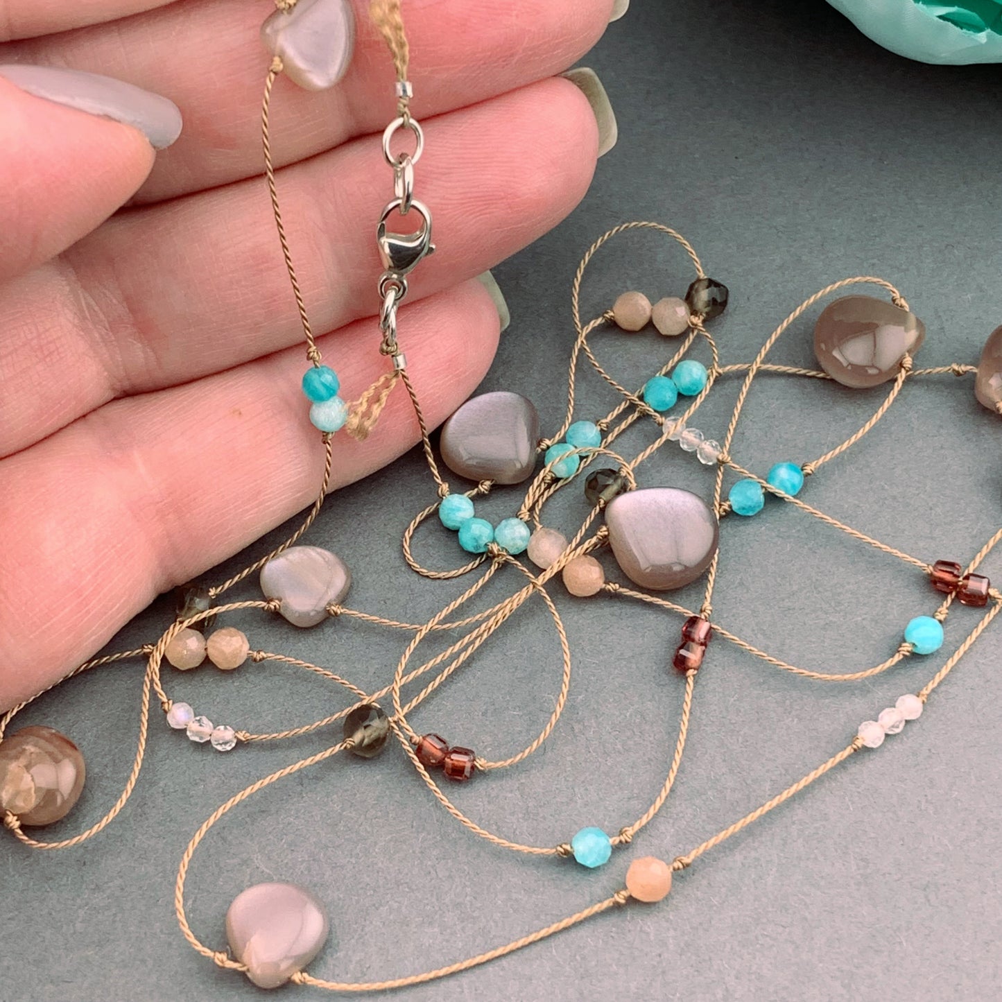 One Of A Kind Radiant Layering Necklace - Chocolate Moonstone, Garnet, Peach Moonstone, Rainbow Moonstone, Smokey Quartz, Amazonite