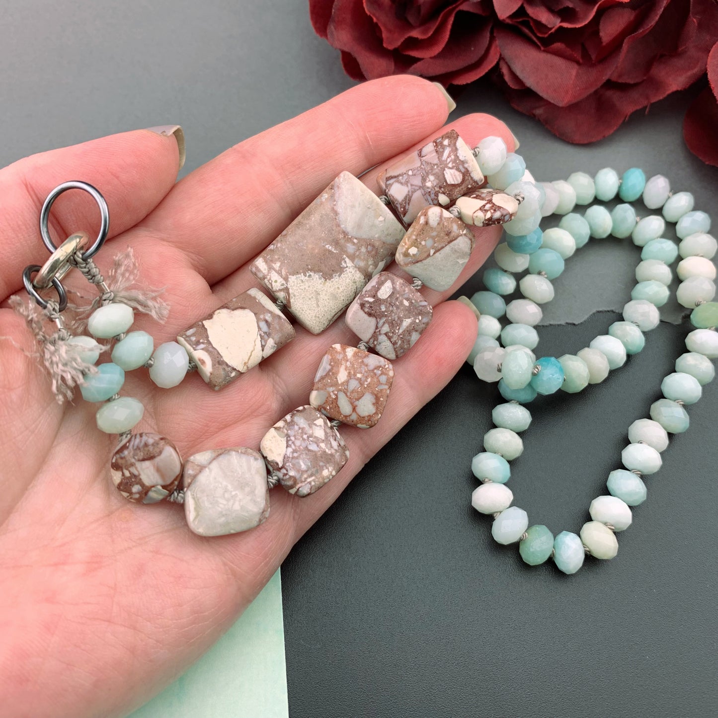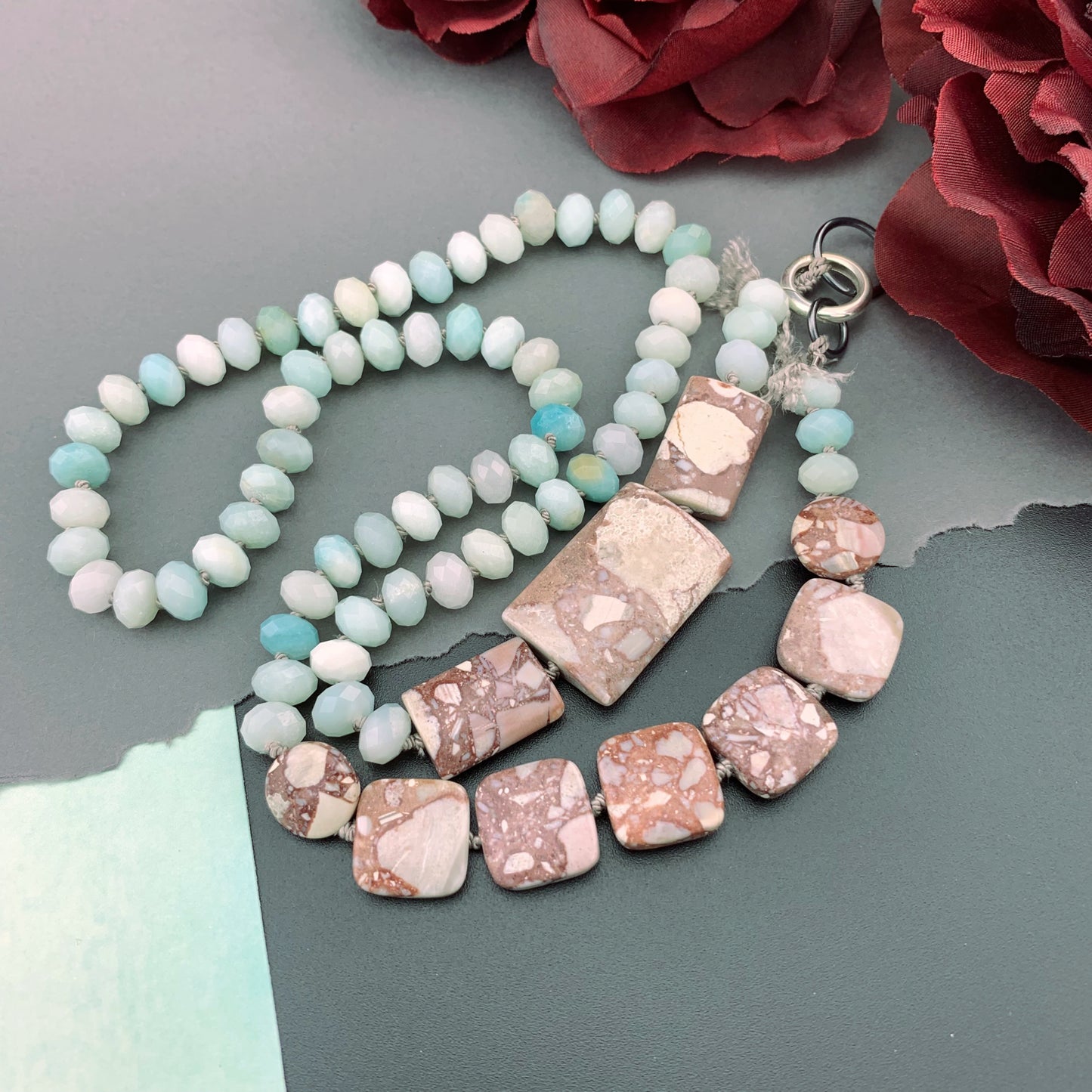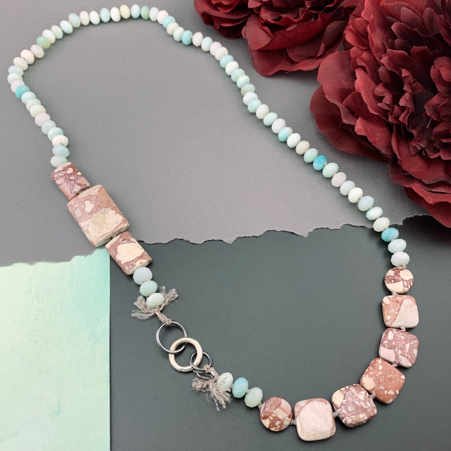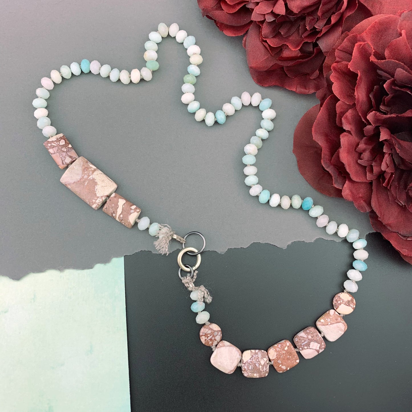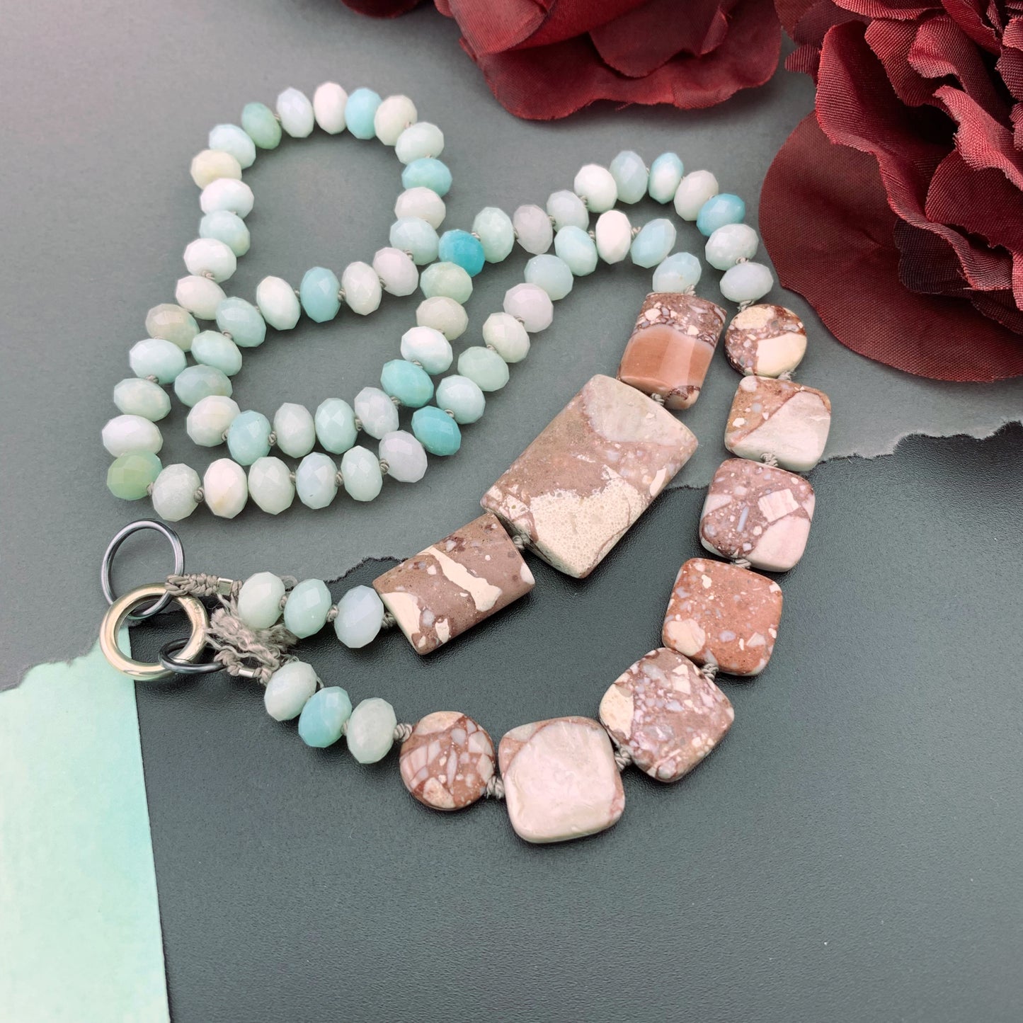 One Of A Kind Silk Knotted Amazonite and Jasper Gemstone Candy Necklace