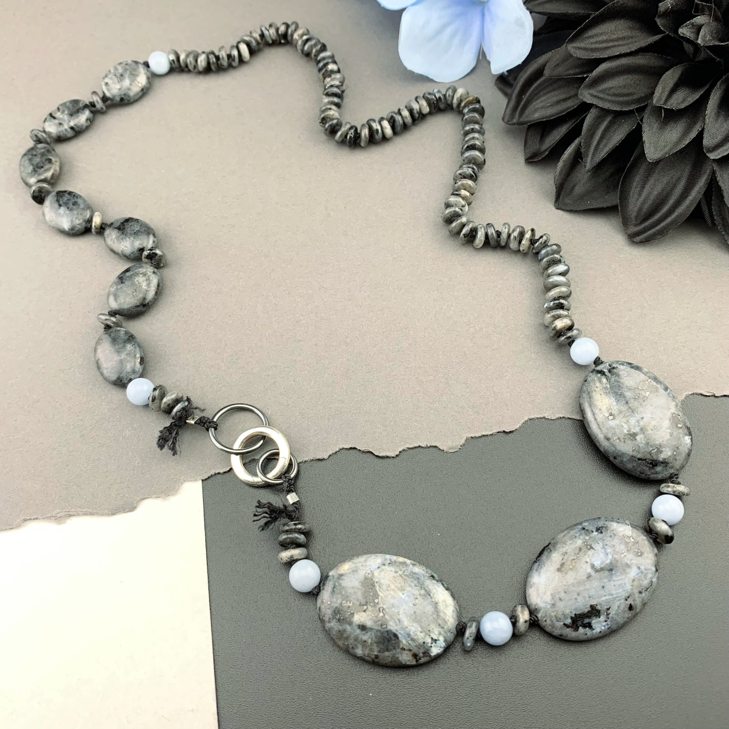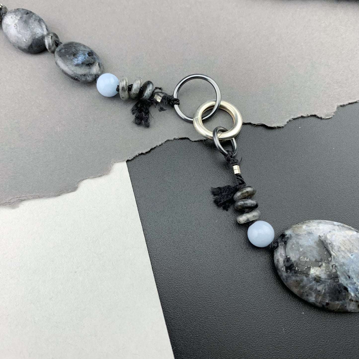 Add One Of A Kind Silk Knotted Black Labradorite and Angelite Gemstone Candy Necklace to the cart