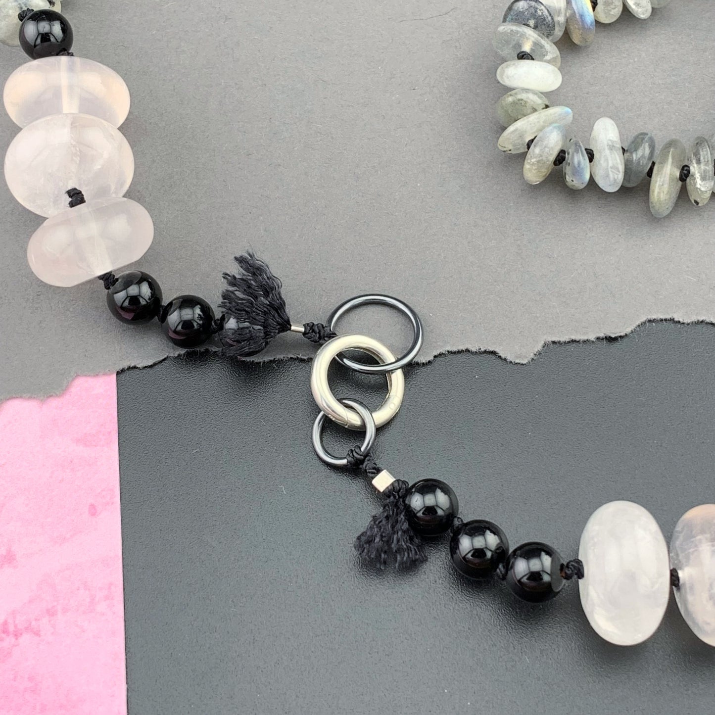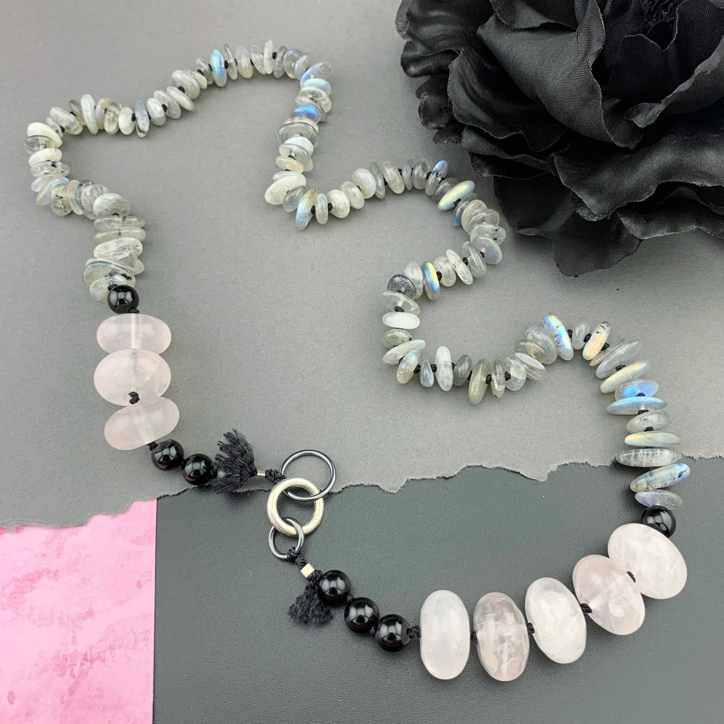 Add One Of A Kind Silk Knotted Labradorite, Rose Quartz and Black Tourmaline Gemstone Candy Necklace to the cart