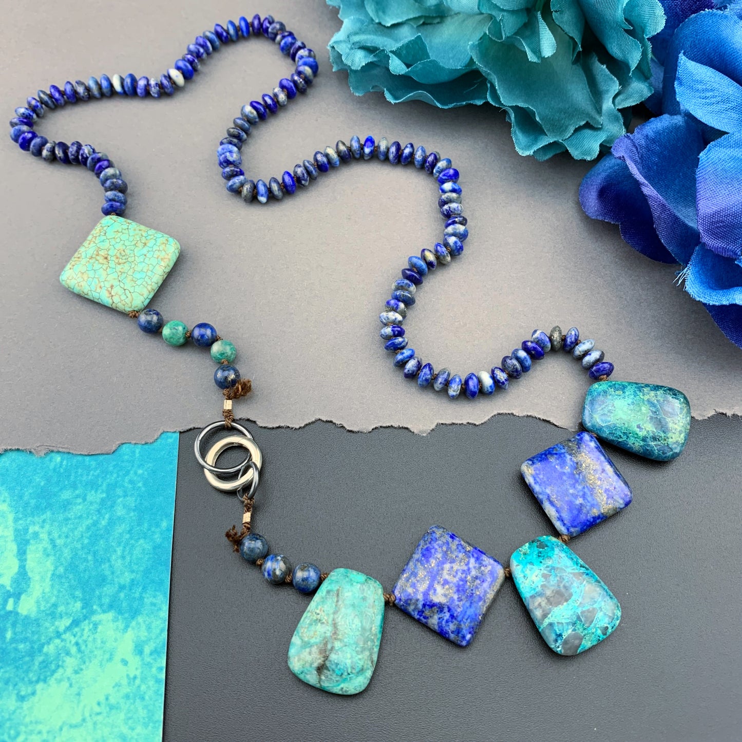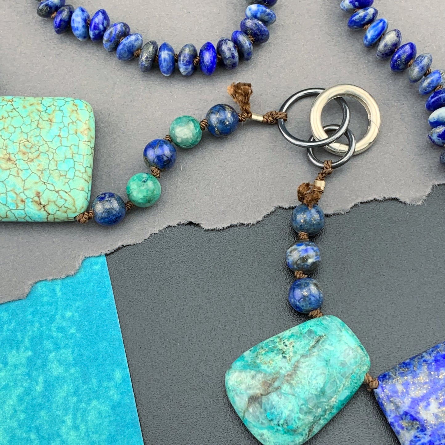 Add One Of A Kind Silk Knotted Lapis Lazuli, Chrysocolla and Turquoise Gemstone Candy Necklace to the cart