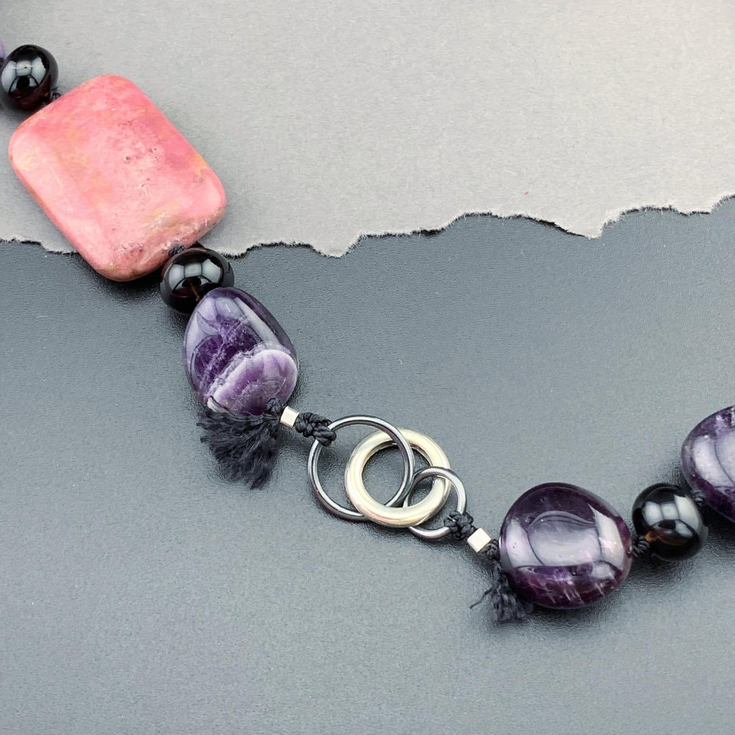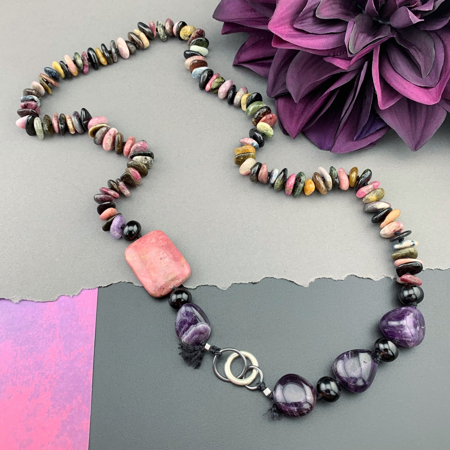 Add One Of A Kind Silk Knotted Tourmaline, Amethyst, Smokey Quartz and Rhodonite Gemstone Candy Necklace to the cart
