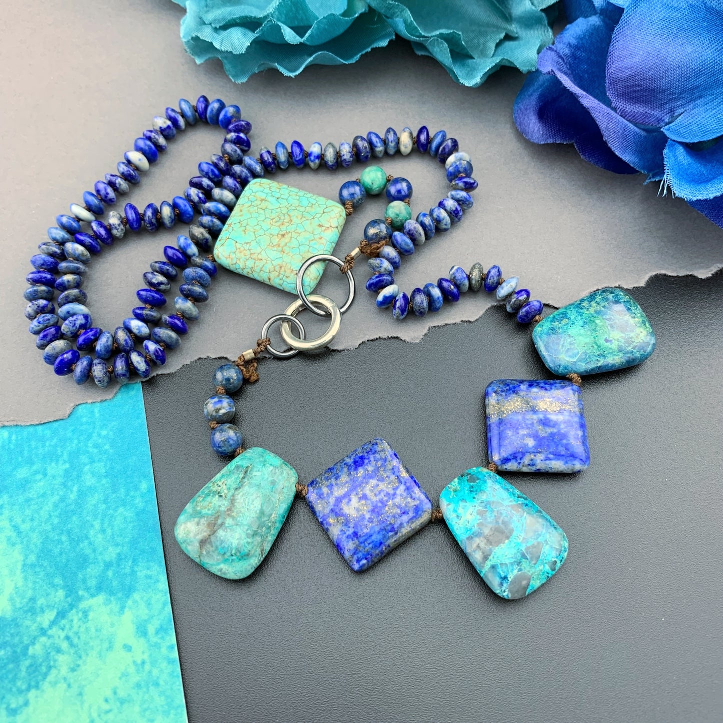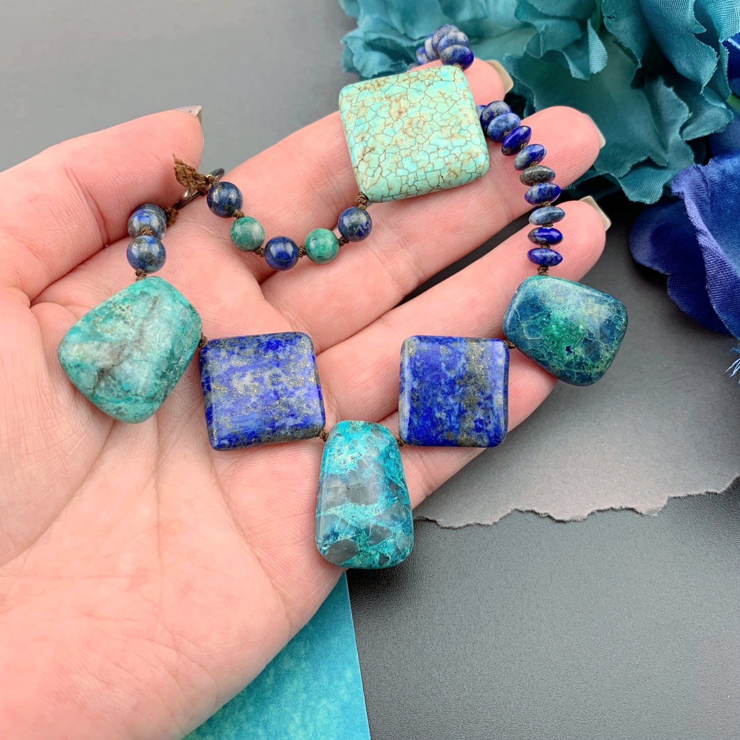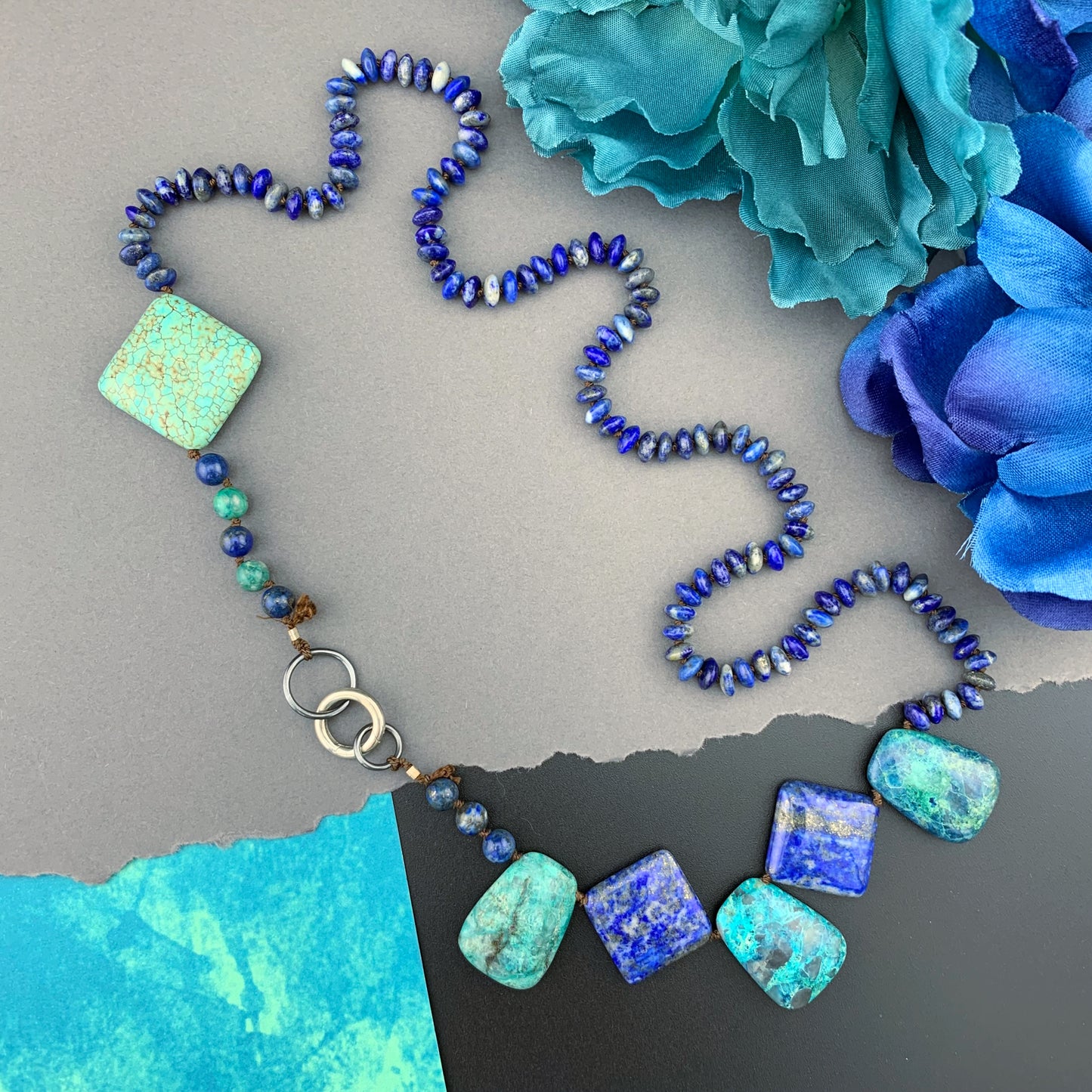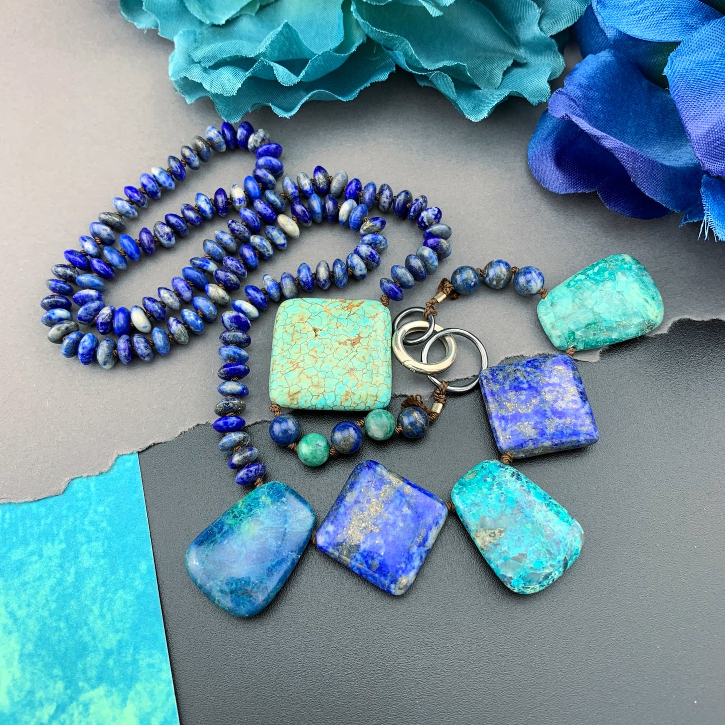 One Of A Kind Silk Knotted Lapis Lazuli, Chrysocolla and Turquoise Gemstone Candy Necklace