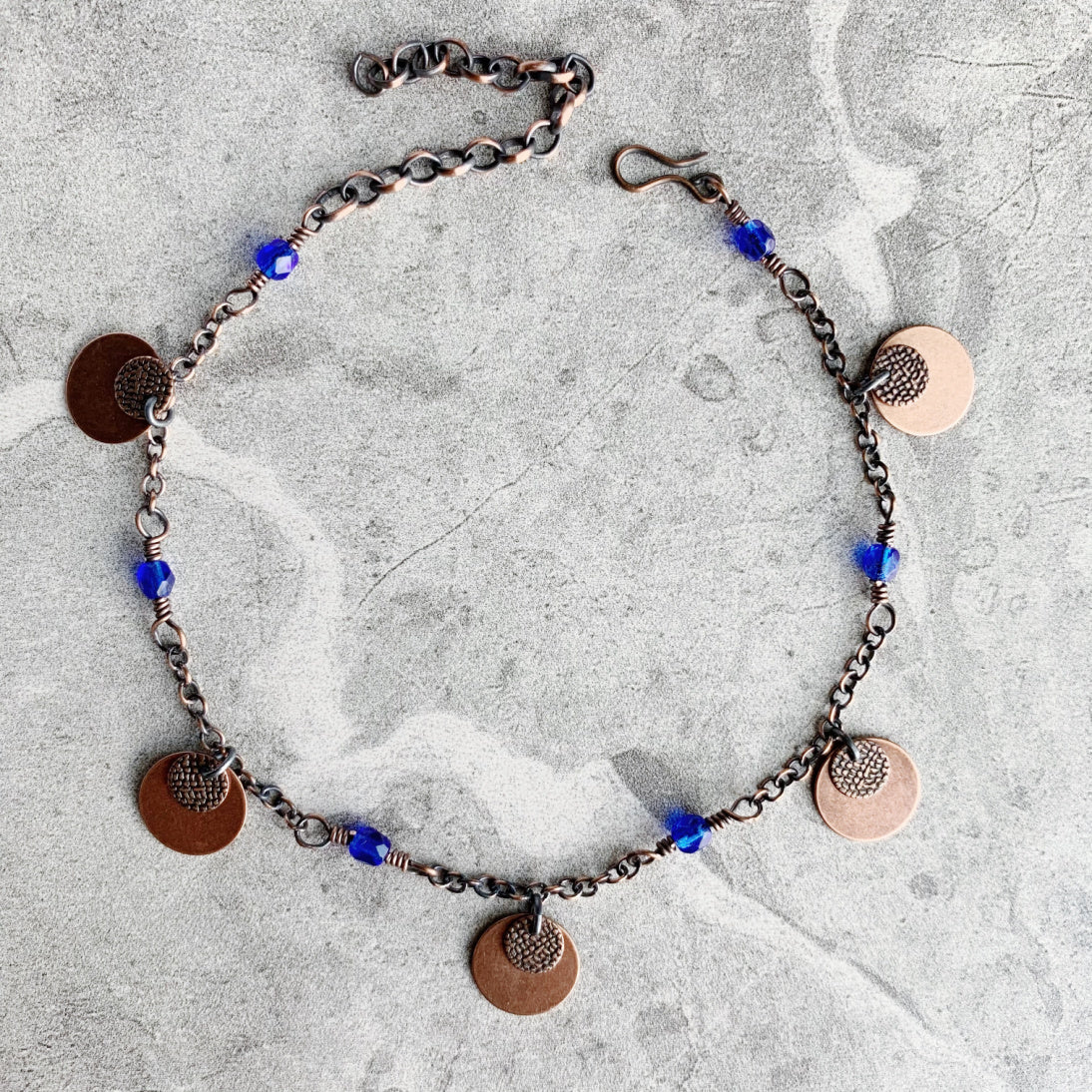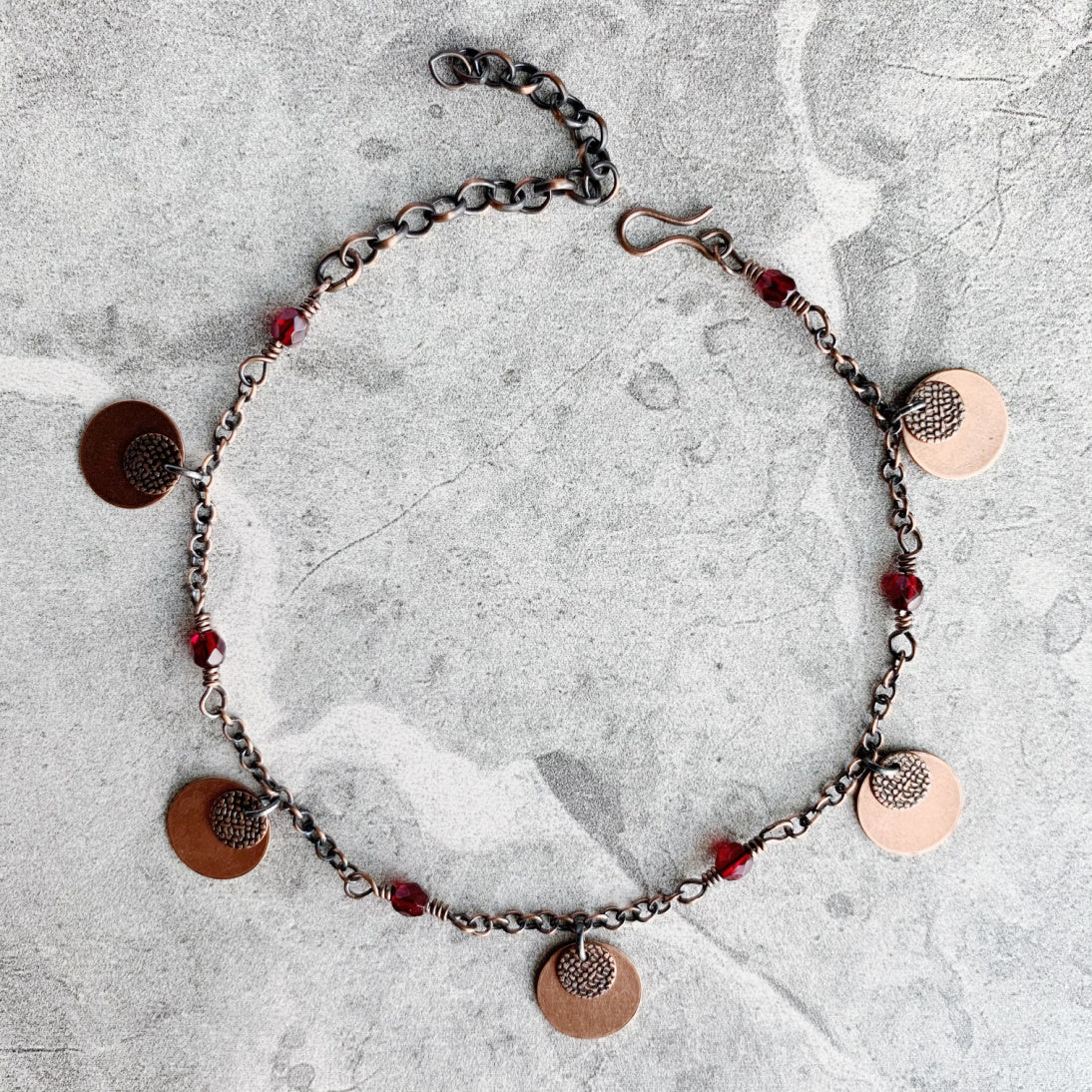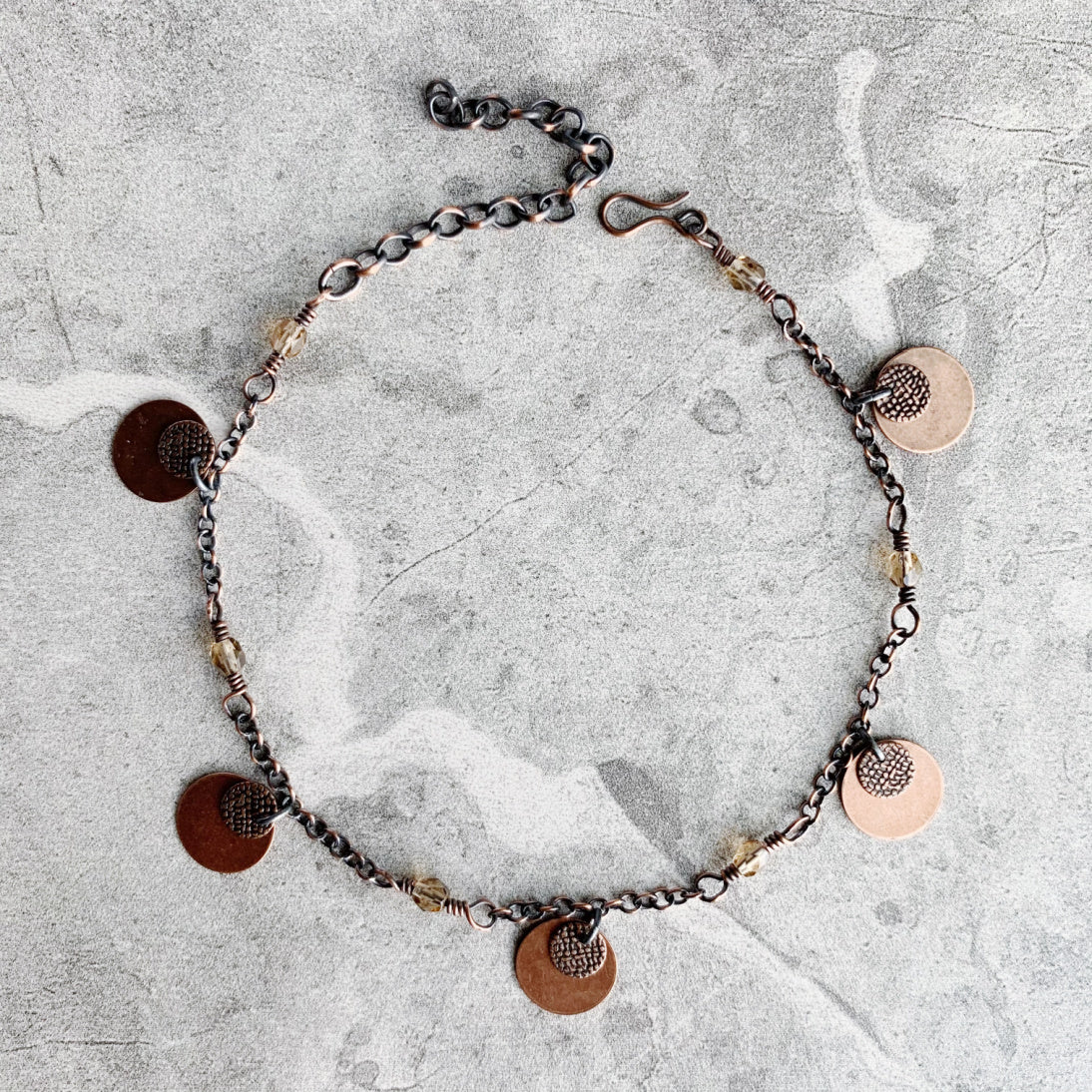 This delicate anklet features wire wrapped Czech glass beads with steel coin dangles that "dance" slightly as you walk. Hook clasp closure.