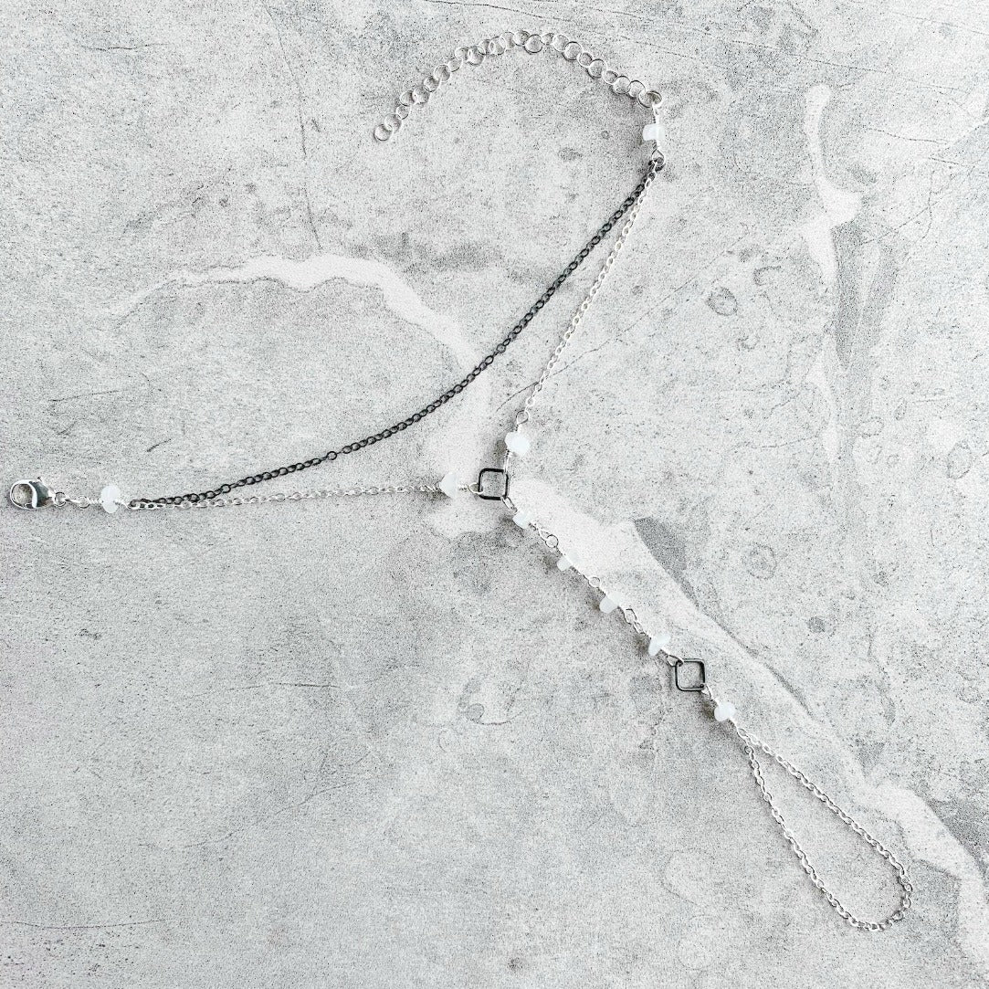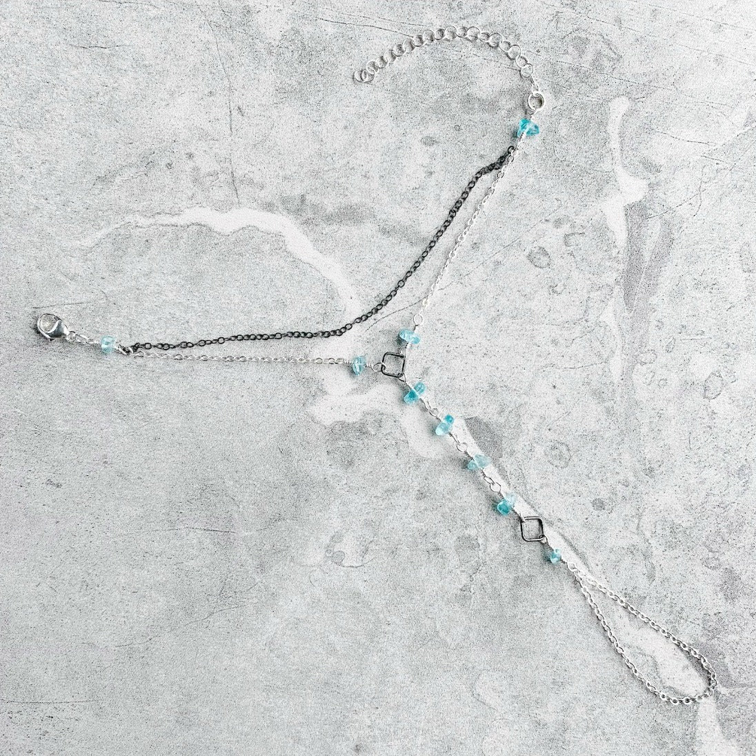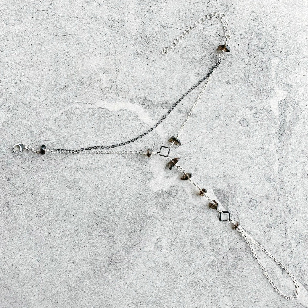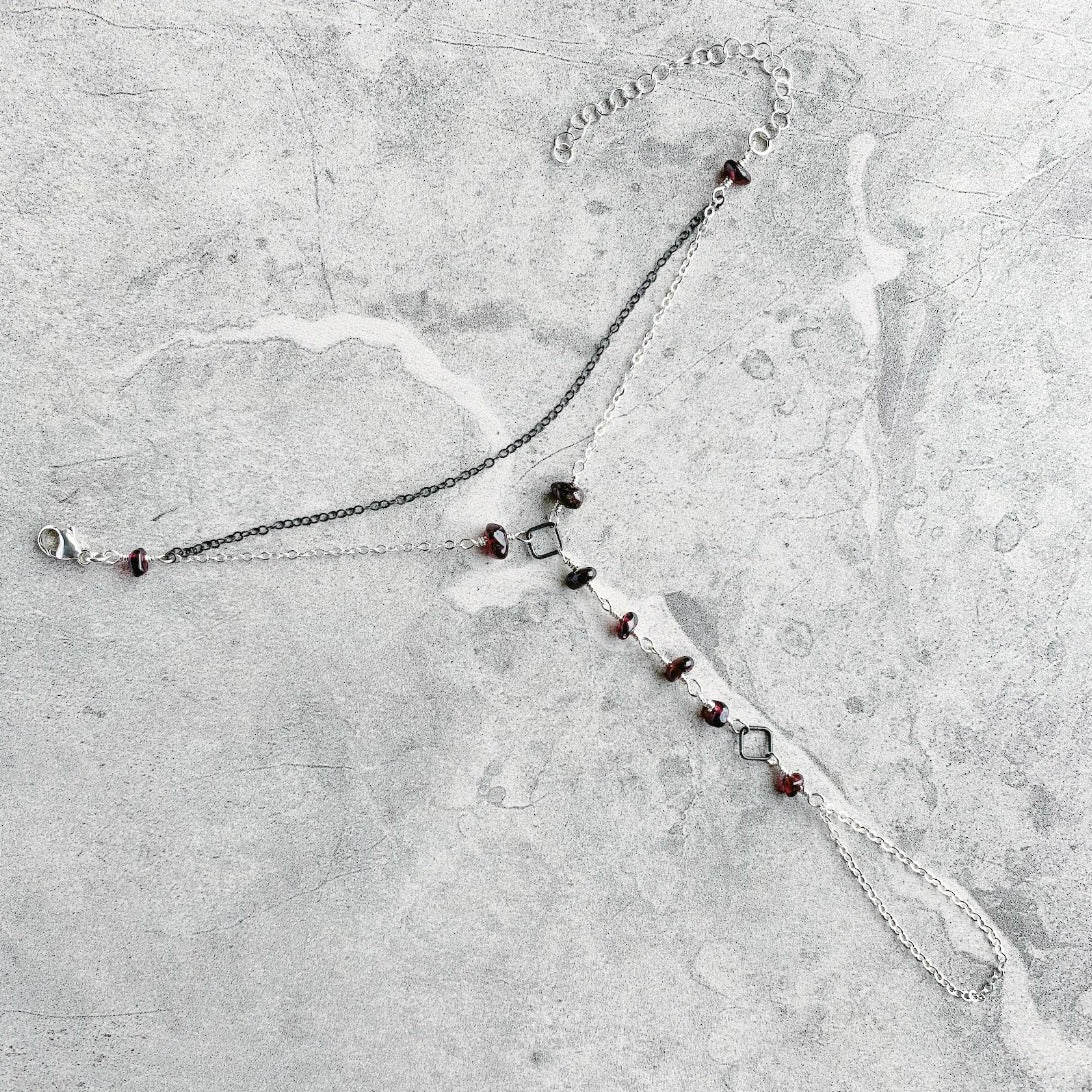 Hand pieces (or ring-bracelets) are so beautiful as they drape down your hand. This delicate piece features petite oxidized Sterling squares with an elegant trail of individually wrapped chips extending down to the ring loop, bright and oxidized Sterling Silver 1.7mm oval cable chain. Lobster clasp closure.