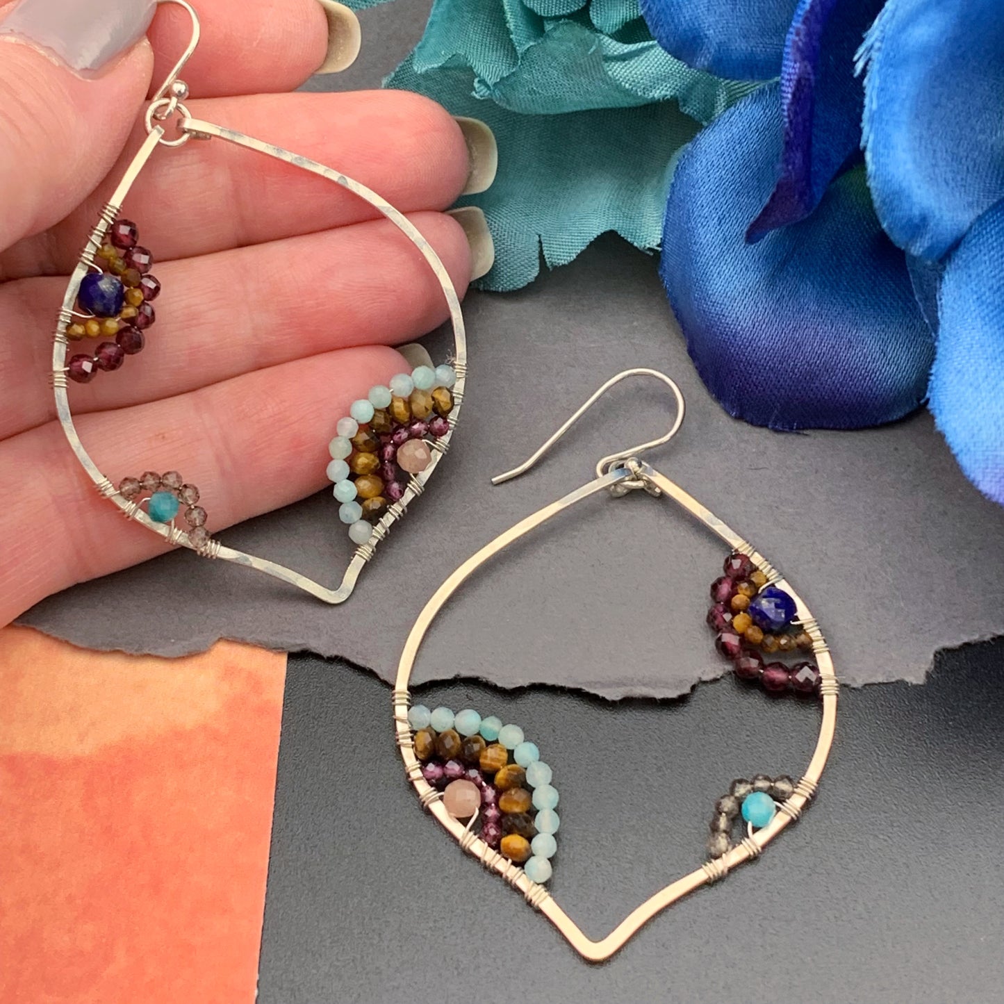 Earrings are created by hand; hammered Sterling Silver petal shaped hoops, wire wrapped with petite faceted gemstones. Sterling Silver ear wires. Gorgeous sparkle from the hammered texture and faceted gemstones catch the light beautifully! Gemstones: Smokey Quartz, Lapis Lazuli, Garnet, Tiger's Eye, Amazonite and Peach Moonstone.