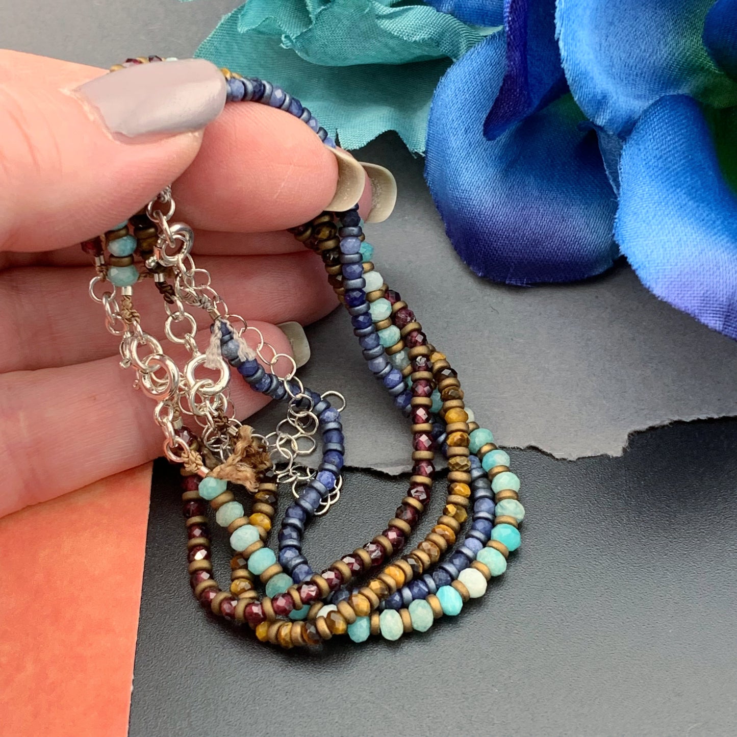 Bracelets are a set of 4 complementing faceted gemstones, hand strung on luxurious silk cord with Miyuki glass spacer beads, knotted & crimped onto closed rings for extra security, signature silk tassel is left at the clasp. Sterling Silver spring ring clasp and extender chain. These bracelets have a very supple drape, they just melt onto the wrist! Gemstones: Amazonite, Tiger's Eye, Garnet and Sodalite.