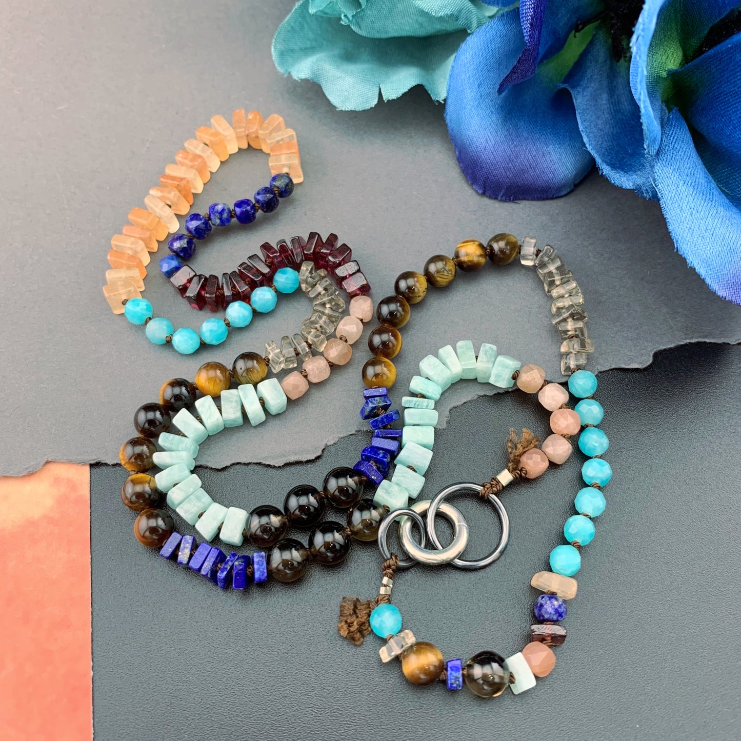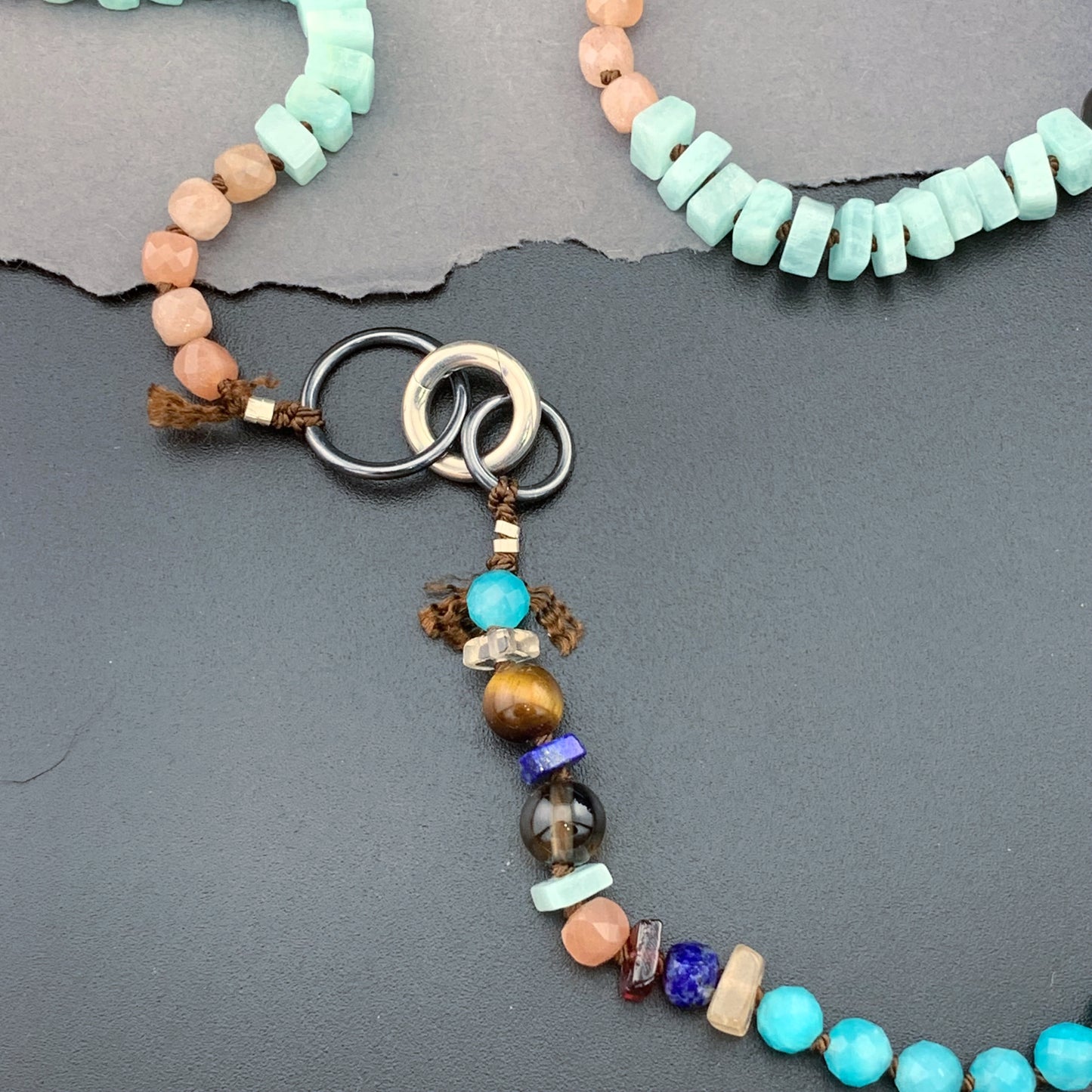 Layering necklace is a beautiful mixture of different shapes of gemstones, both smooth and faceted, in Smokey Quartz, Amazonite, Tiger's Eye, Lapis Lazuli, Peach Moonstone and Garnet. Hand knotted on luxurious silk cord, knotted & crimped onto oxidized Sterling rings for extra security, signature silk tassel is left at the rings. Sterling Silver push clasp. Length of approx. 26". Such a versatile style, clasp is meant to be seen and can be placed anywhere to change which gemstones are seen! Also a very cool idea is to attach/combine this necklace with its complimenting Square Heishi necklace via the push clasps, to create a 44" piece that can be doubled!